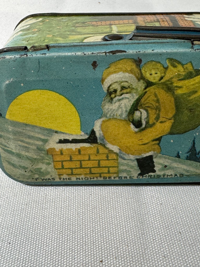 Santa claus tin 2 1/4" tall 4 5/8" long and 2 5/8" deep. All kinds of goodies probably came in this one.