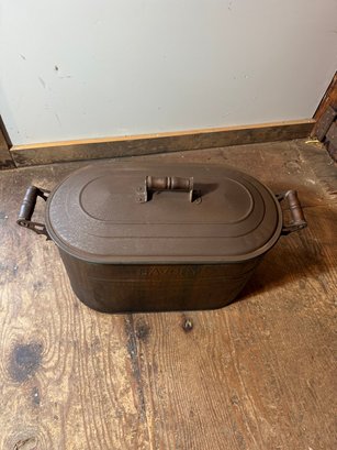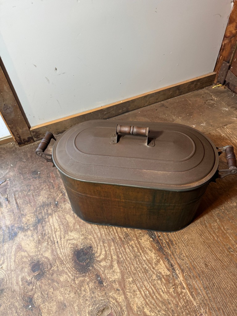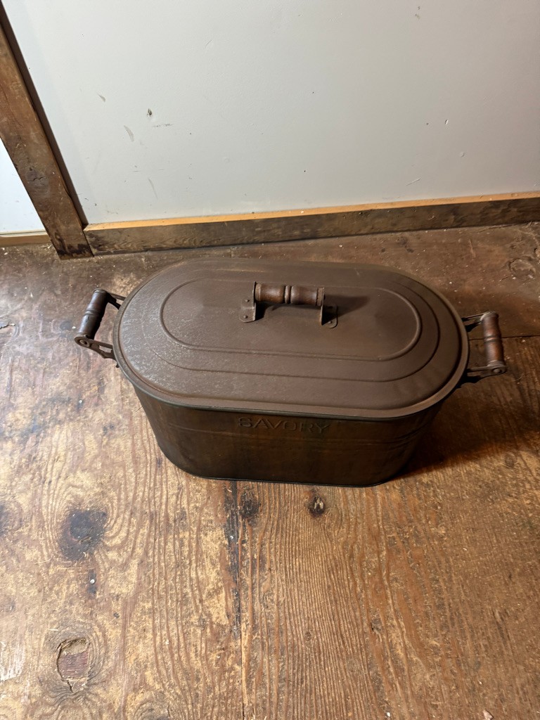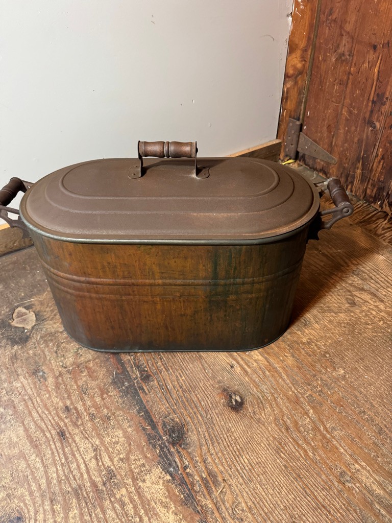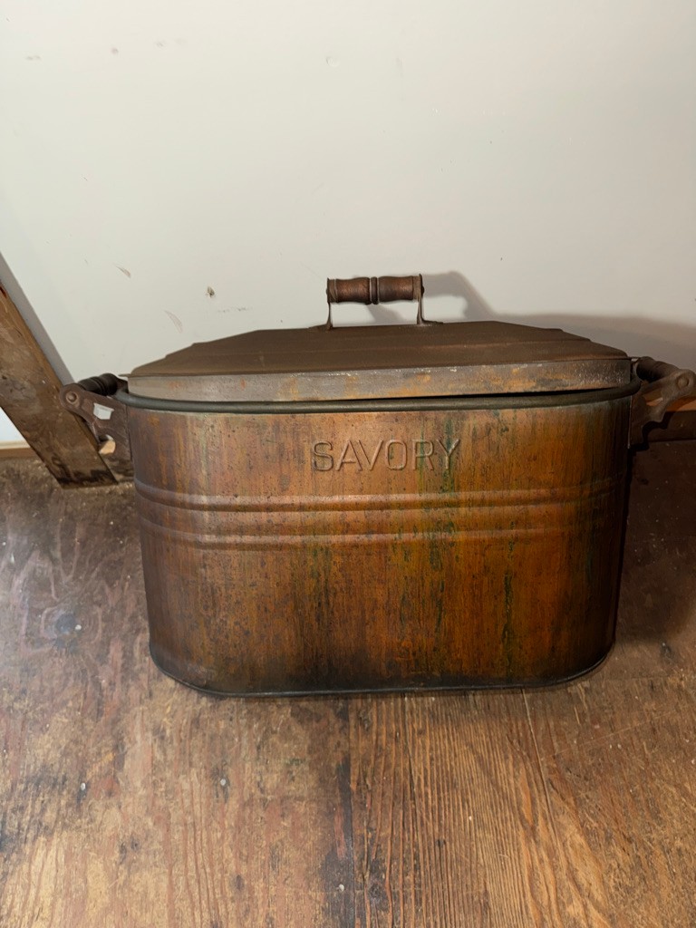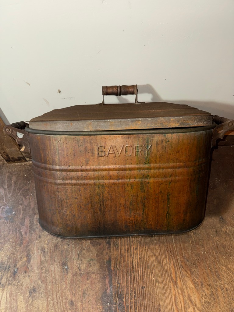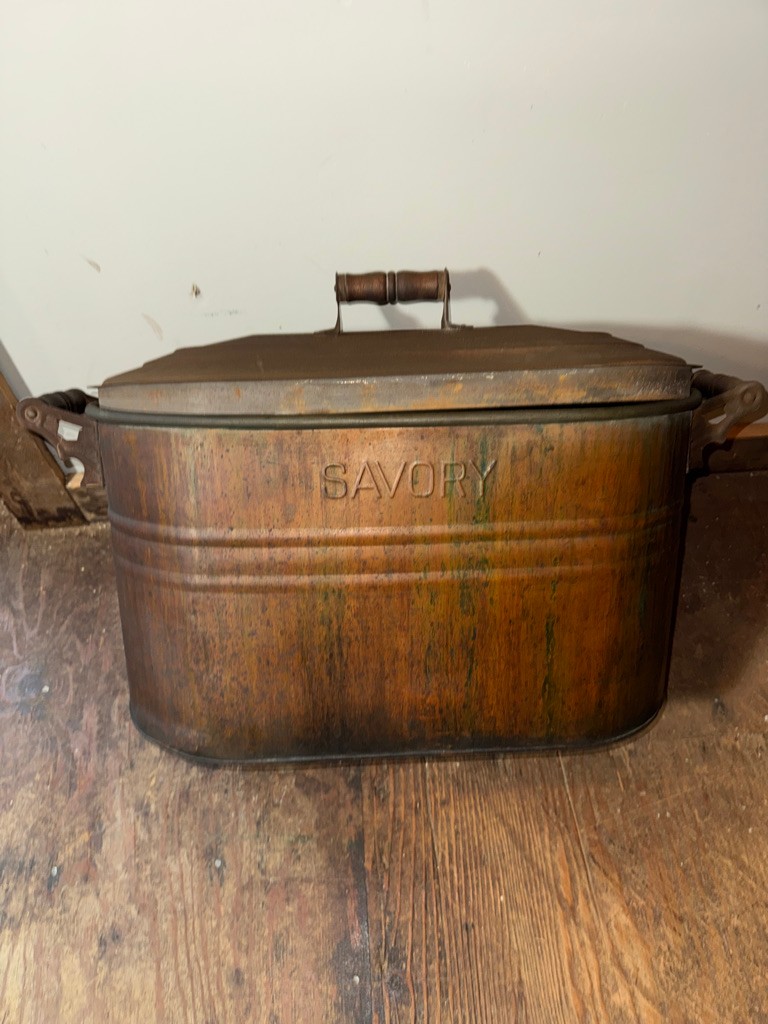 Old Savory copper wash boiler 28" long ,12"deep and 18" tall. Great decorative piece !