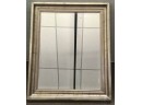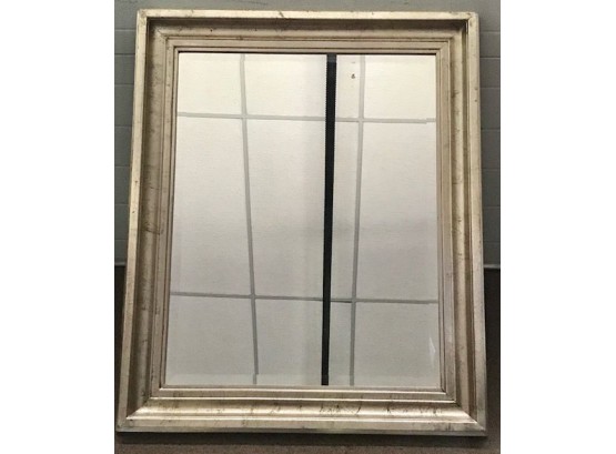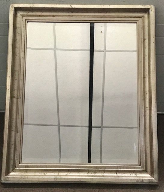 Nice modern bevel glass mirror with silver gilt frame. Overall the frame is 28 3/4" by 34 3/4". Good condition Reflection of ceiling in 2 photos Can be hung either way