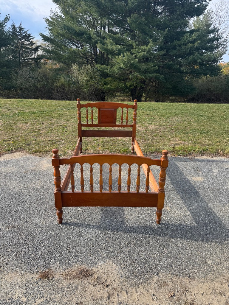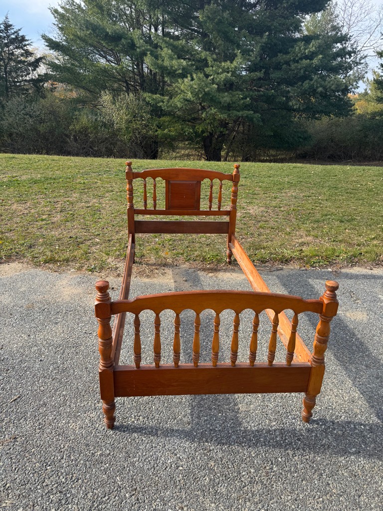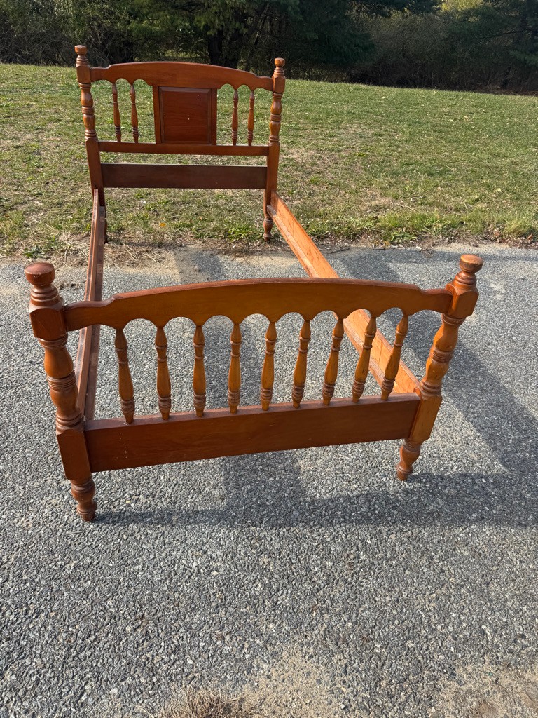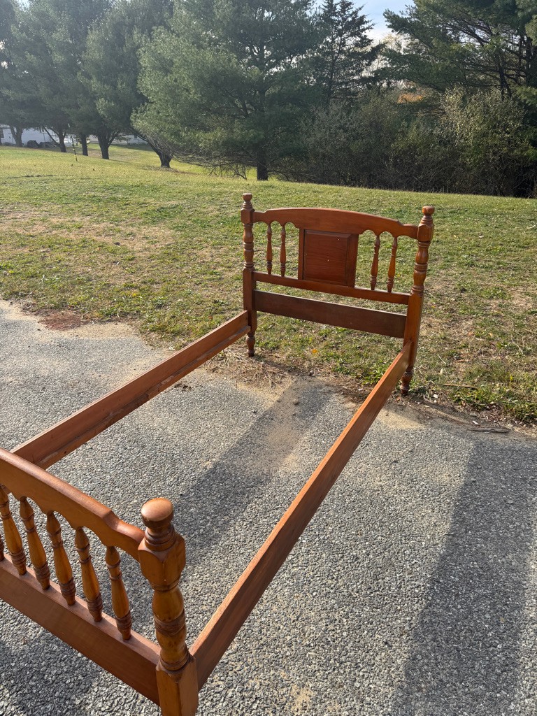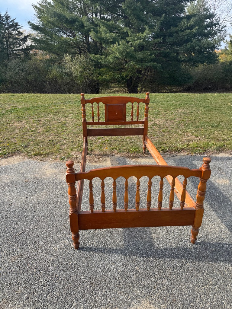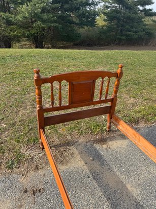 Solid wooden twin bed complete with rails. The rails are 76 inches long ,the width of the bed is 41 1/2 inches the headboard height is 40 inches the foot board height is 32"