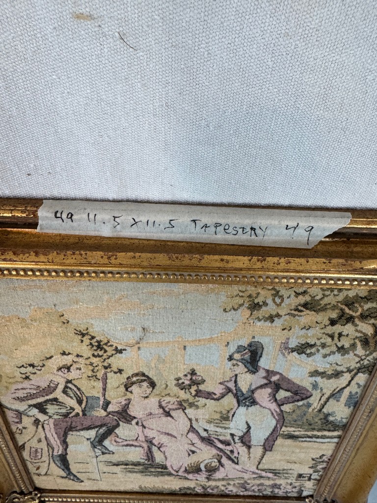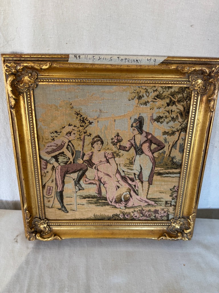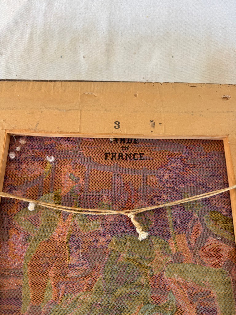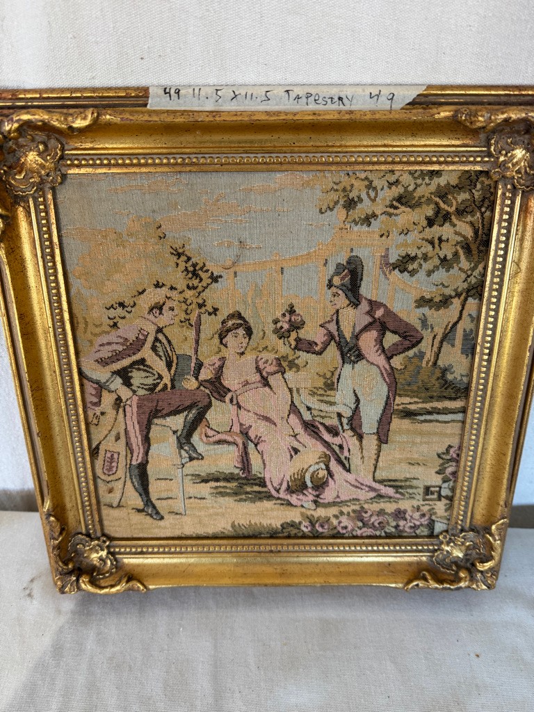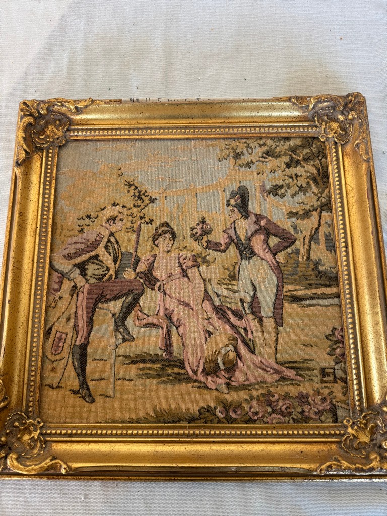 Made in France tapestry 11.5" x11.5" Scene of Woman and Male admirers #49