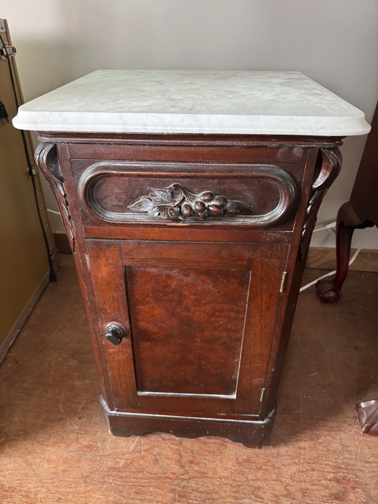 A nice black walnut marble top half commode. Note the grape carved drawer pull and carvings on the side of commode underneath the marble