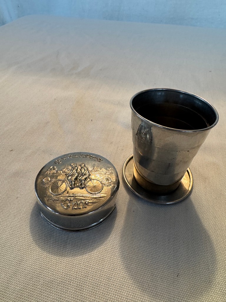Collectible old metal collapsible drinking cup with embossed people riding a old time bicycle. Good gift for a bicyclist.