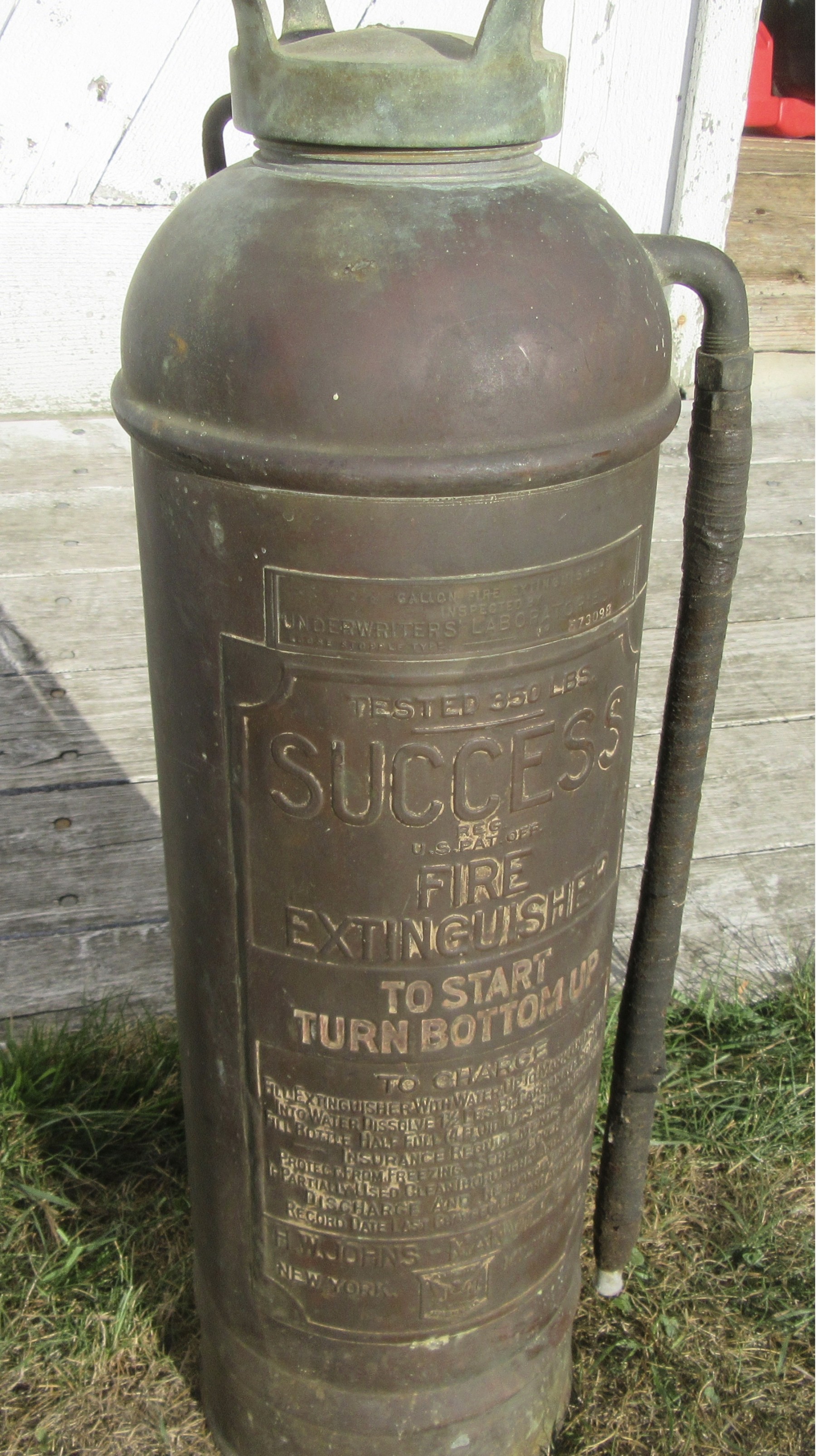 Success copper fire extinguisher 7" in diameter 24" tall. Needs a good clean and polish
