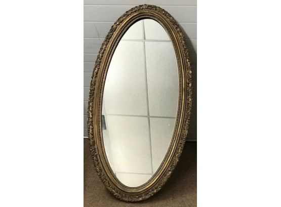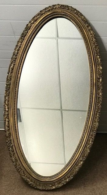 nice large antique oval mirror in fancy gold frame. Overall frame measures 23 1/2" by 43 3/4". This can be hung either way.