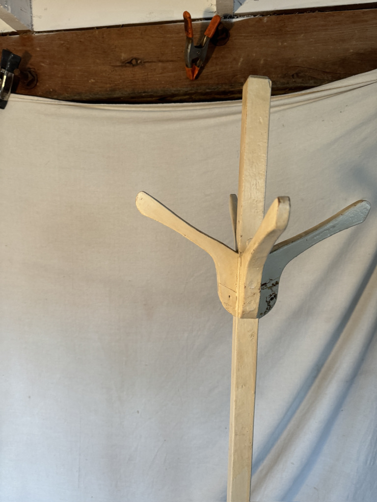 Old painted white clothes tree 66" tall and base is about 18 1/2" by 18 1/2"