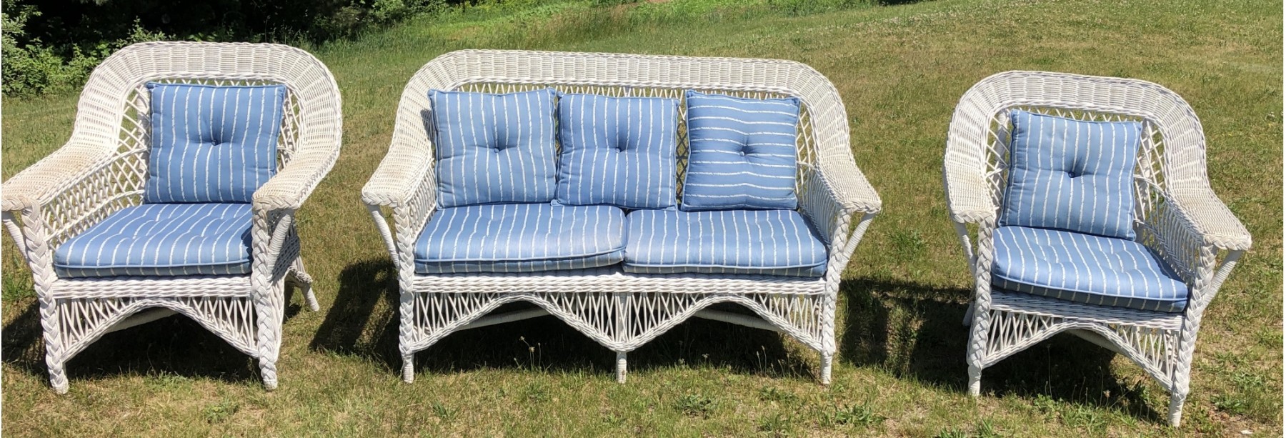 White painted wicker ( real wicker not plastic)Settee width 59" height 35" seat depth 21" arm chairs are 35" tall 32" wide and have seat depth of 22"comes with cushions