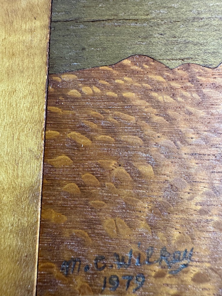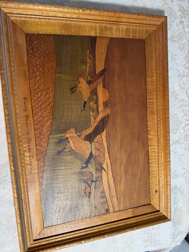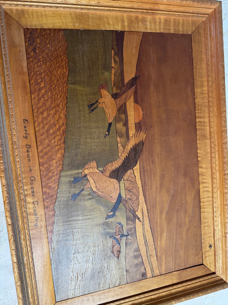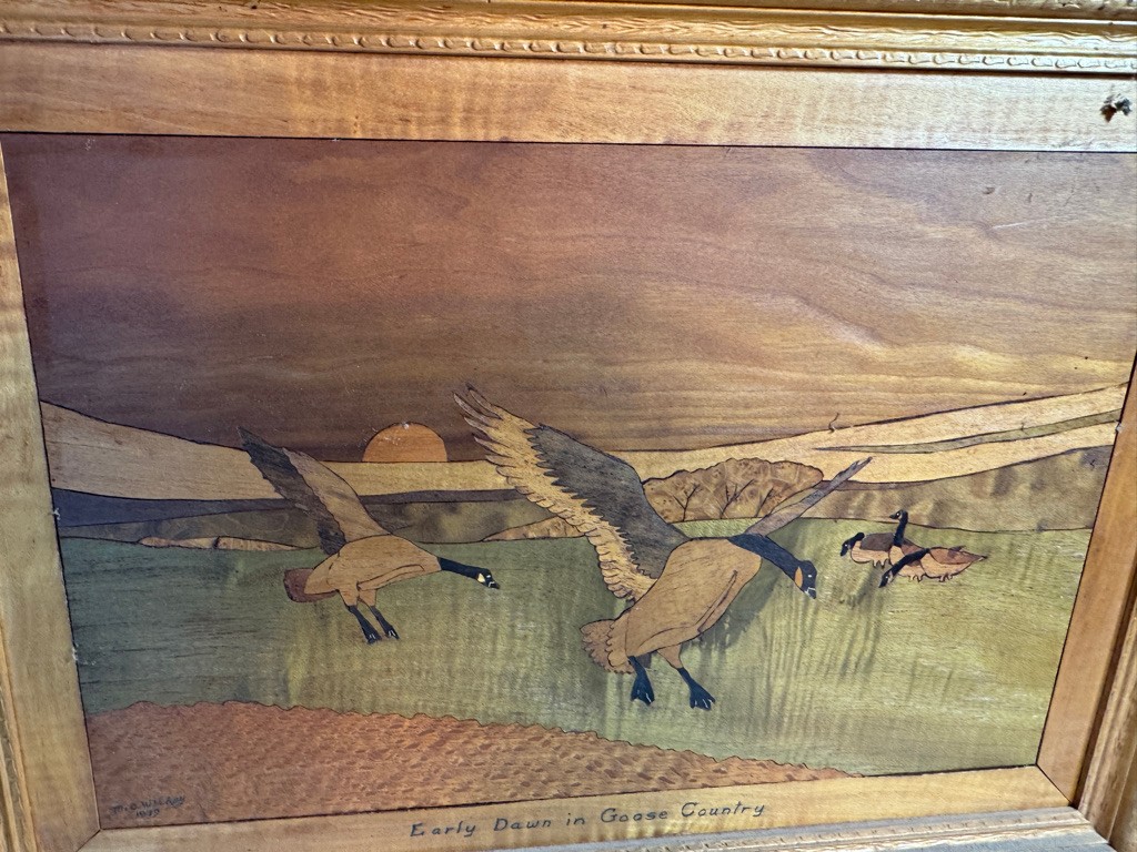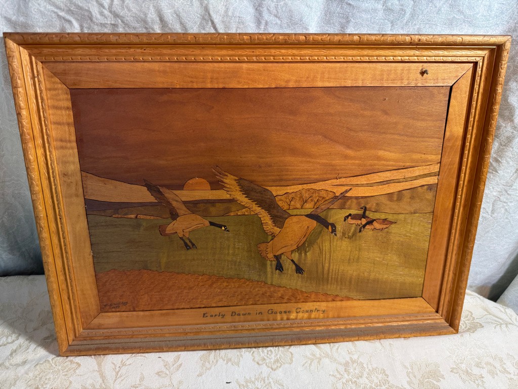 Inlaid wood art by M.C Wilkay 1979 Titled - Early Dawn in Goose Country-12" x 17 1/2"see photos work is signed. Variuos different wood inlays.