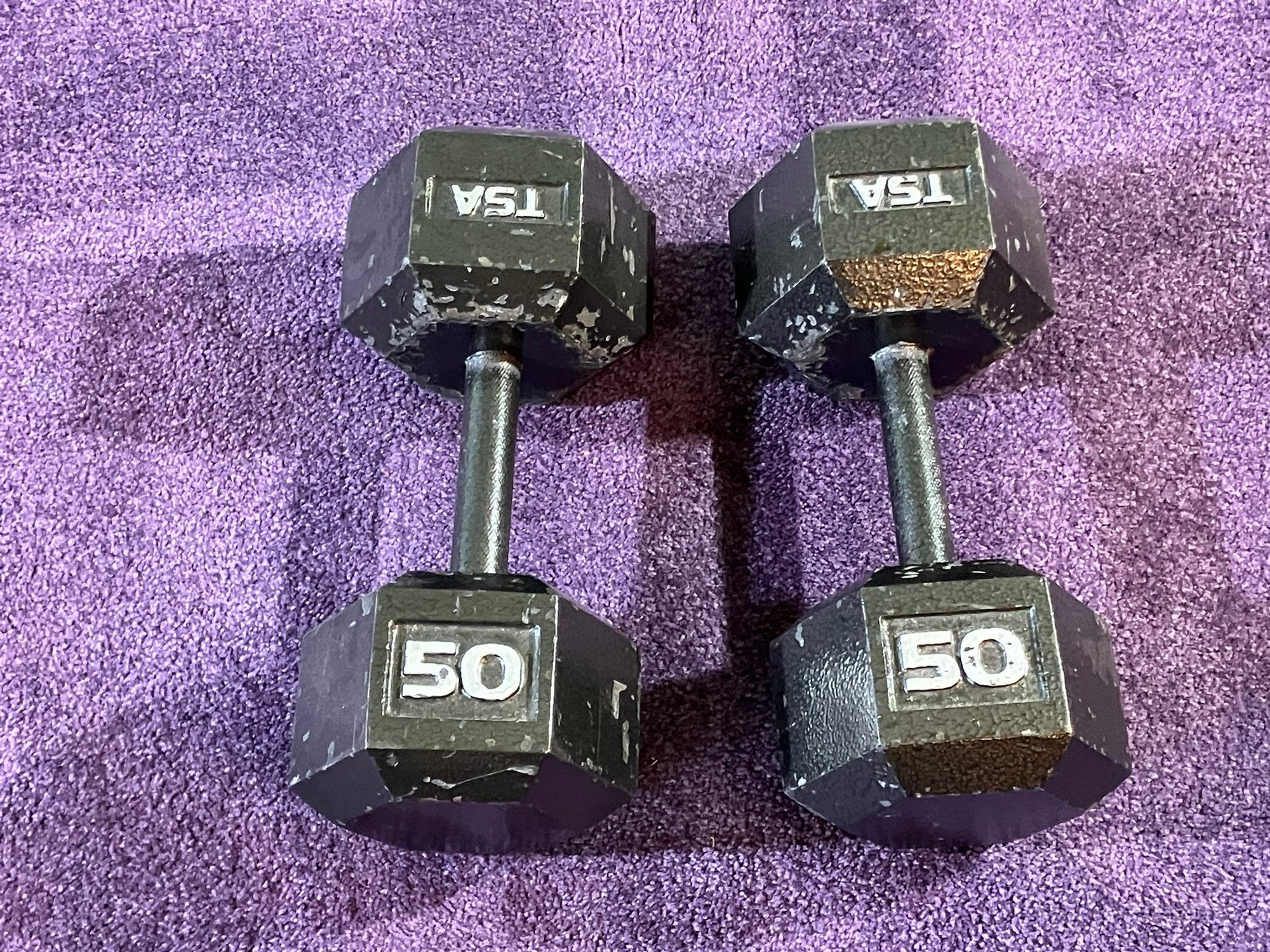 Pair of TSA brand 50lb Hex Dumbbells (metal). In Very Good condition (see pics).