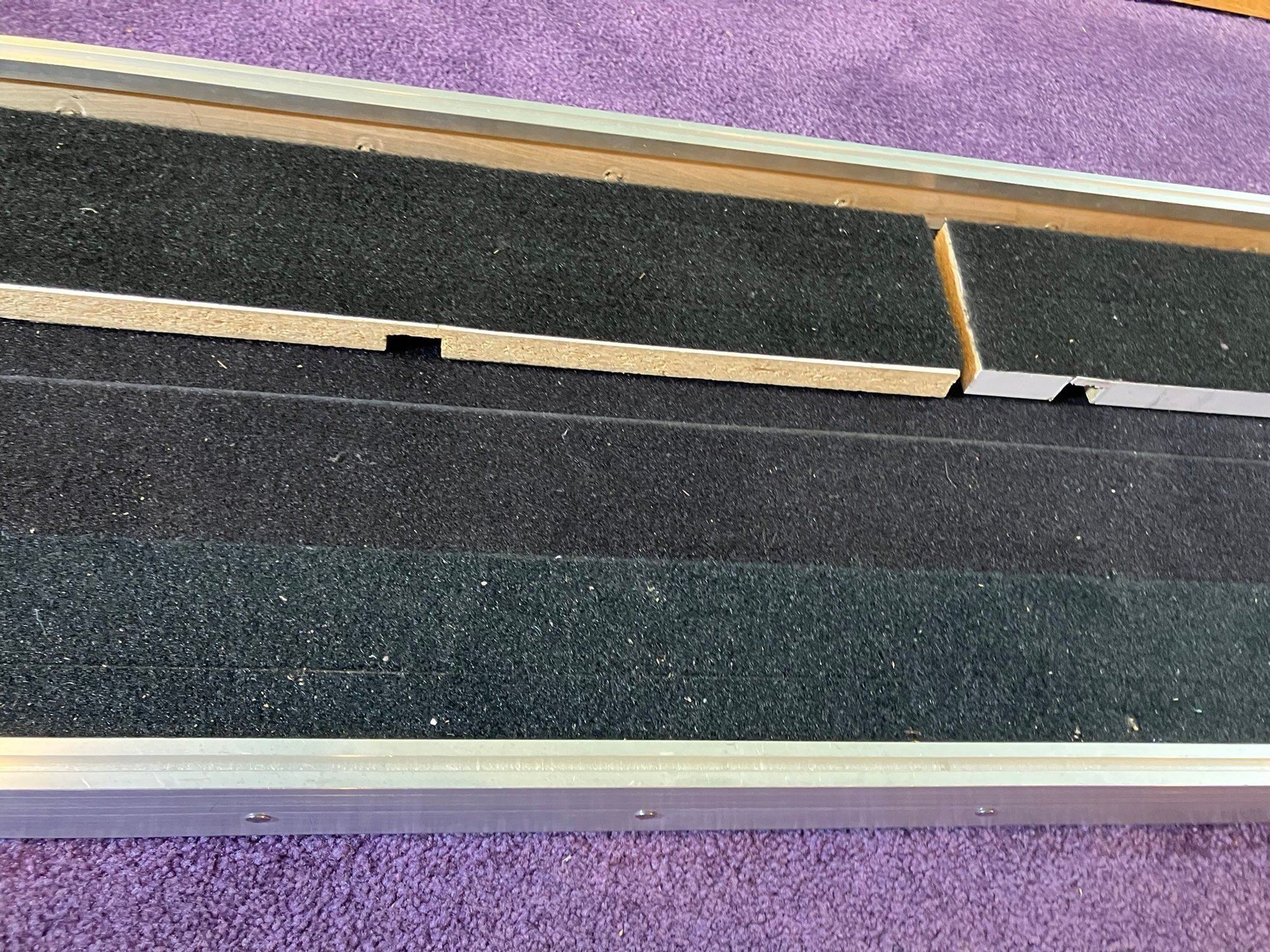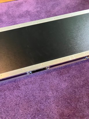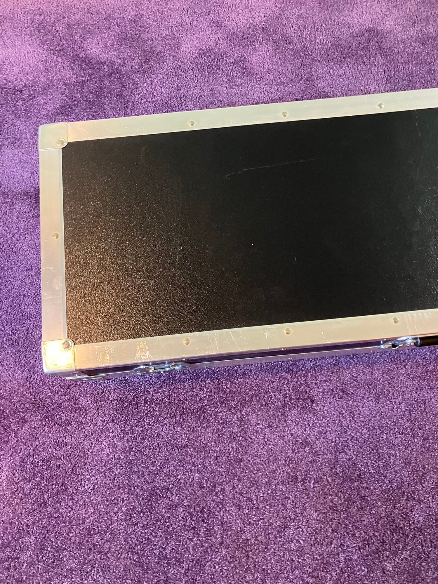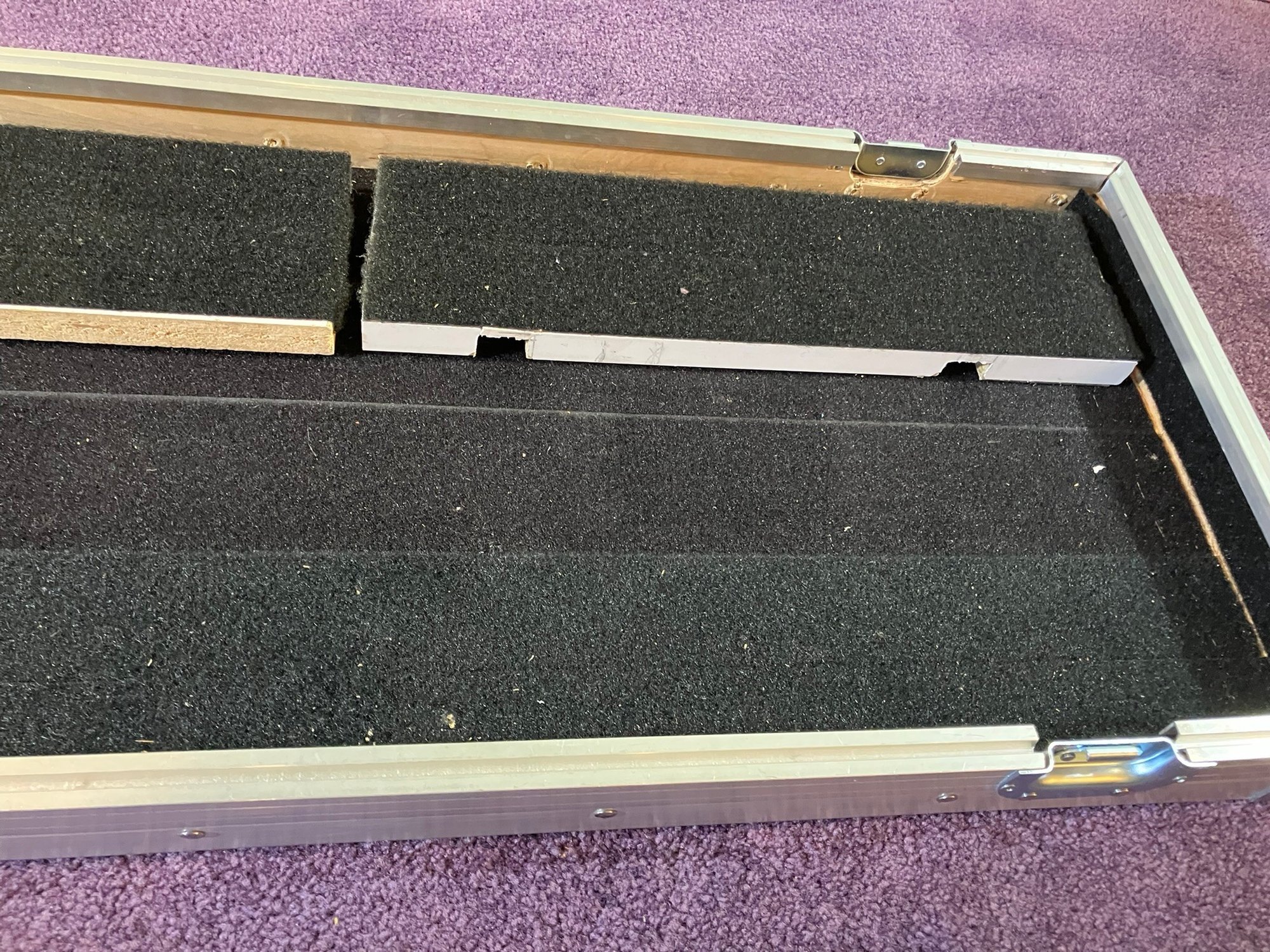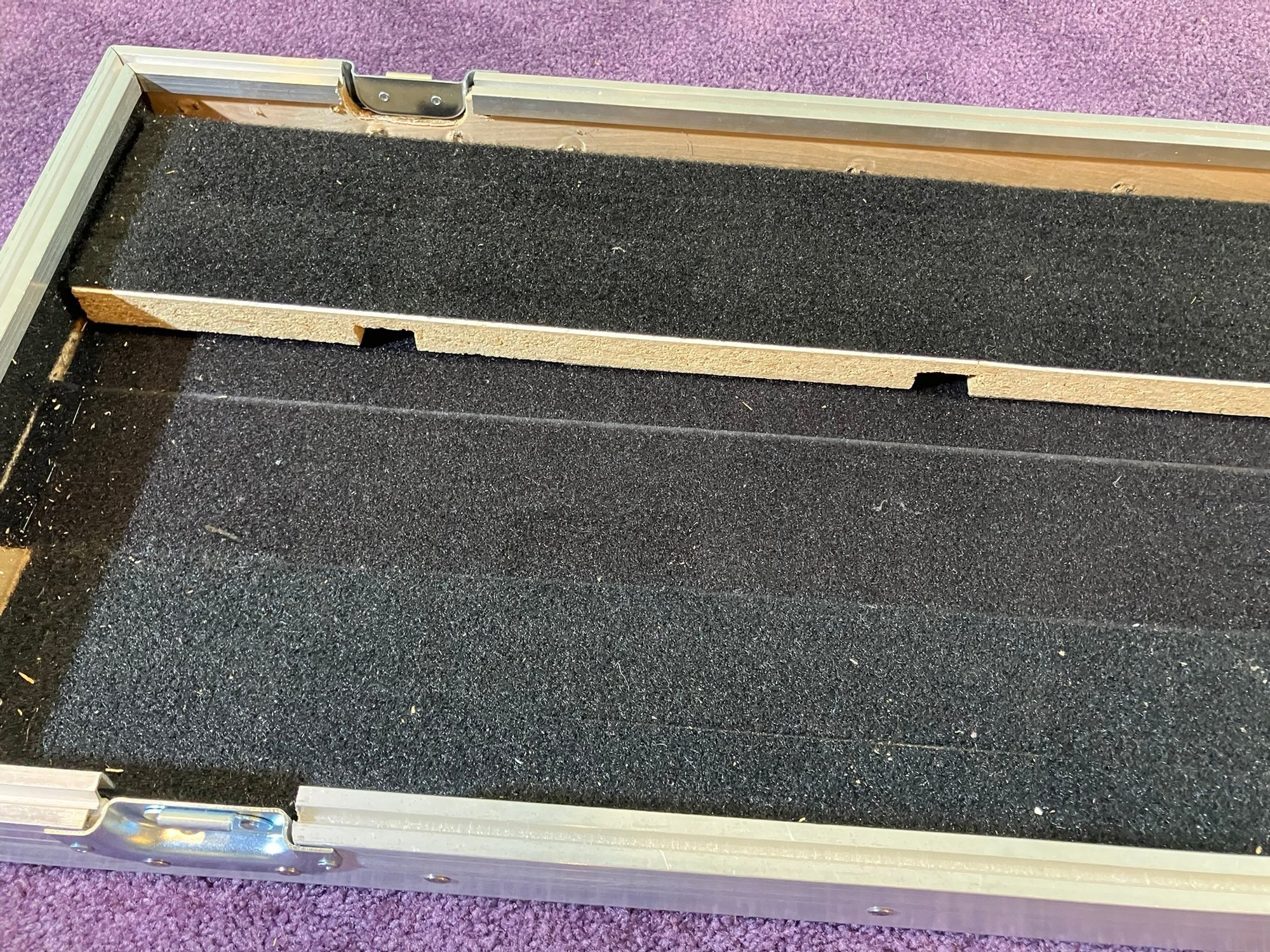 Black Pedalboard Case for putting guitar pedals into, lined with industrial strength "loop" velcro. Roadworthy case, very tough, in great condition. Interior measurements: 12" x 40.5" x 1.75" height in the 'tray' which is the part that stays on the ground with your pedals on it, and 12" x 40.5" x 5" height for the lid. Exterior dimensions are: 13.5" deep x 41.25" long x 7.5" high.