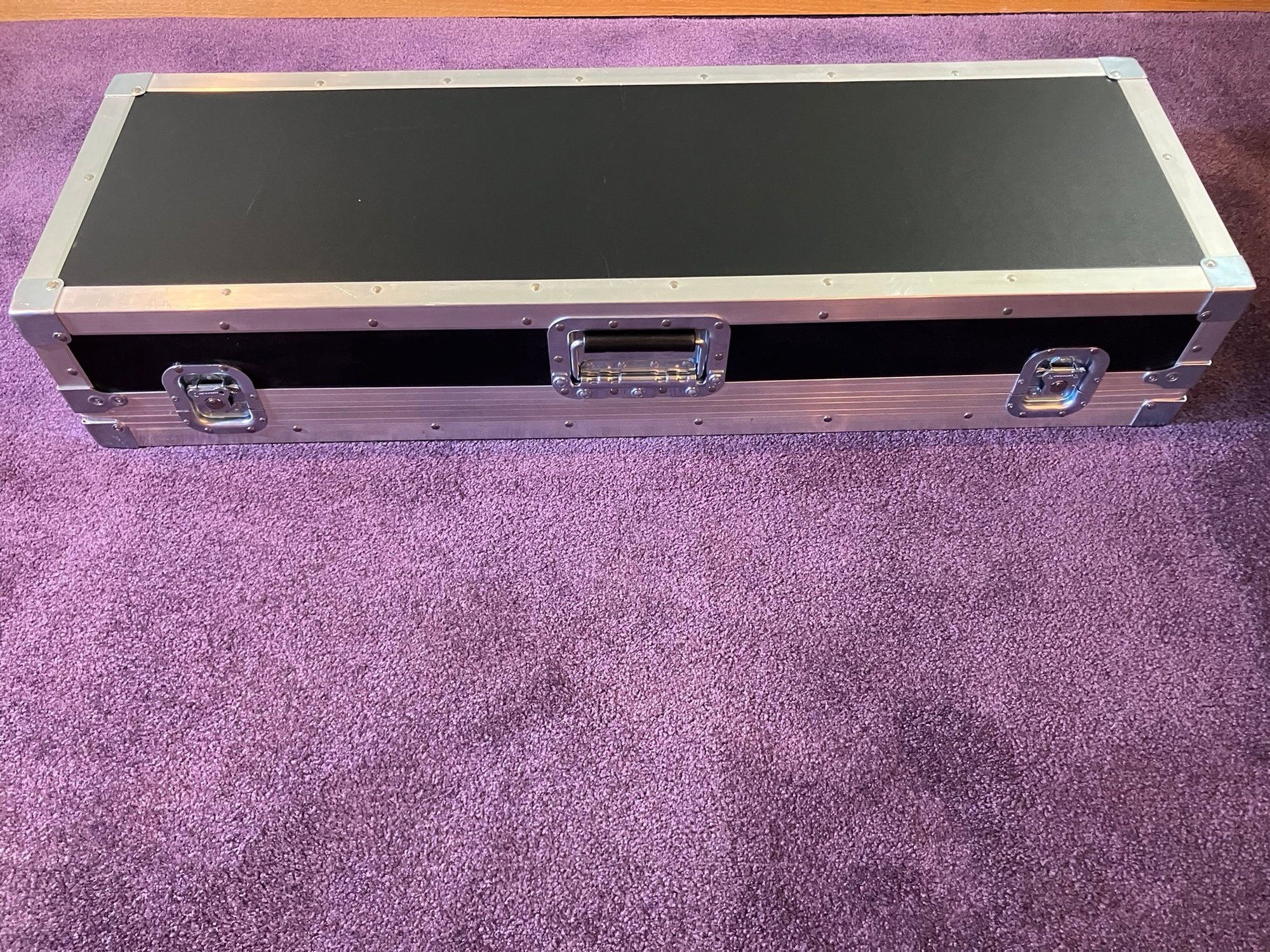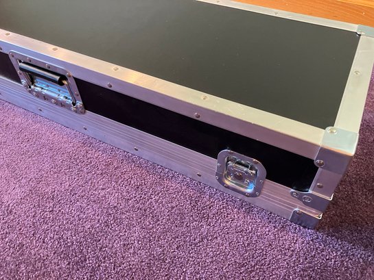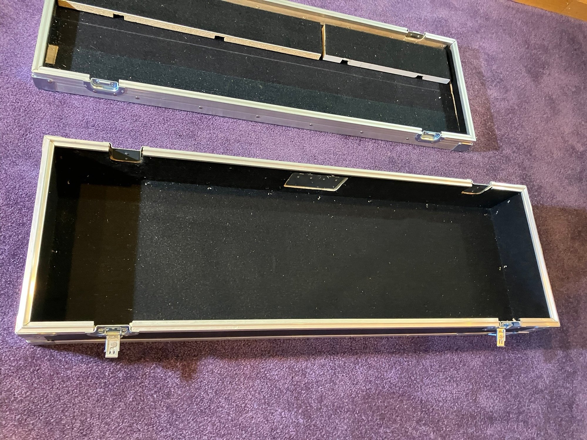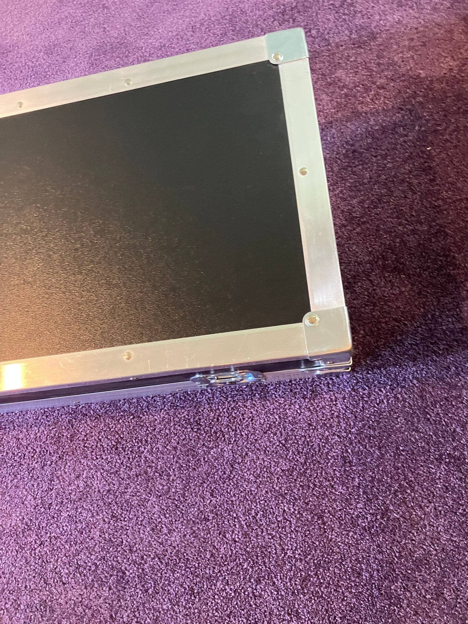 Black Pedalboard Case for putting guitar pedals into, lined with industrial strength "loop" velcro. Roadworthy case, very tough, in great condition. Interior measurements: 12" x 40.5" x 1.75" height in the 'tray' which is the part that stays on the ground with your pedals on it, and 12" x 40.5" x 5" height for the lid. Exterior dimensions are: 13.5" deep x 41.25" long x 7.5" high.