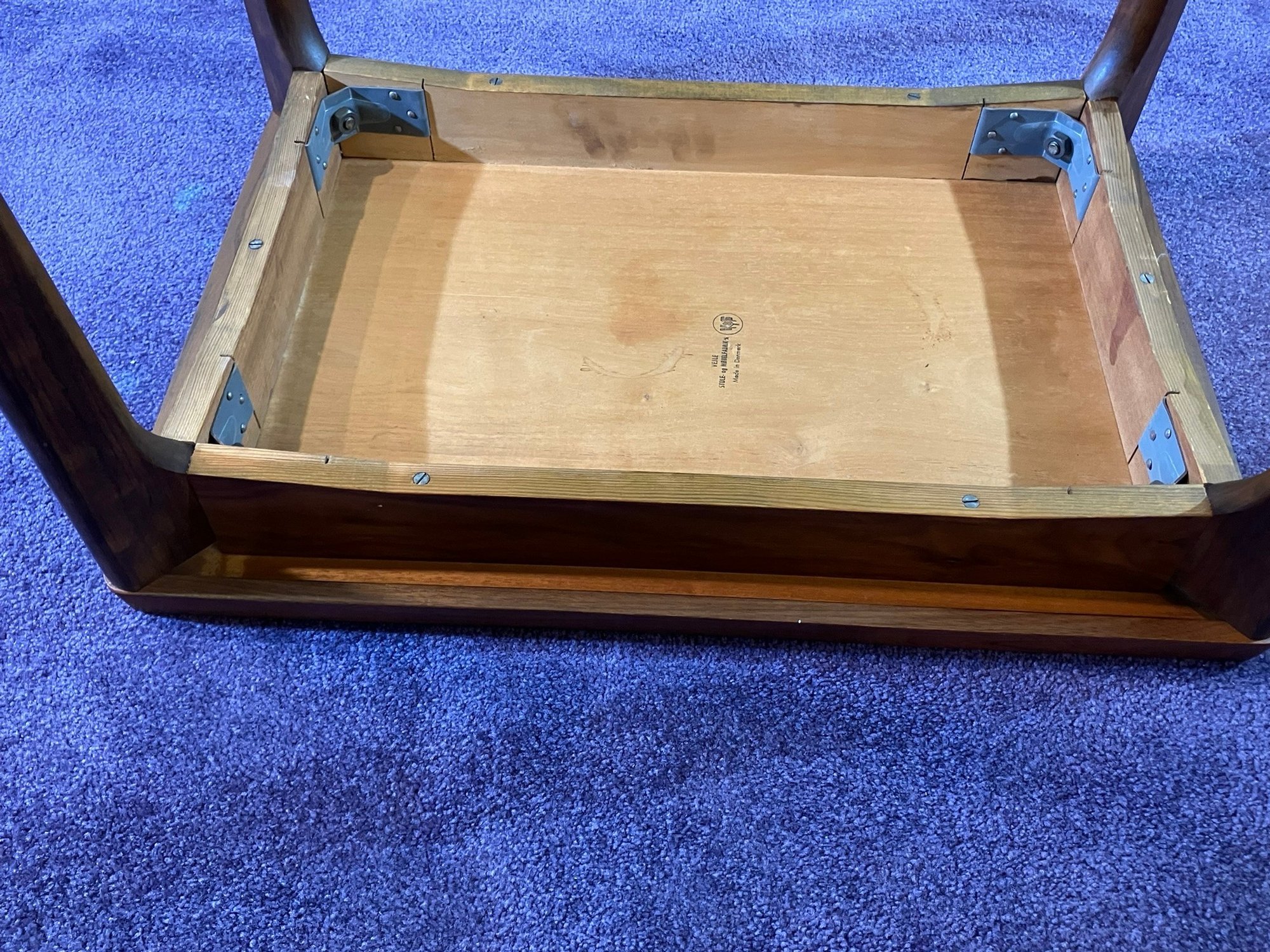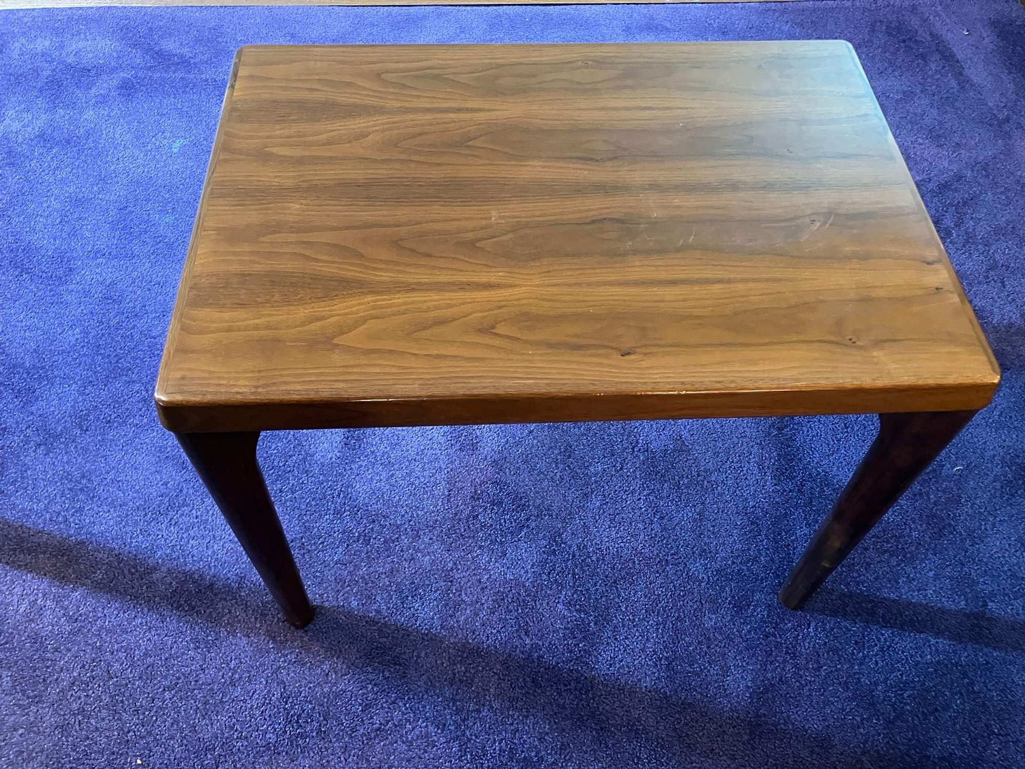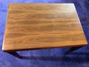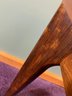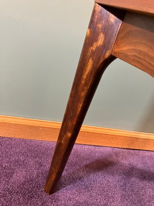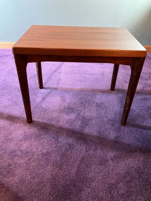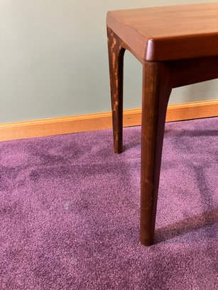 Danish Teak Side Table by Vejle Stole & Møbelfabrik. This is a lovely Danish teak side table by Henning Kjærnulf for Vejle Stole & Møbelfabrik. It has sculpted solid teak legs that are mounted at an angle and a framed teak top. It is in excellent condition, especially considering it was made probably in the 1960s or 1970s.