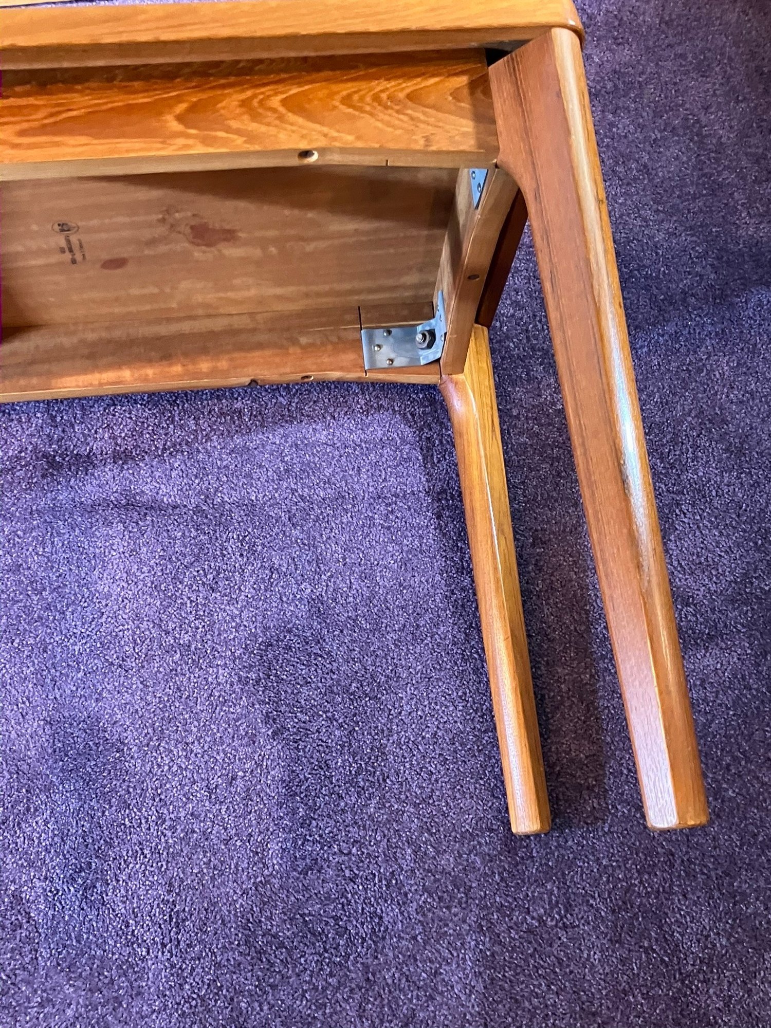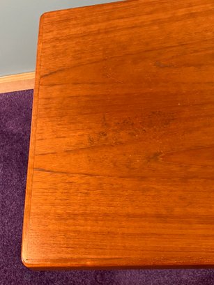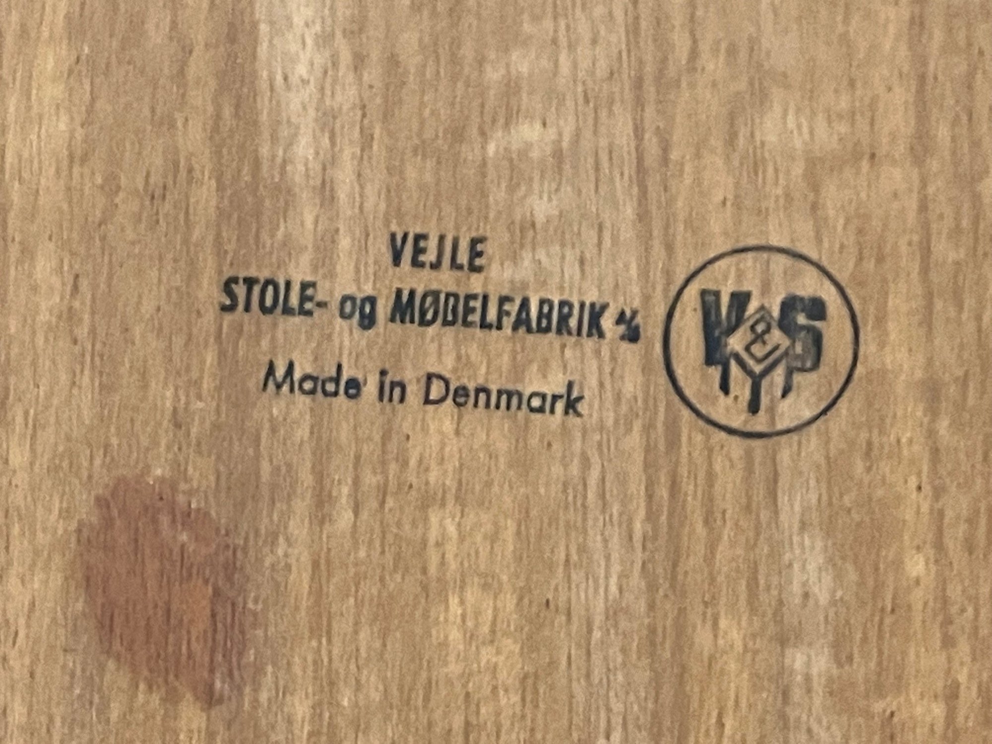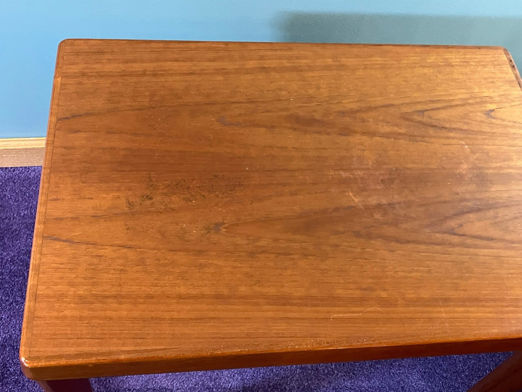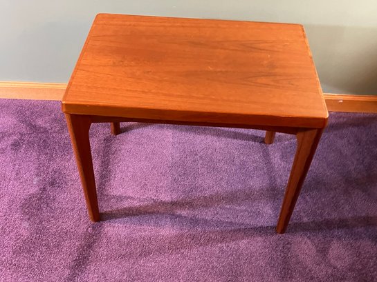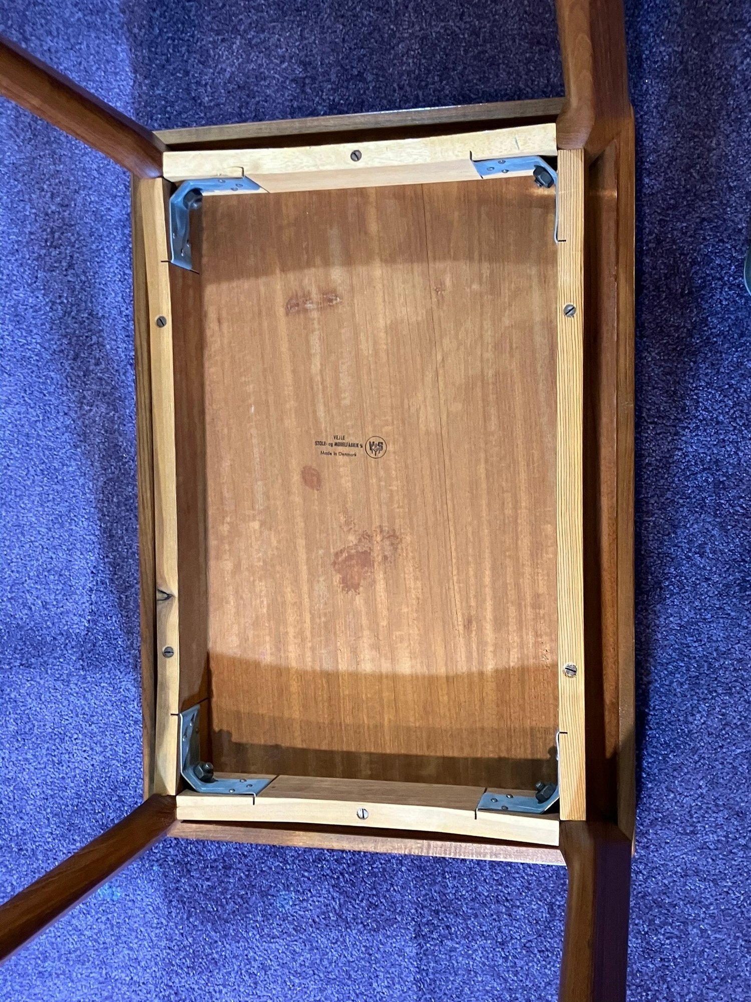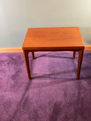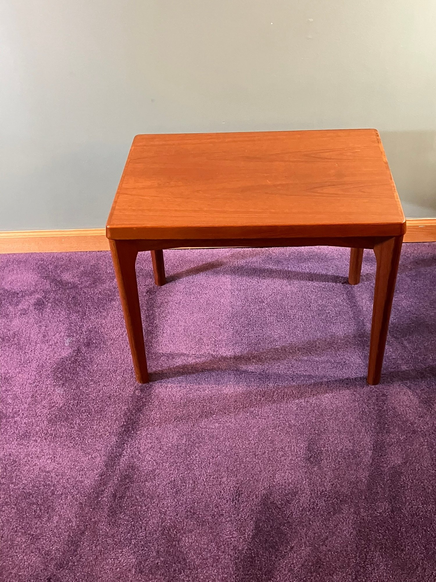 This is a lovely Danish teak side table by Henning Kjærnulf for Vejle Stole & Møbelfabrik. It has sculpted solid teak legs that are mounted at an angle and a framed teak top. The wood on this particular table looks more like "birdseye maple" than it does like teak, but that's just the natural range of variation that real wood has. The legs of this table has a strange bleaching effect--I believe it's because the legs were in exactly the same sunlight exposure path for like 50 years. Excellent condition, especially considering this table was made in the 1960s or 1970s.