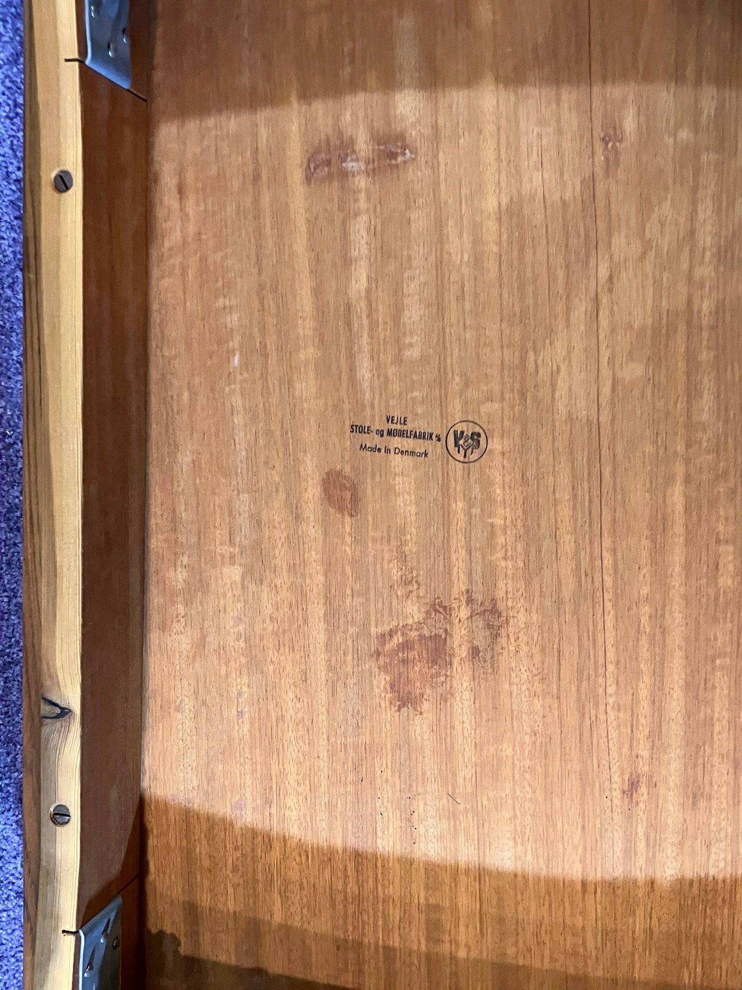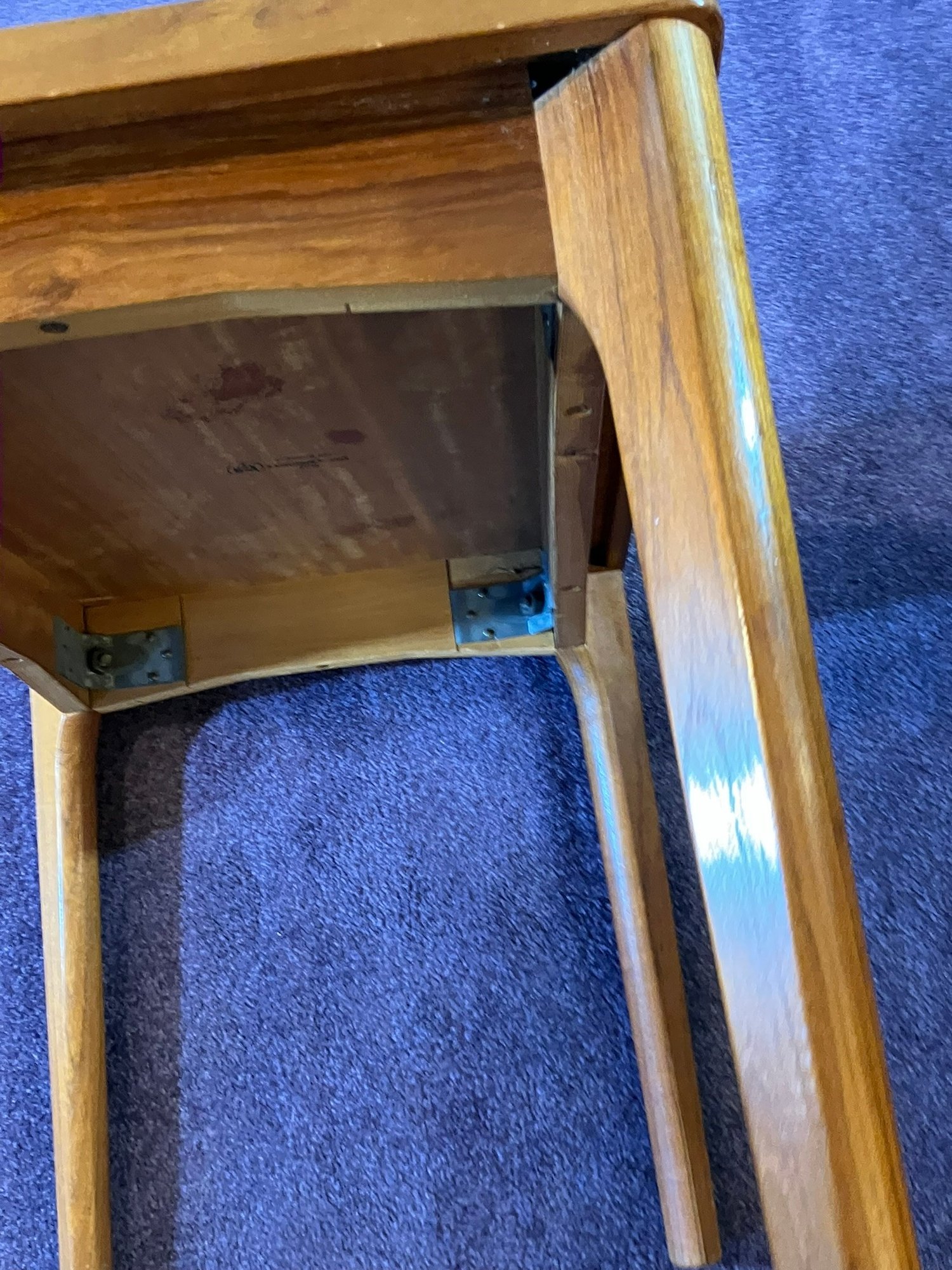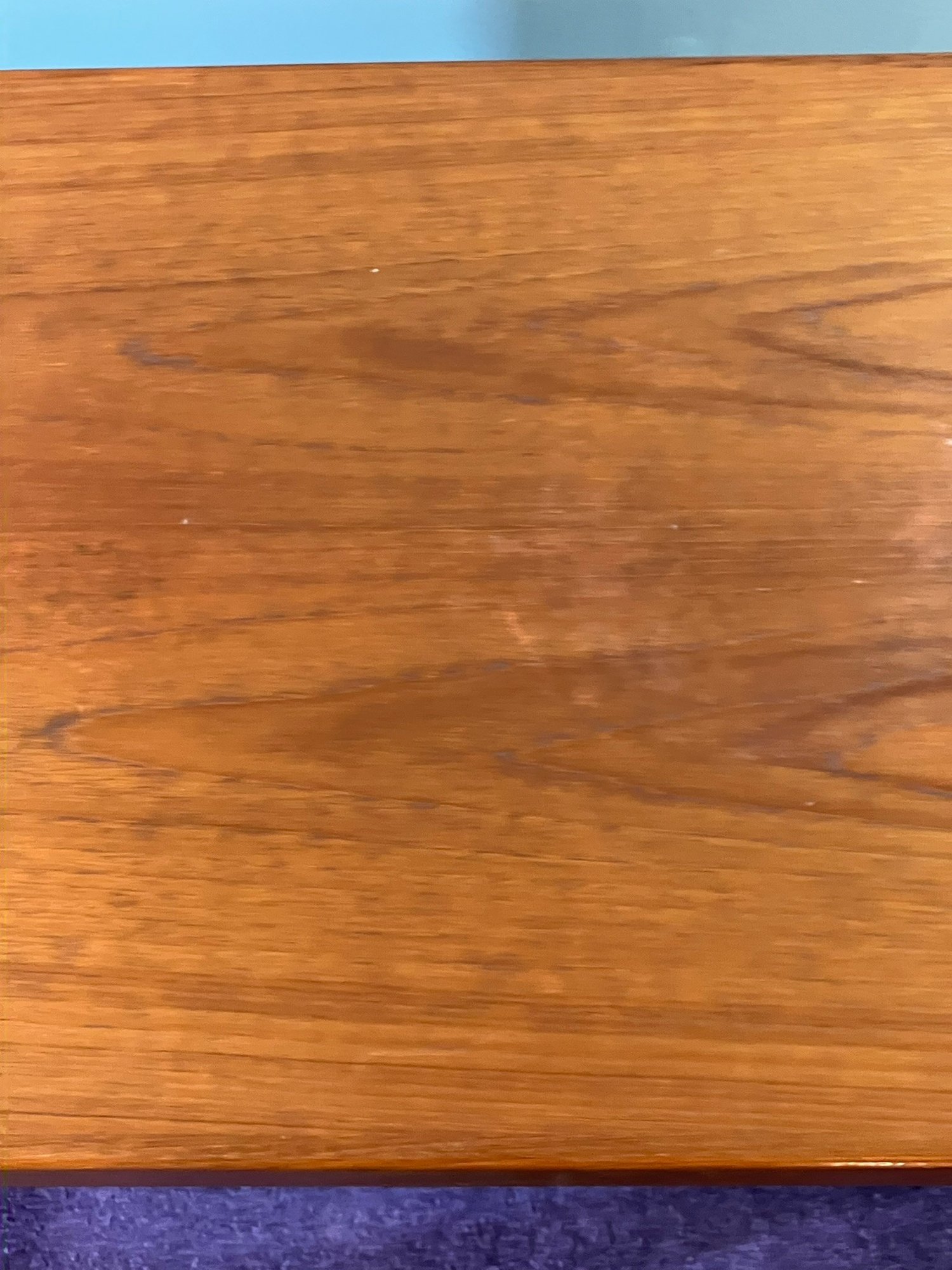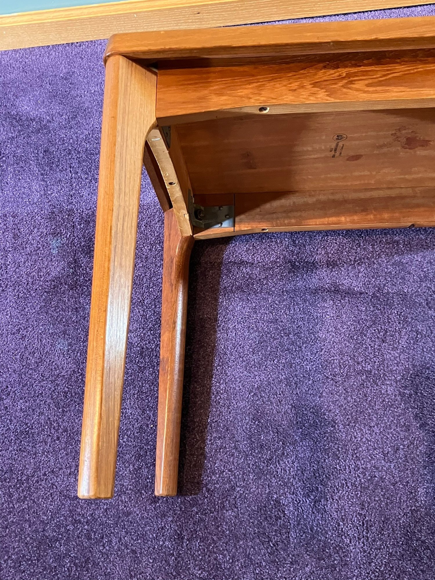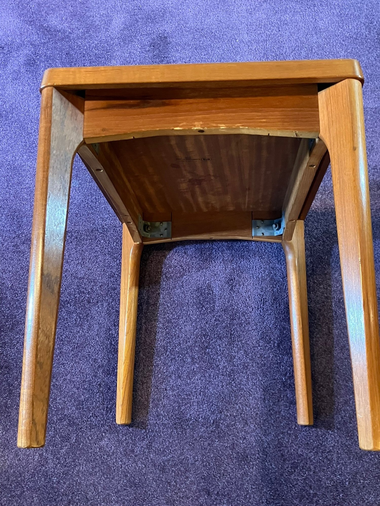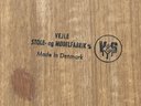 This is a lovely Danish teak side table by Henning Kjærnulf for Vejle Stole & Møbelfabrik. It has sculpted solid teak legs that are mounted at an angle and a framed teak top. The wood on this particular table looks more like "birdseye maple" than it does like teak, but that's just the natural range of variation that real wood has. The legs of this table has a strange bleaching effect--I believe it's because the legs were in exactly the same sunlight exposure path for like 50 years. Excellent condition, especially considering this table was made in the 1960s or 1970s.