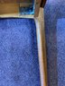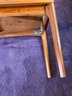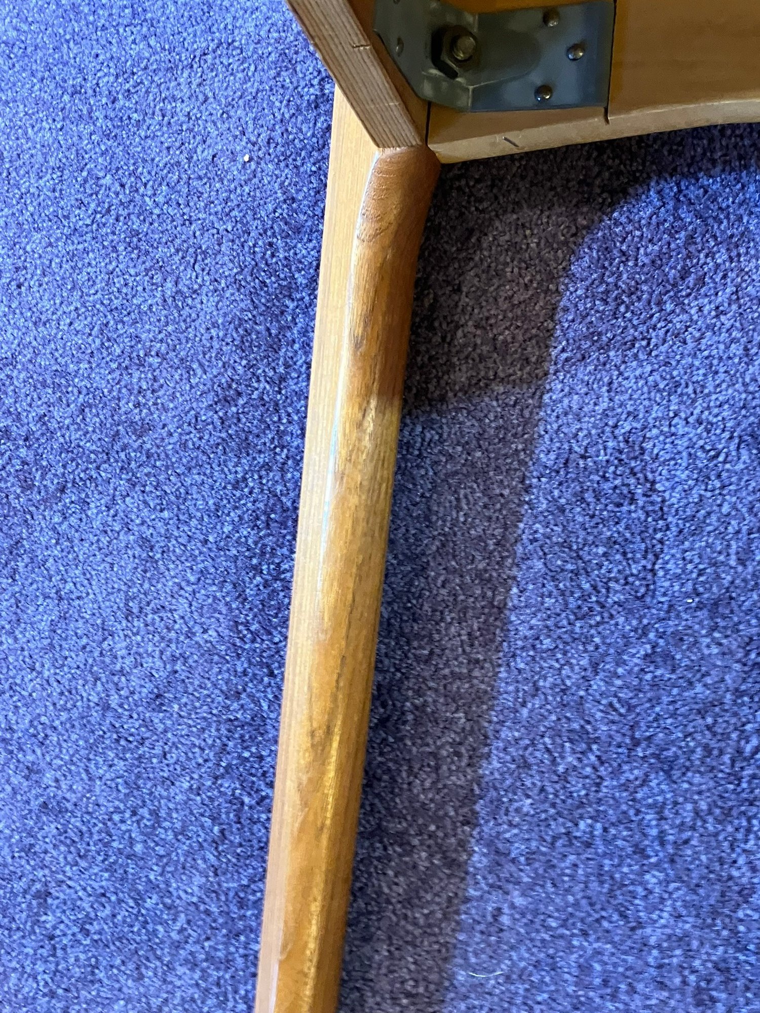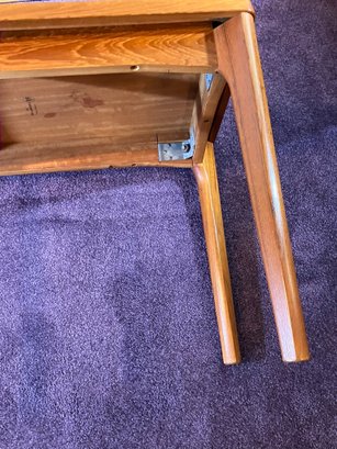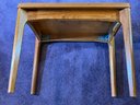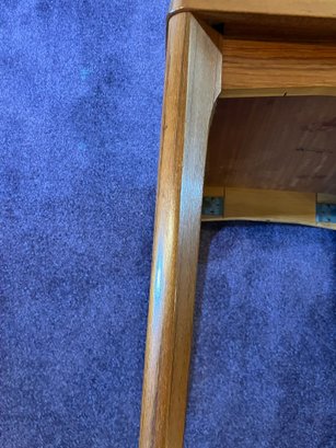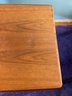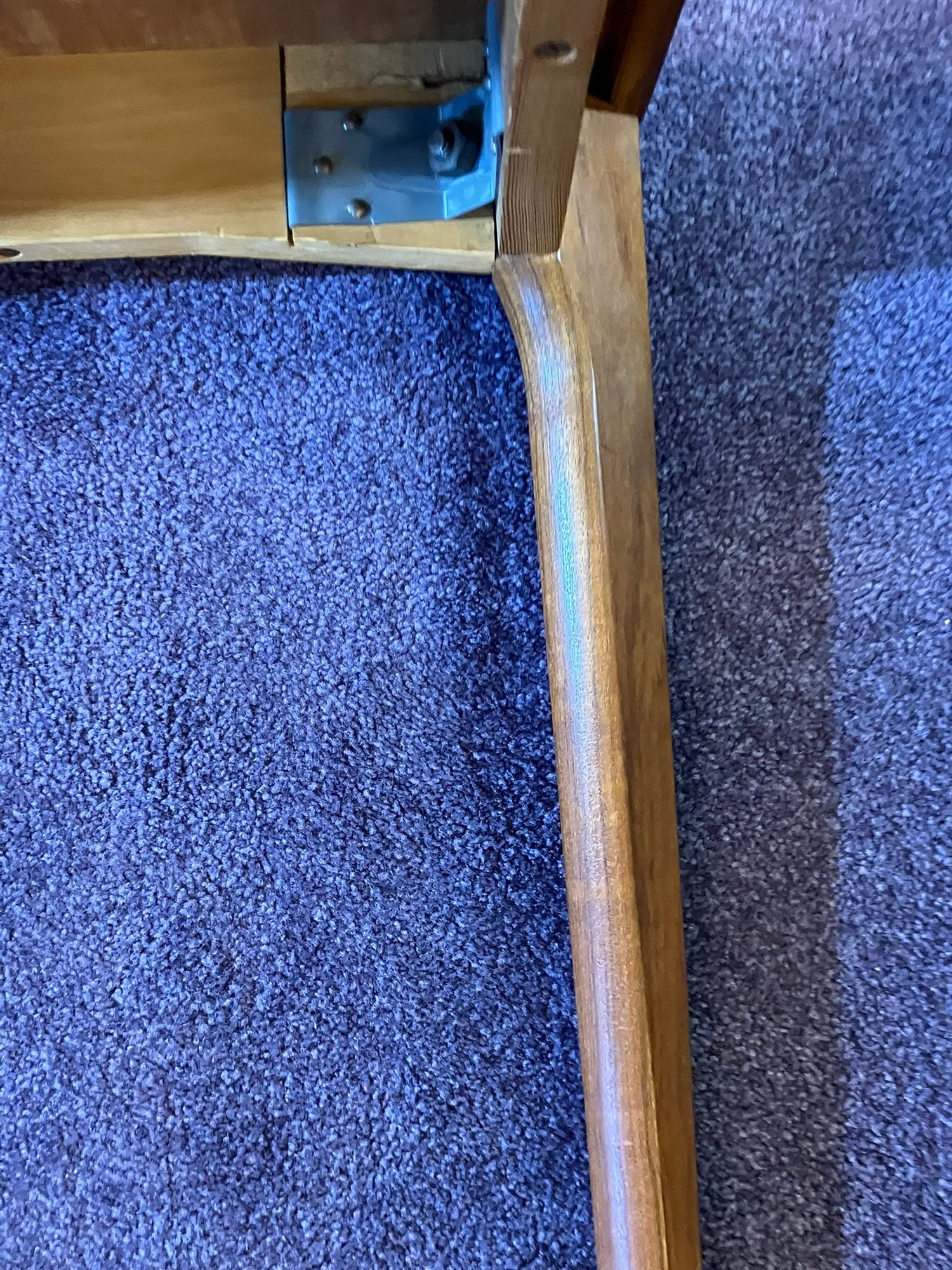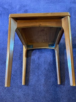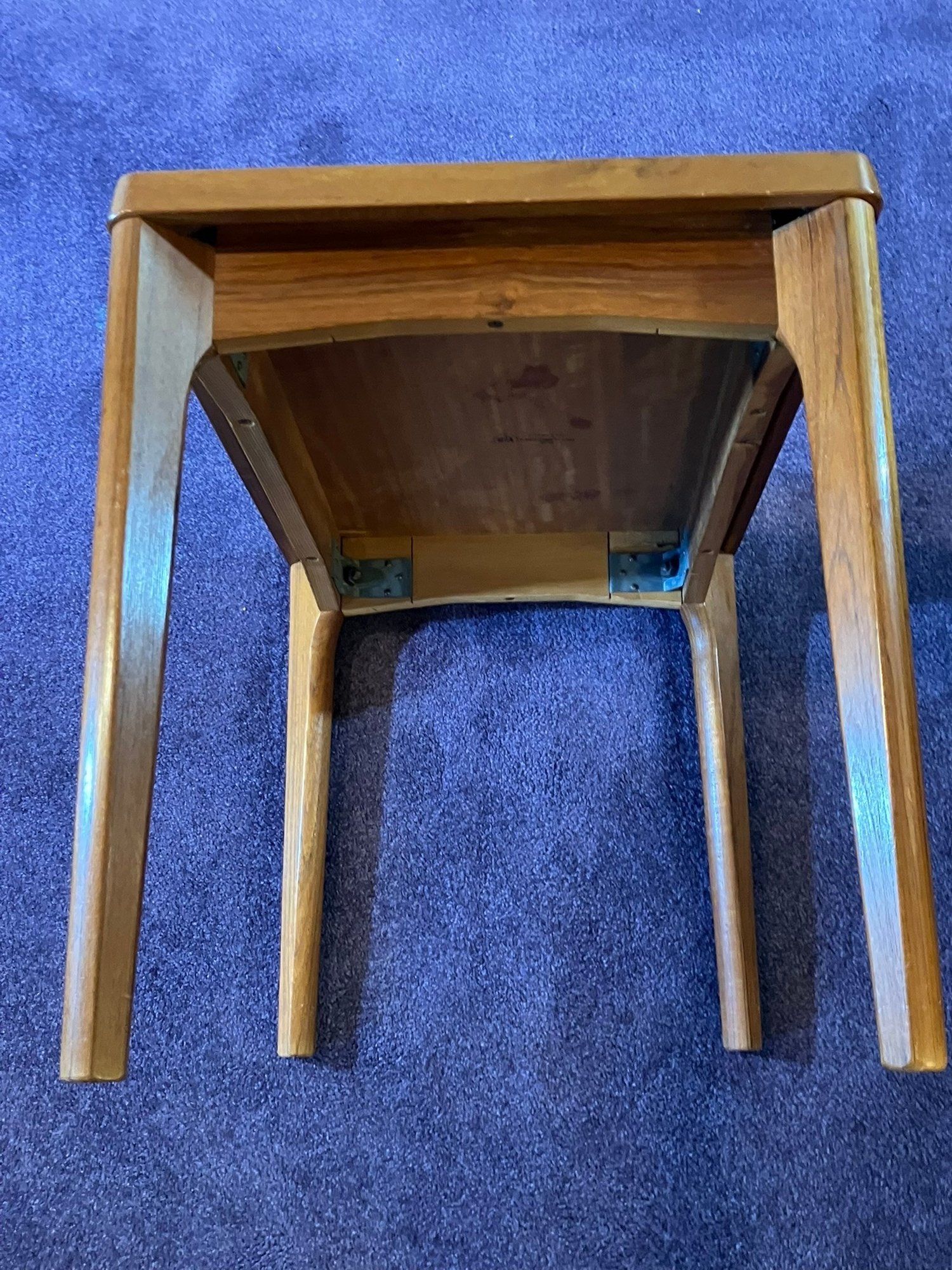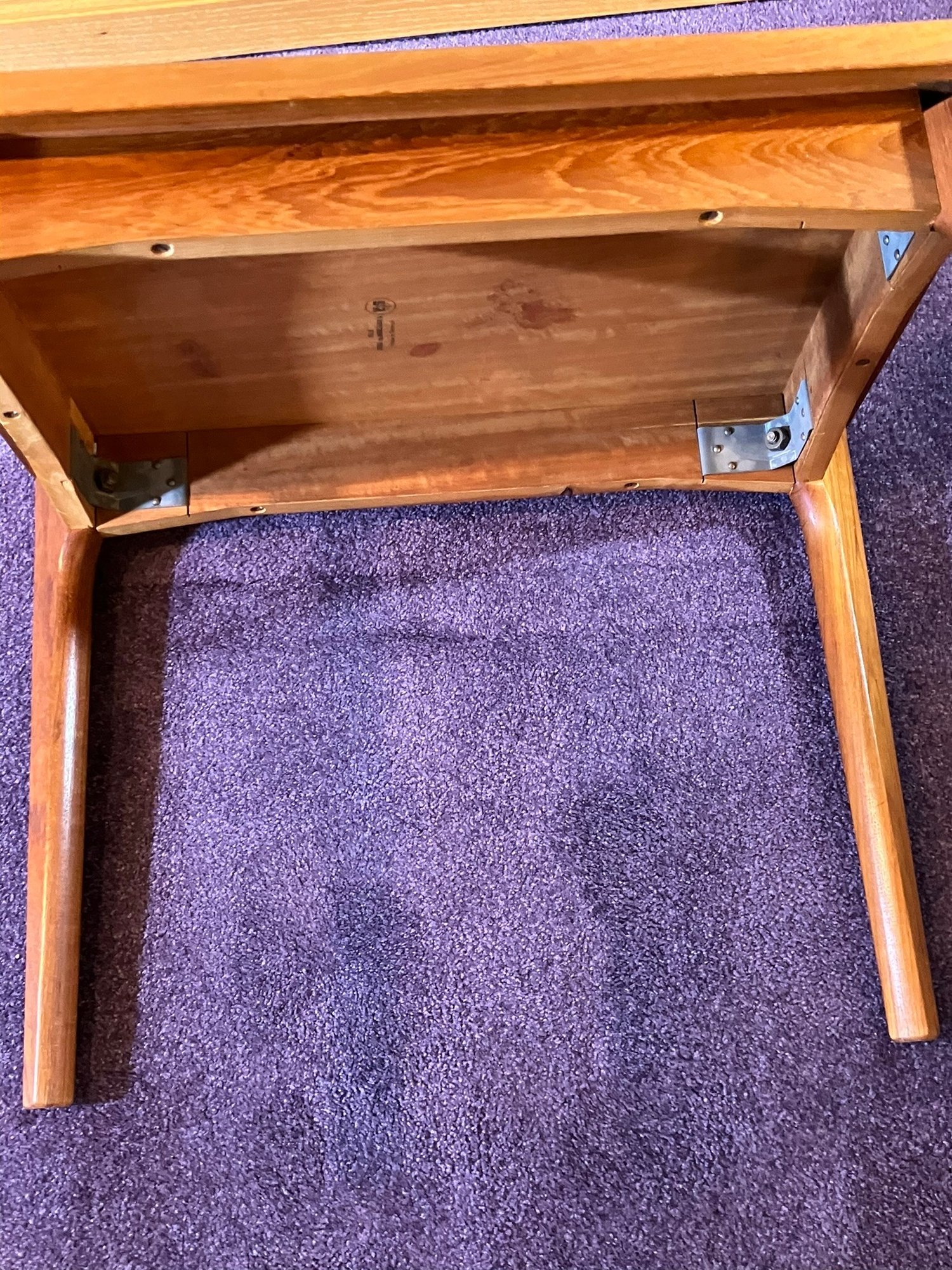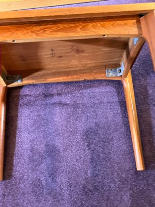 This is a lovely Danish teak side table by Henning Kjærnulf for Vejle Stole & Møbelfabrik. It has sculpted solid teak legs that are mounted at an angle and a framed teak top. The wood on this particular table looks more like "birdseye maple" than it does like teak, but that's just the natural range of variation that real wood has. The legs of this table has a strange bleaching effect--I believe it's because the legs were in exactly the same sunlight exposure path for like 50 years. Excellent condition, especially considering this table was made in the 1960s or 1970s.