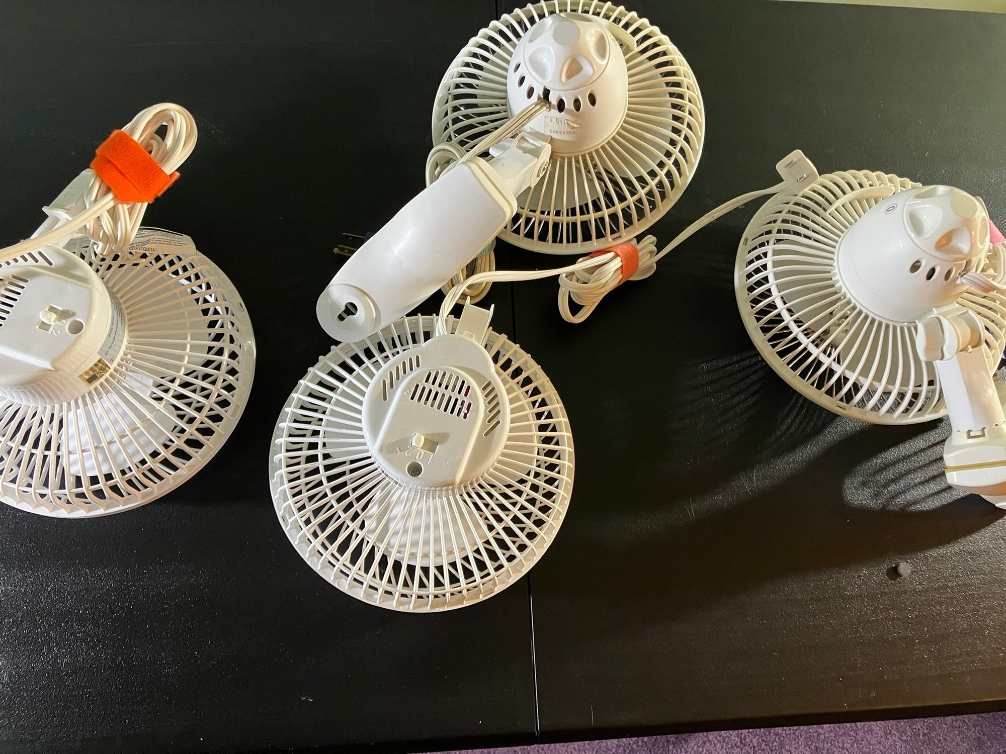 Four White Clip-on Portable Plug-in Fans. I used these to cool computers. Some of these have very very little use on them--practically new. I think 2 of them have been used extensively. Note that one of the fans has NO arm at all--it's just the fan by itself. It works great, they all do, but I had to mention that.