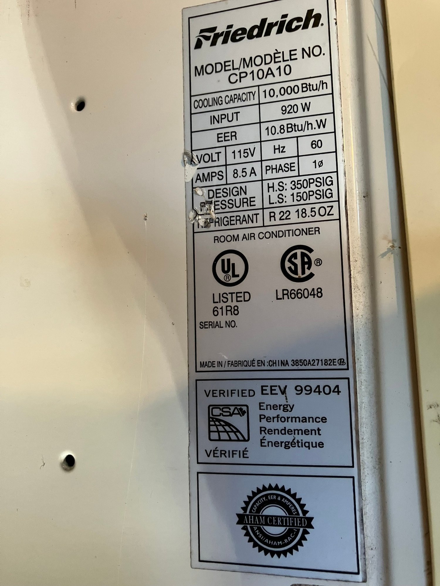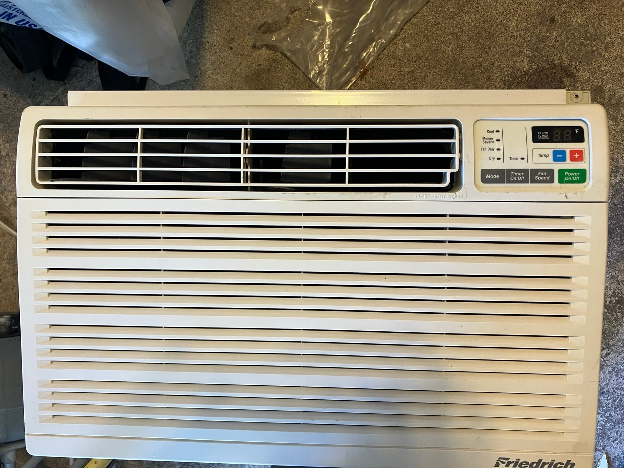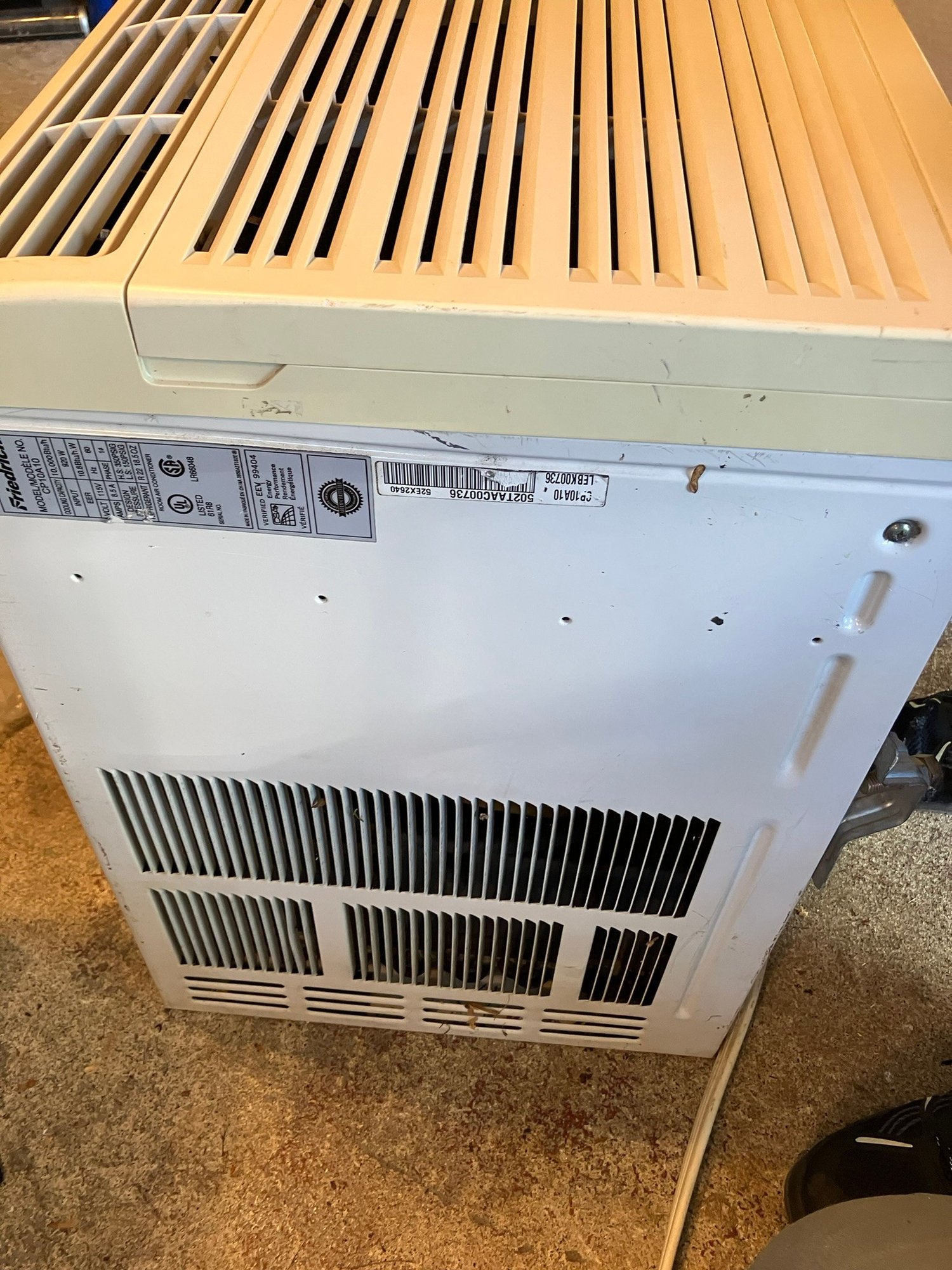 Friedrich Wall Air Conditioning Unit Model CP10A10. 10k BTUs worth of cooling, in one 110v unit with a standard 3-prong plug.