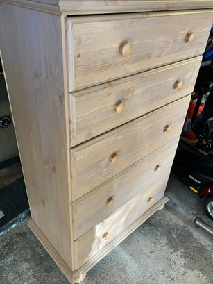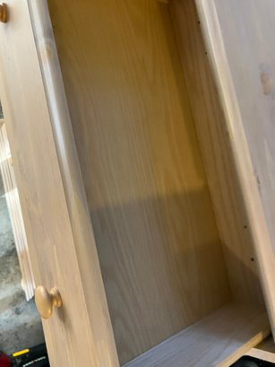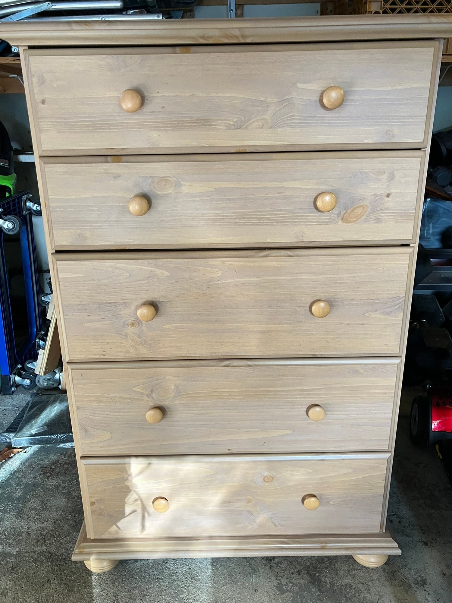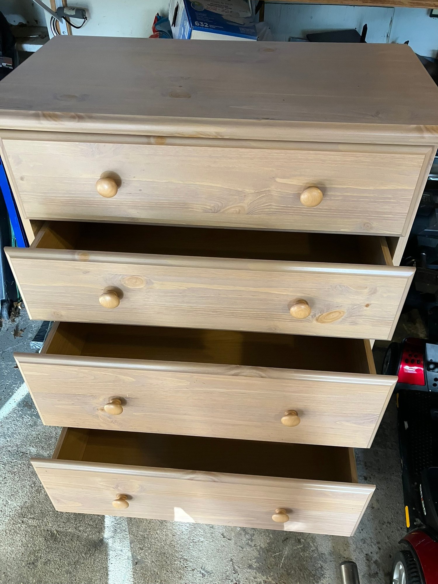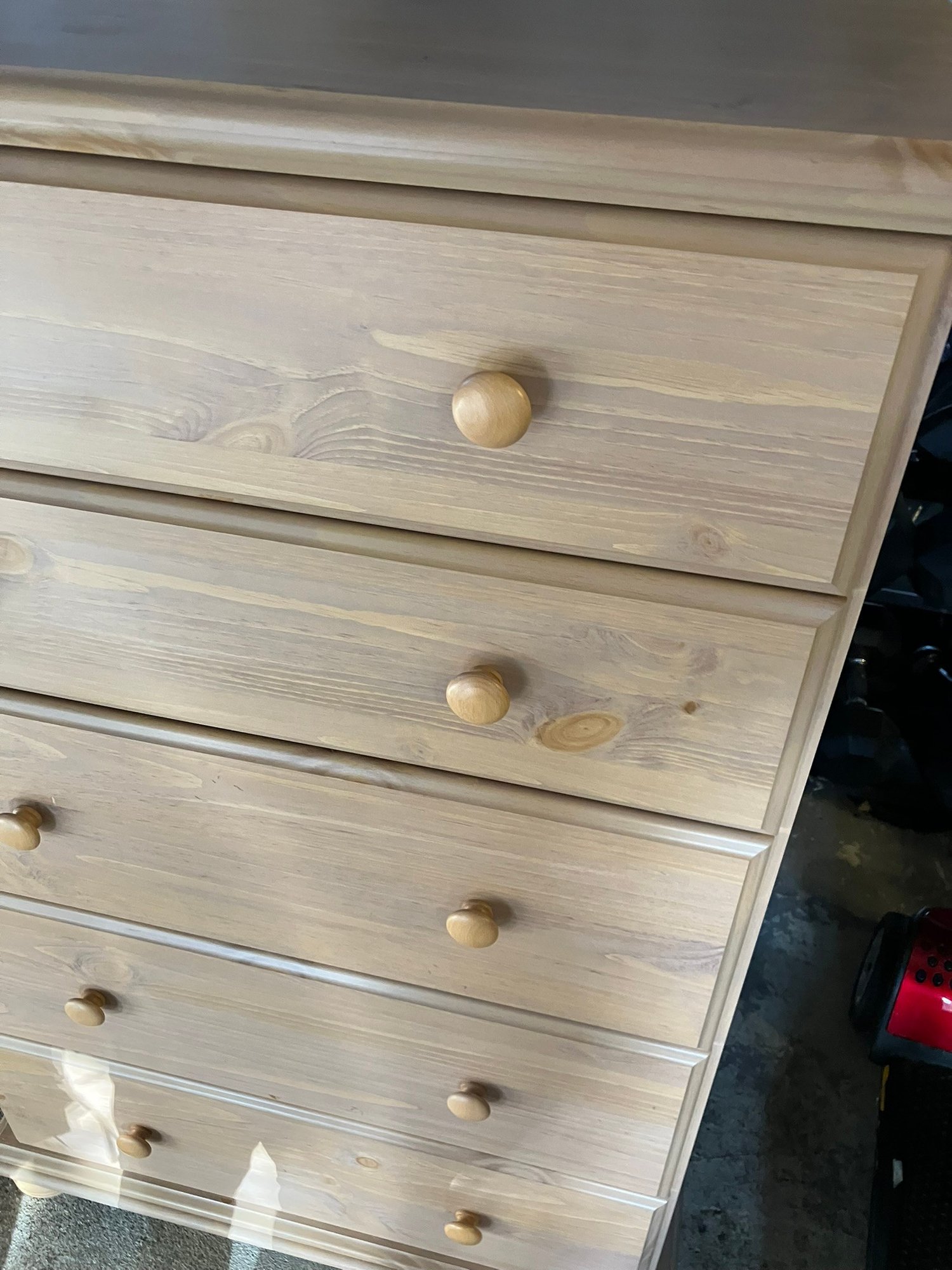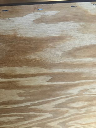 Maple Finish Dresser with 5 drawers, excellent condition. What happened with this dresser was, I went to move it, and the back of it is just cardboard, and because of that the (weak) cardboard broke, rendering this dresser into almost junk. SO, being the dad fix-it kinda guy that I am, I saddled up and rode off to Home Depot, and purchased a sheet of 1/4" plywood cut to exactly fit the back of the dresser. I then attached it with MANY staples using my battery-powered stapler. I hammered them all in, too, just to be sure none of them ended up sticking out.