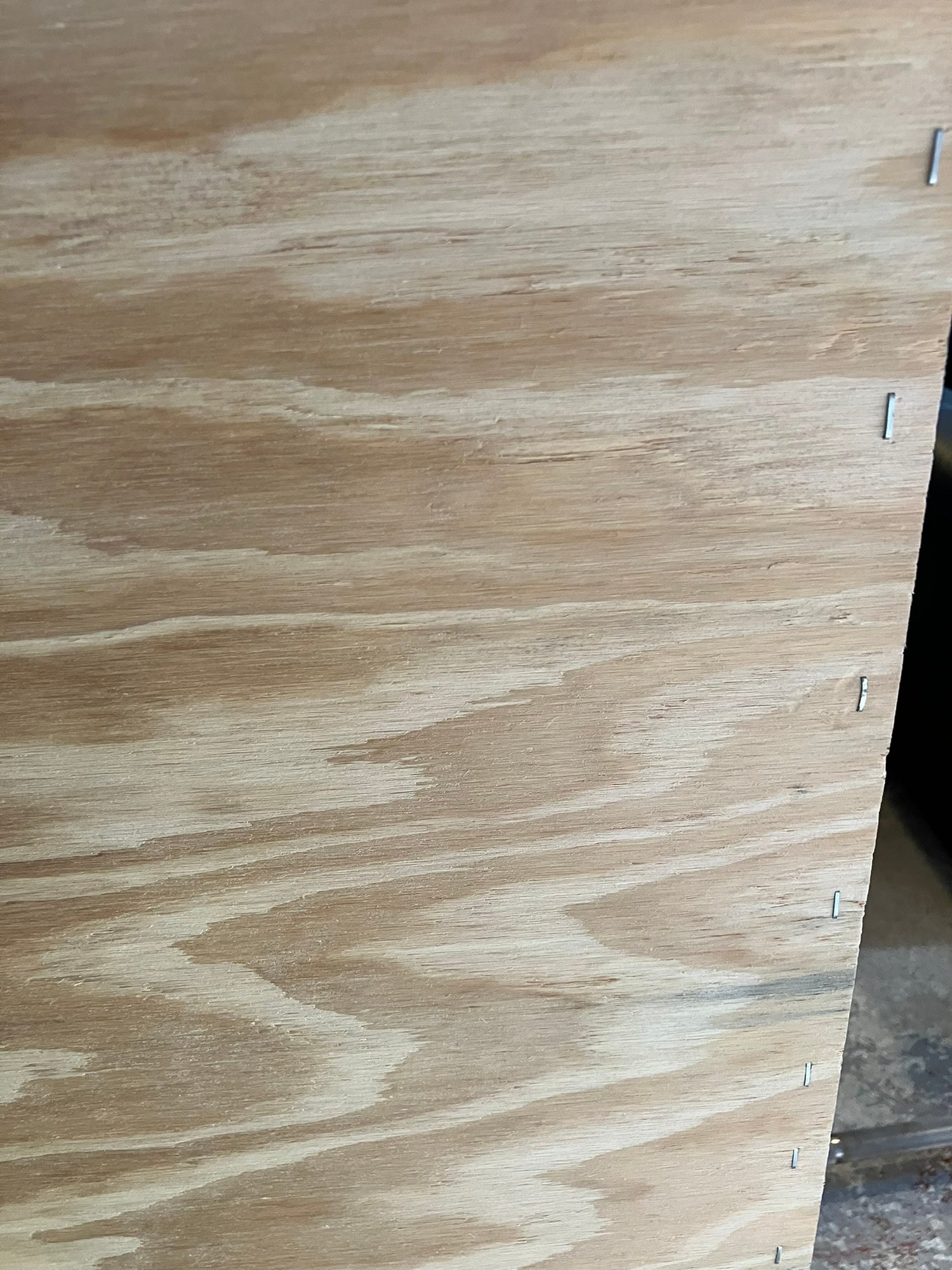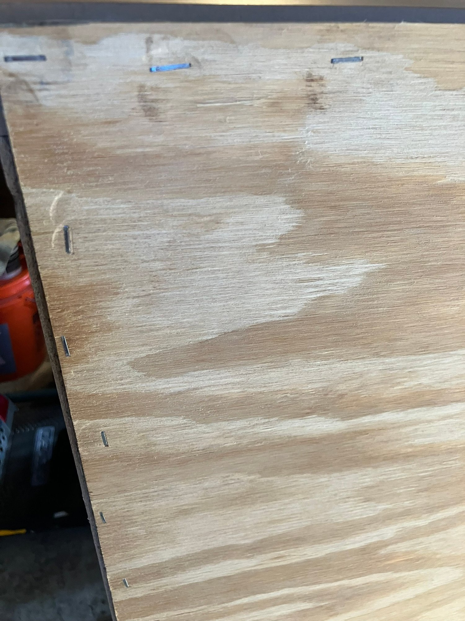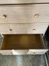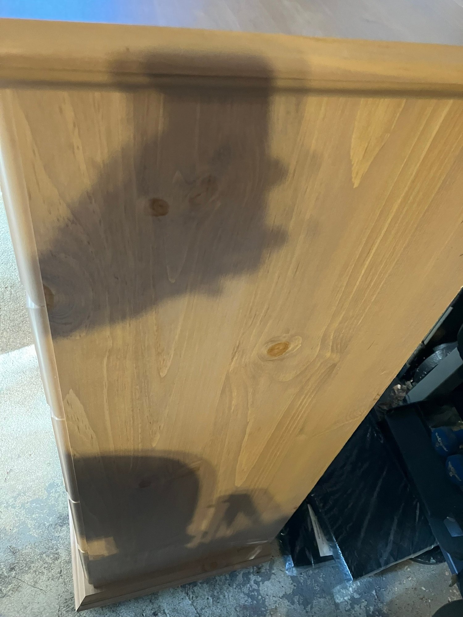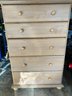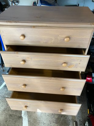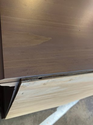 Maple Finish Dresser with 5 drawers, excellent condition. What happened with this dresser was, I went to move it, and the back of it is just cardboard, and because of that the (weak) cardboard broke, rendering this dresser into almost junk. SO, being the dad fix-it kinda guy that I am, I saddled up and rode off to Home Depot, and purchased a sheet of 1/4" plywood cut to exactly fit the back of the dresser. I then attached it with MANY staples using my battery-powered stapler. I hammered them all in, too, just to be sure none of them ended up sticking out.