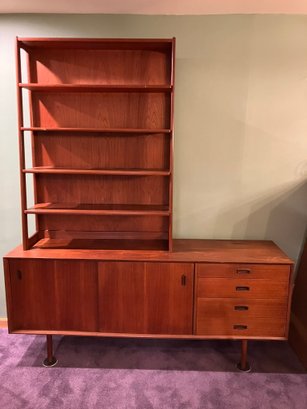 Mid-century Modern Horizontal Cabinet credenza/ buffet with matching freestanding bookcase. These got a little bit damaged during the move out. I tried to show that damage as well as possible in the pics. Other than that slight moving damage, the top of the horizontal cabinet has a some water damage; I tried to show this as best as possible in the pics. Other than that, these are both in fine condition. Measurements: the horizontal cabinet is 72" long x 18" wide x 84" high including the bookcase. It is only 30.75" high without the bookcase. It is only 21" high measured without its legs. The handles on the front of the unit are all 100% wood. Each of the four internal large shelves/cavities on the left side of the cabinet is about 15" deep. The four drawers on the right side all measure 20.75" wide x 15.25" deep. Note that the top drawer is divided into four compartments.