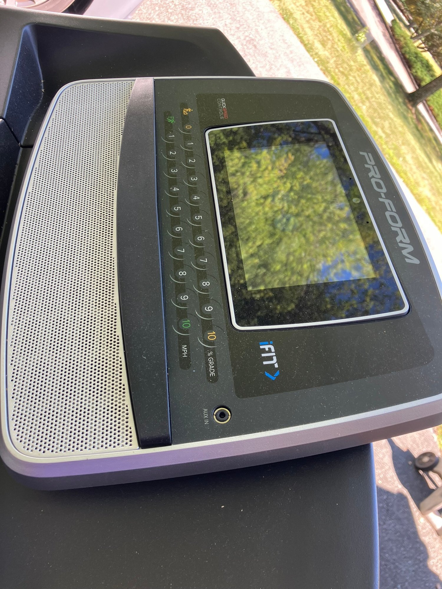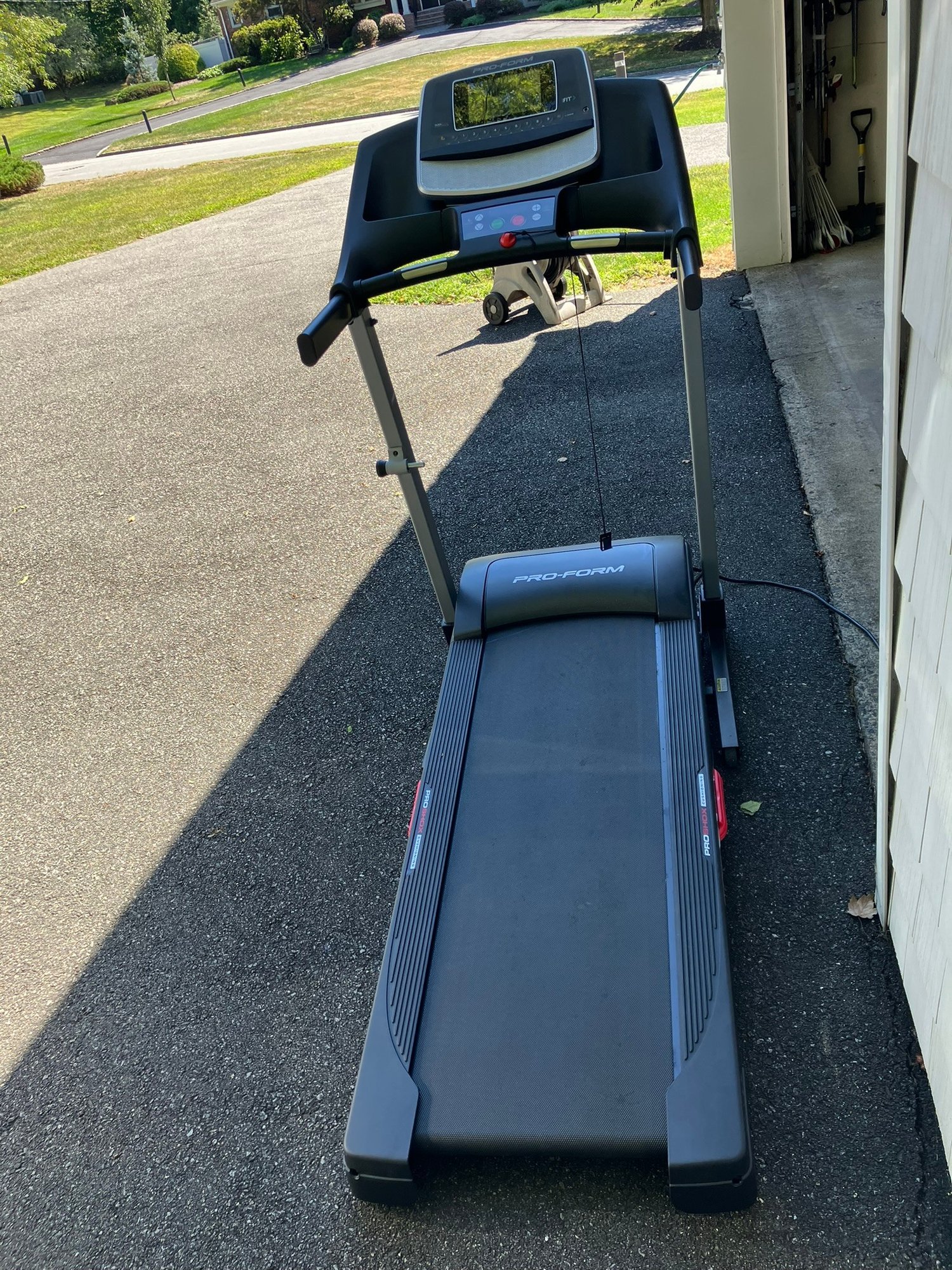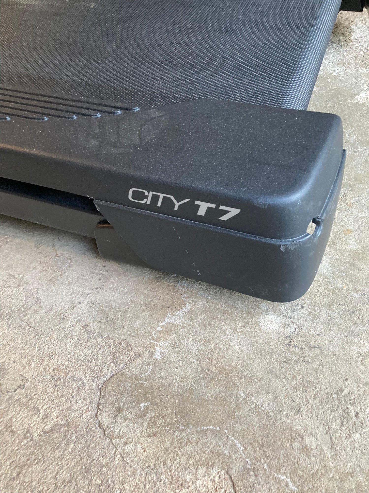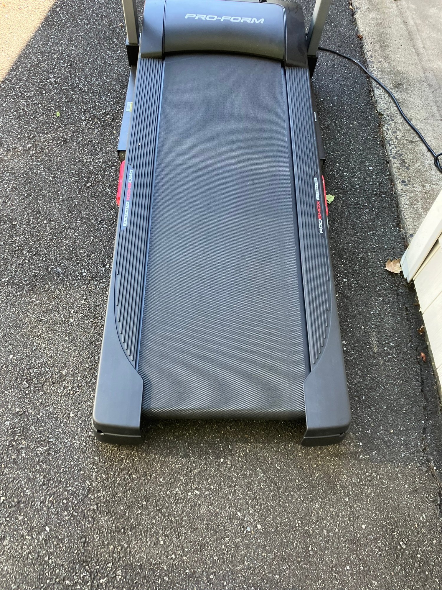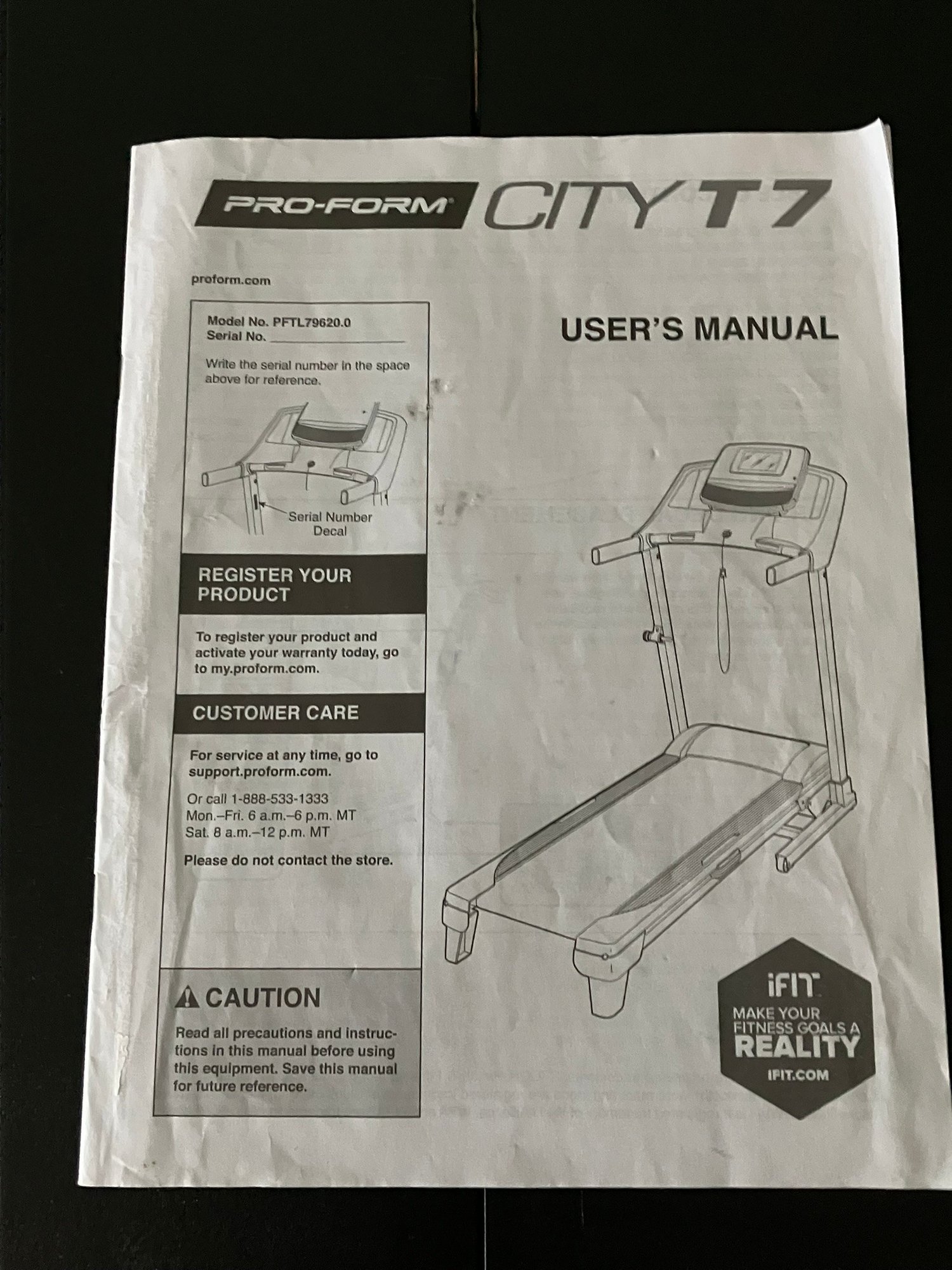 ProForm City T7 Treadmill, with height & speed adjustments. This is in excellent condition. It can also measure your heart rate through the hand grips. The treadmill folds up and then you can move it around on these little wheels it has. Cool stuff. Also, I recently found the manual so that's included as well.