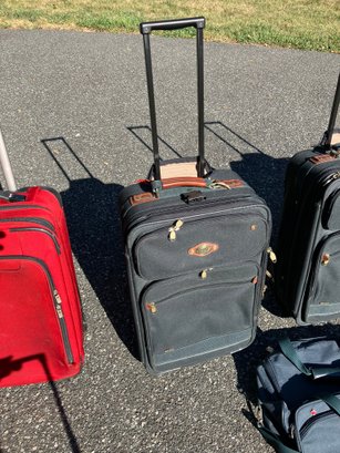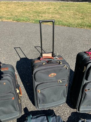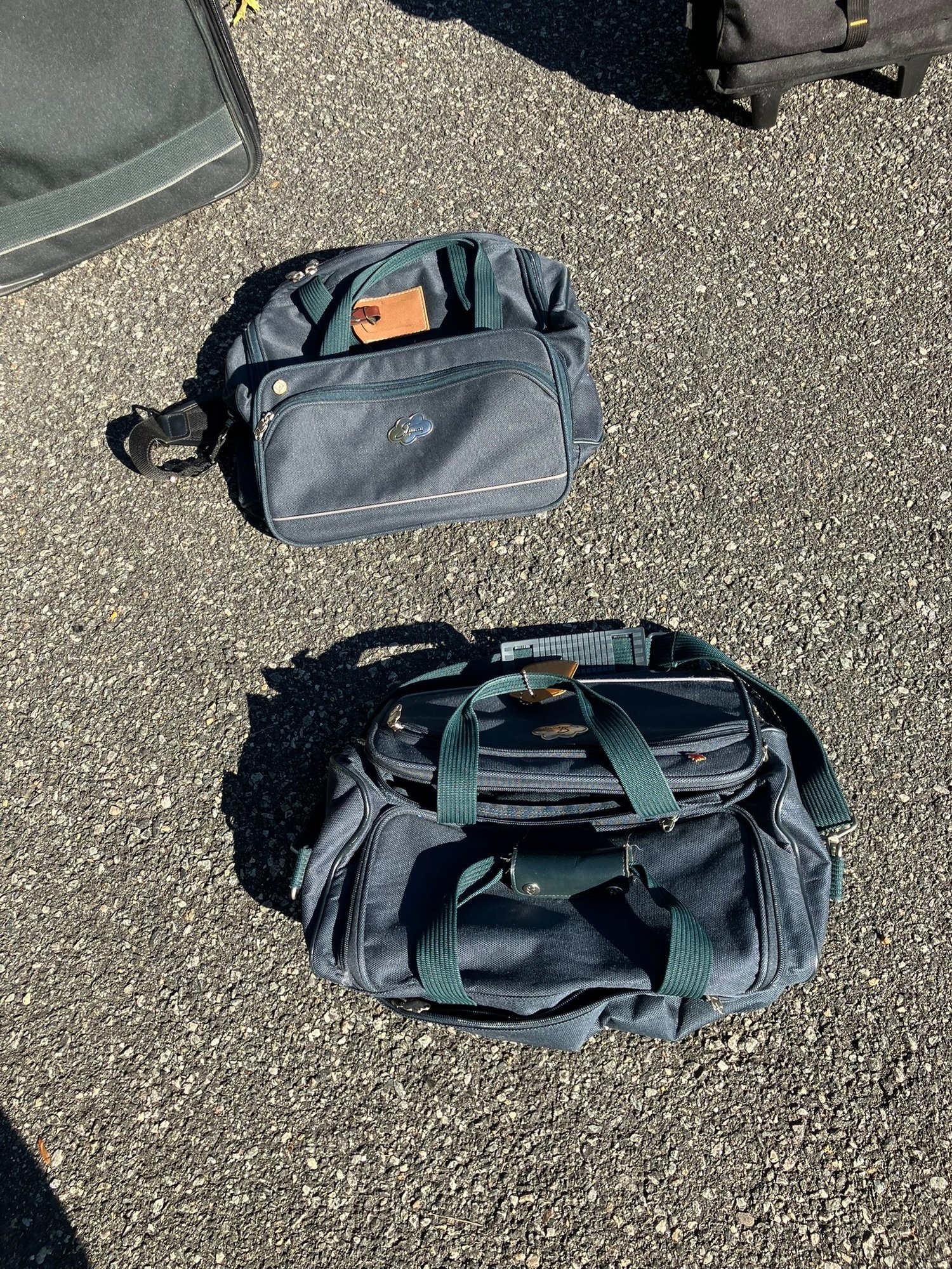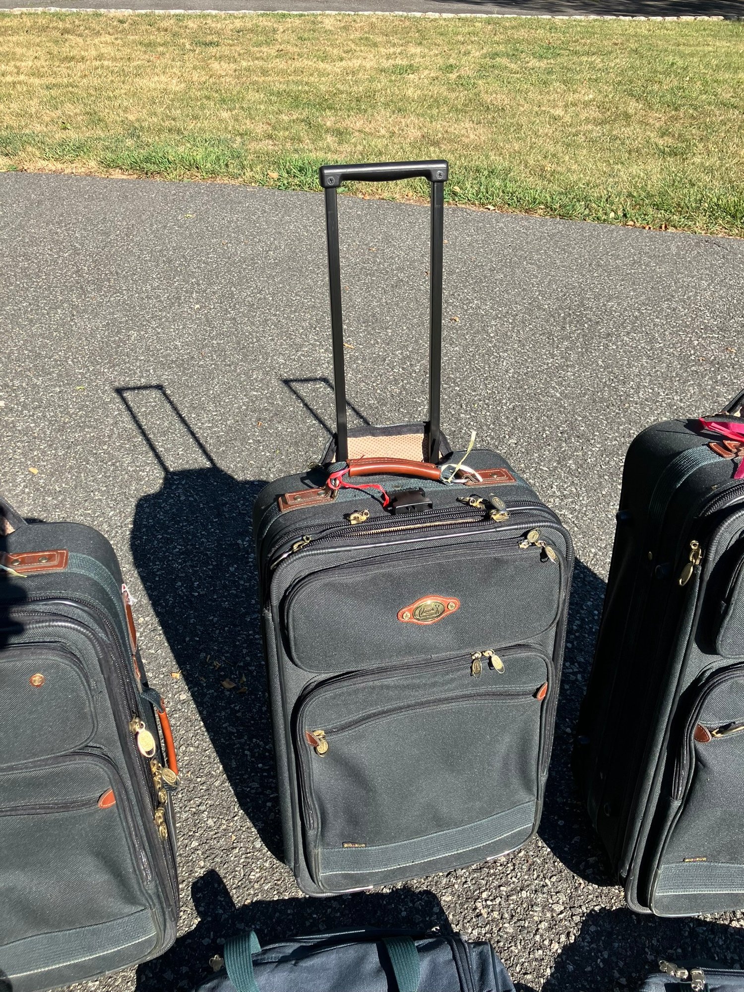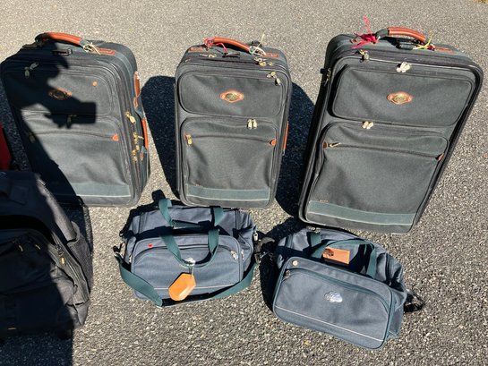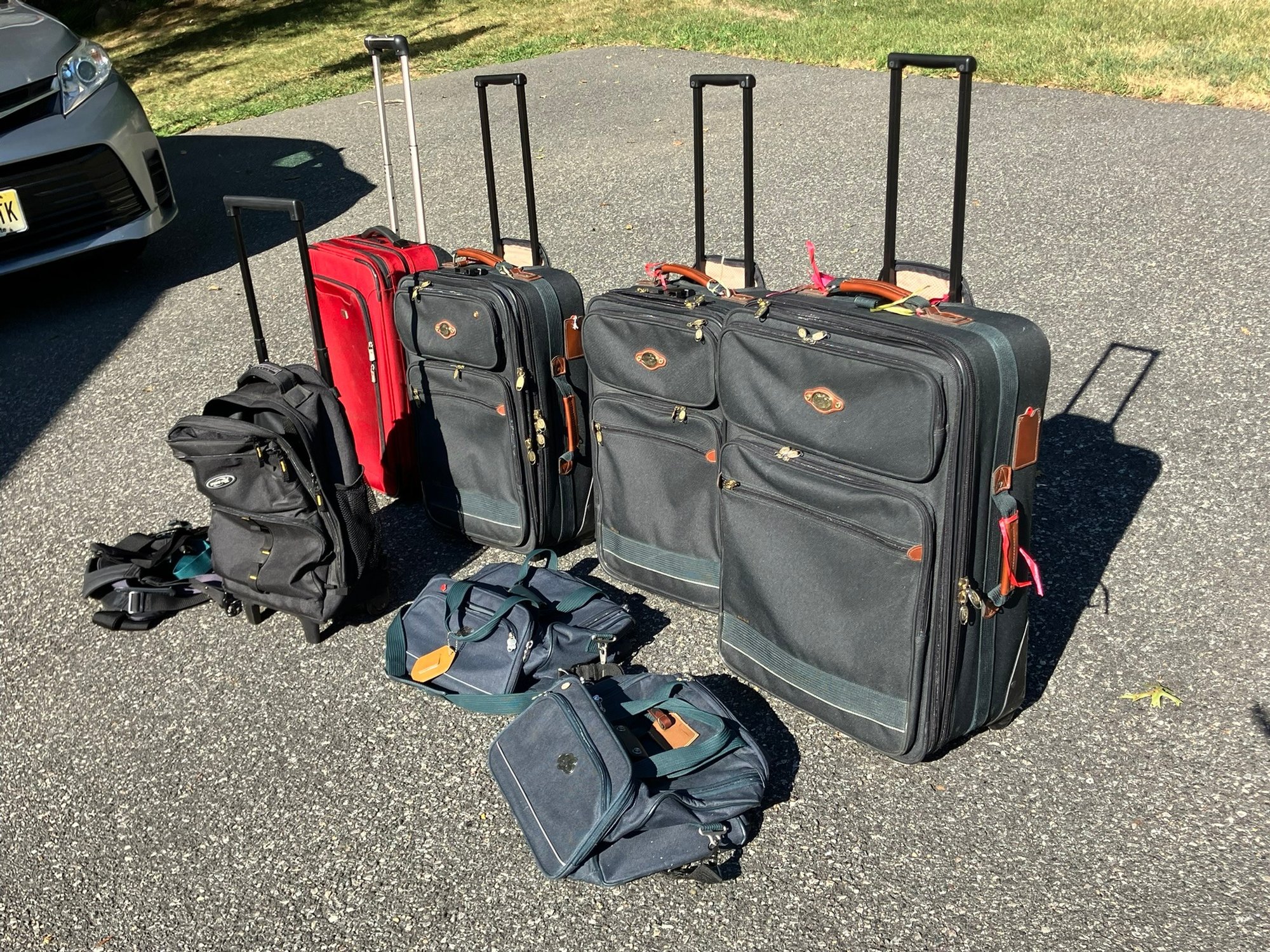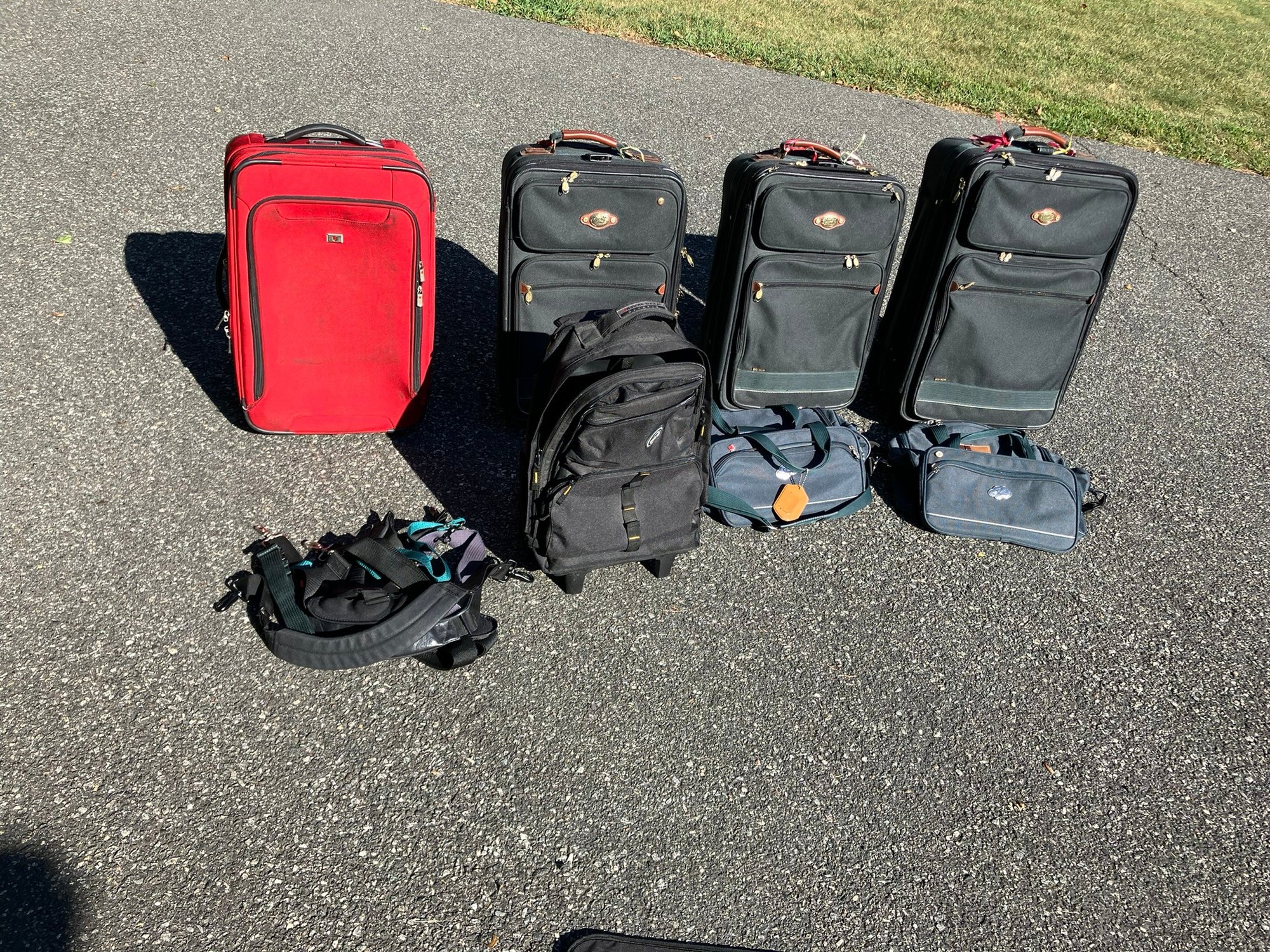 Set of Luggage: 1 large, 3 carry-on, 2 small duffels, a garment bag, and a backpack. The three green pieces, namely, the large (18"x8"x25") and twp "carry-ons" (22"x7"x15") are all by Ricardo of Hollywood. The other Carry-on is a Victorinox carry-on, same size as the other carry-ons (22"x7"x15"). The two smaller duffel-style bags (18"x12"x6") are both Skyway. Finally the backpack is a Sports Plus/Olympia. Nice stuff. And in Excellent condition. The backpack is currently full of straps for the other pieces of luggage, that's what the pile of straps pic is all about.