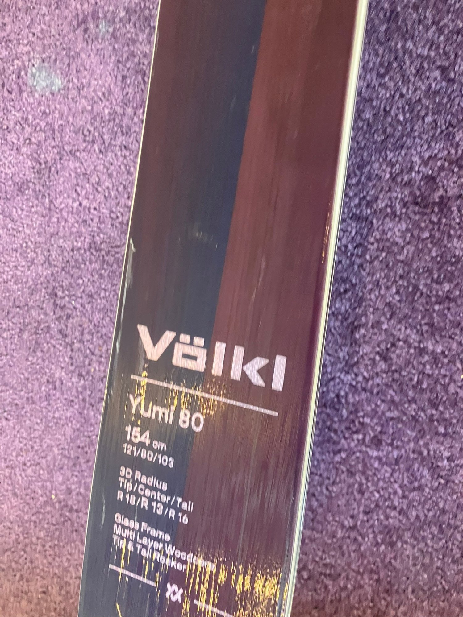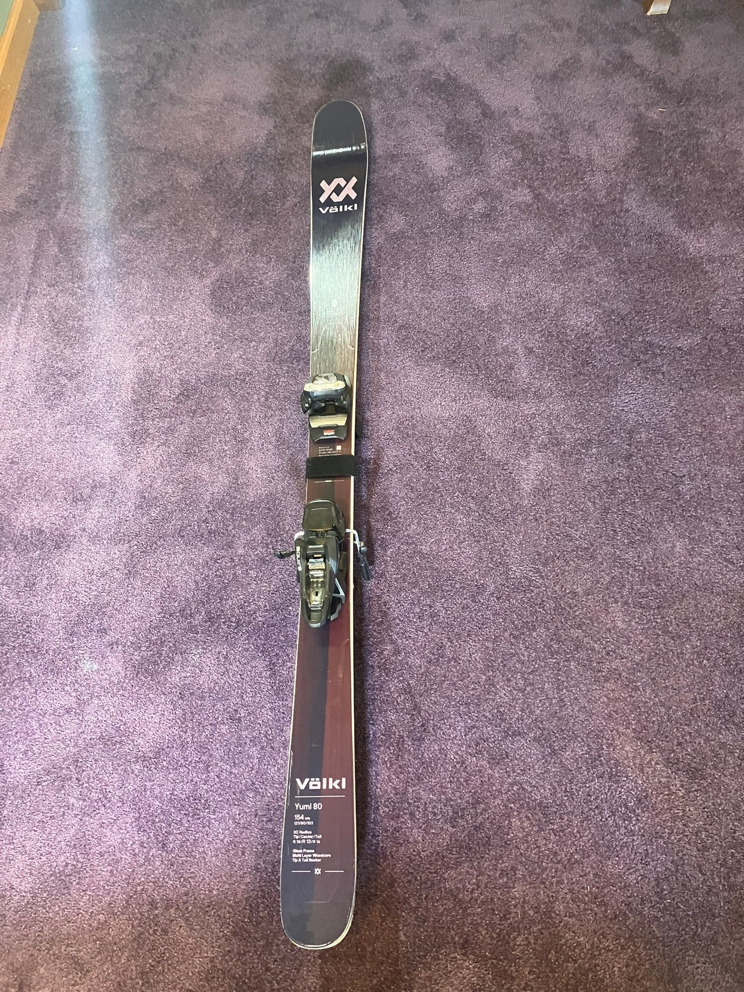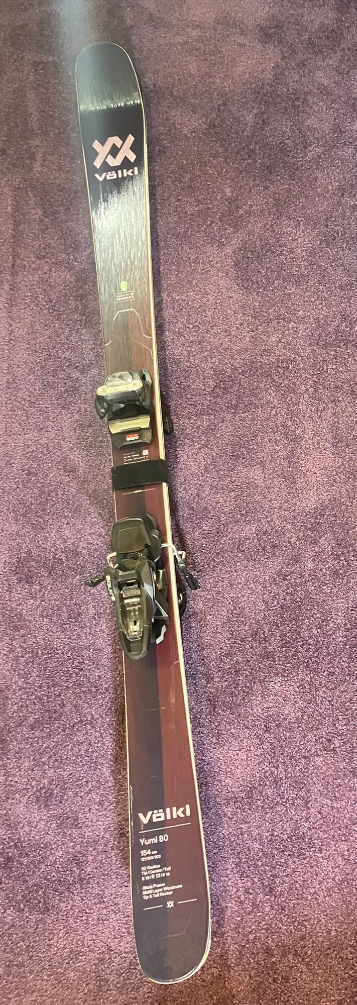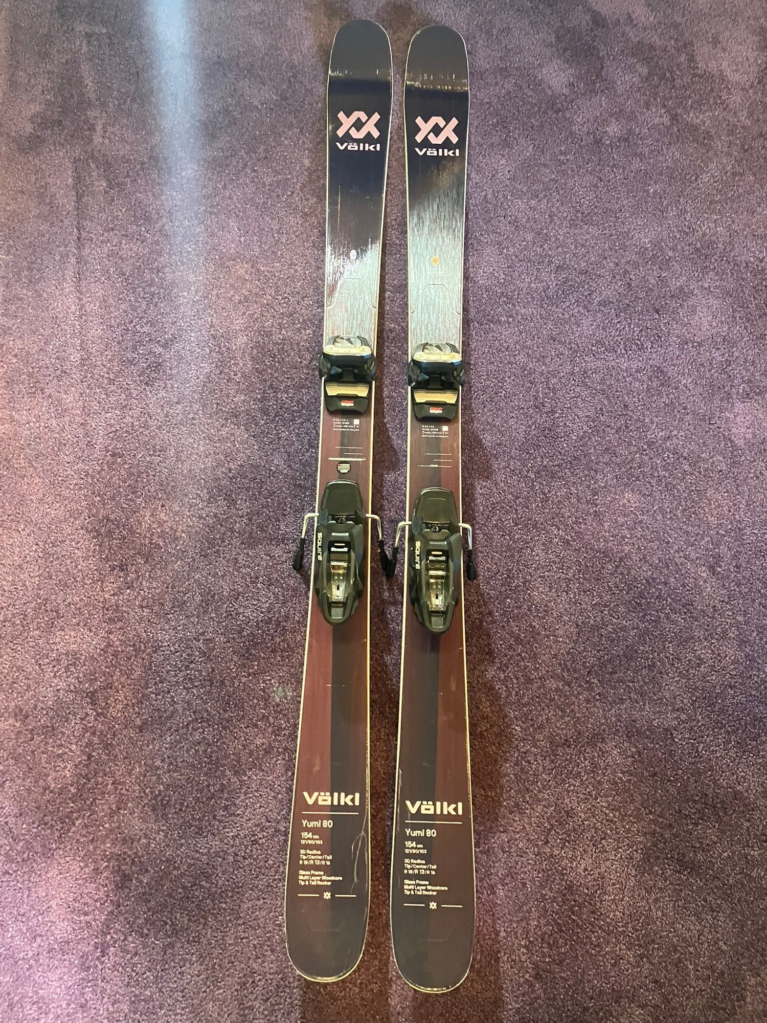 Volkl Women's Yumi 80 Skis 154cm long, with installed marker bindings, near-mint condition. These have almost zero usage on them--unfortunately my wife had the bindings cranked up way too high and she fell during her first 100 feet of skiing for the year and injured herself, and they haven't been used since then. These skis literally have less use on them than a pair of skis that have been demo'ed for one run. Anyway. Make sure you adjust the bindings to match your skill level and body type before using them!