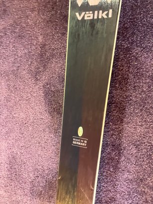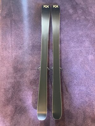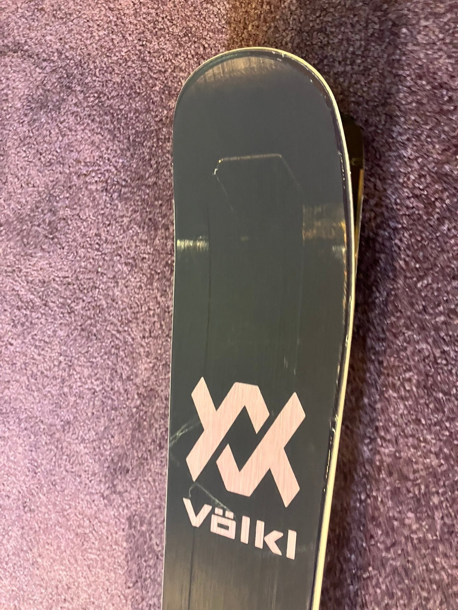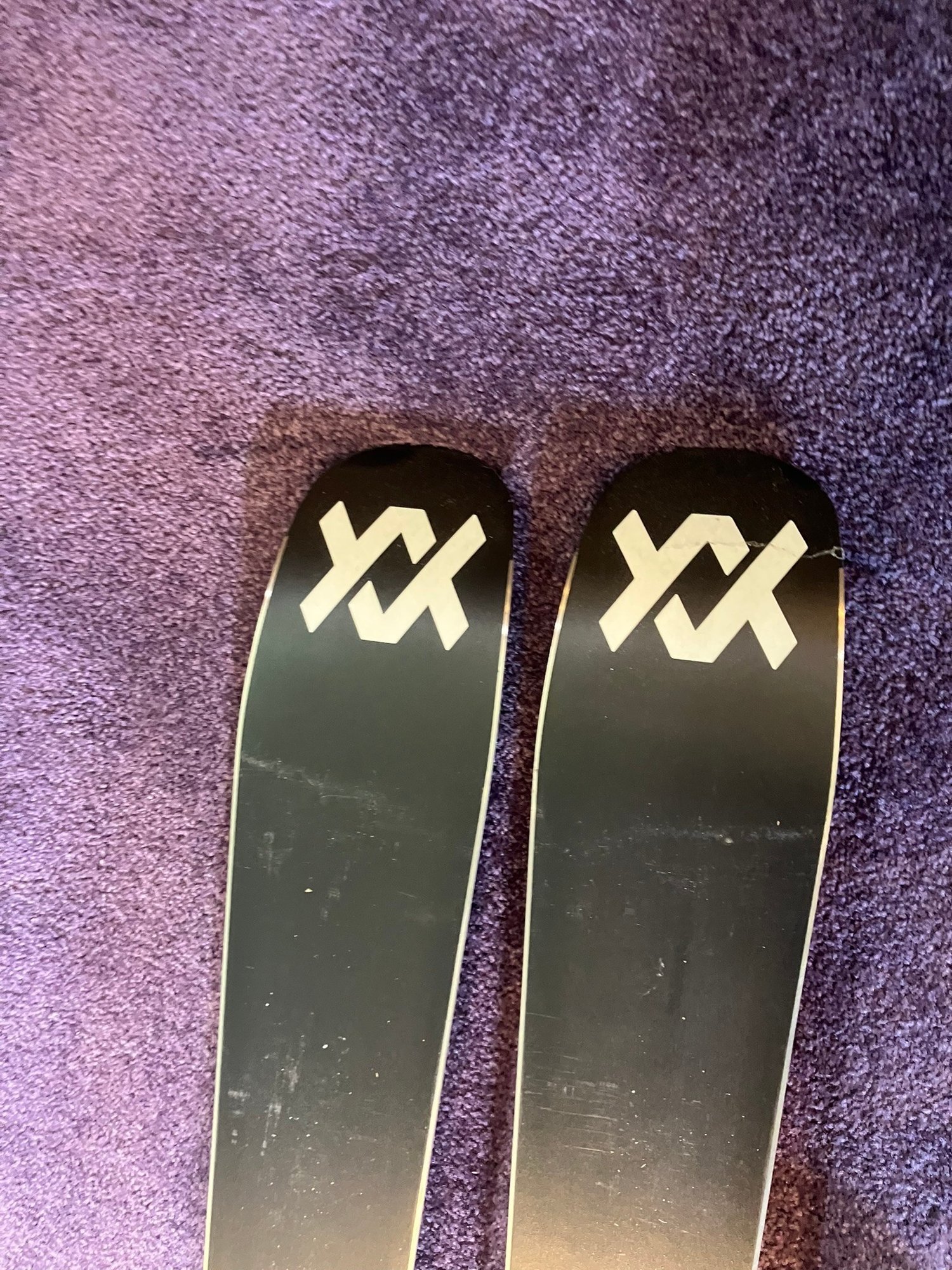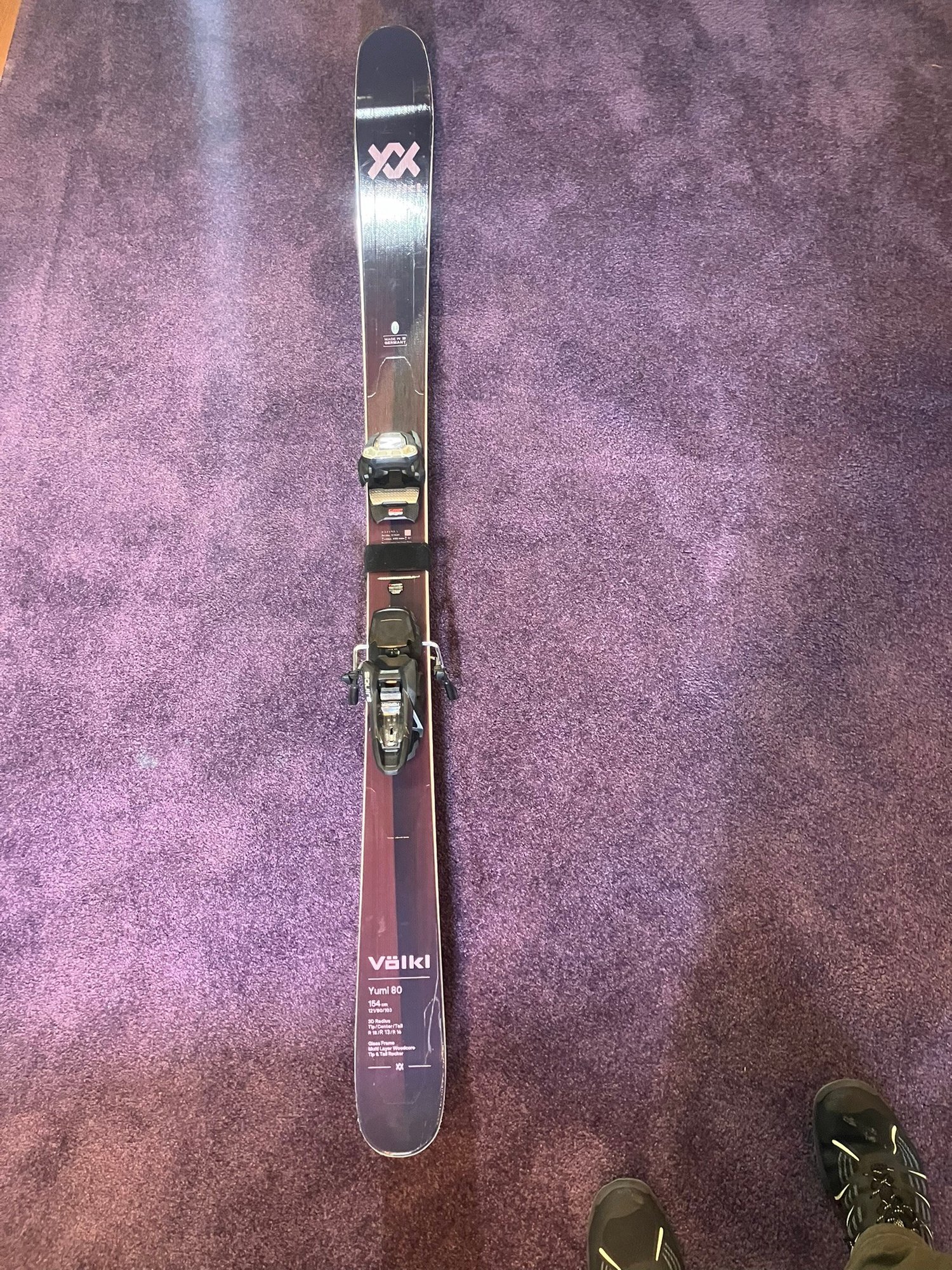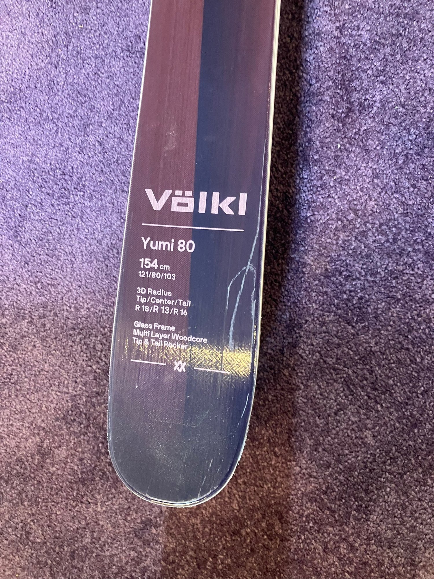 Volkl Women's Yumi 80 Skis 154cm long, with installed marker bindings, near-mint condition. These have almost zero usage on them--unfortunately my wife had the bindings cranked up way too high and she fell during her first 100 feet of skiing for the year and injured herself, and they haven't been used since then. These skis literally have less use on them than a pair of skis that have been demo'ed for one run. Anyway. Make sure you adjust the bindings to match your skill level and body type before using them!