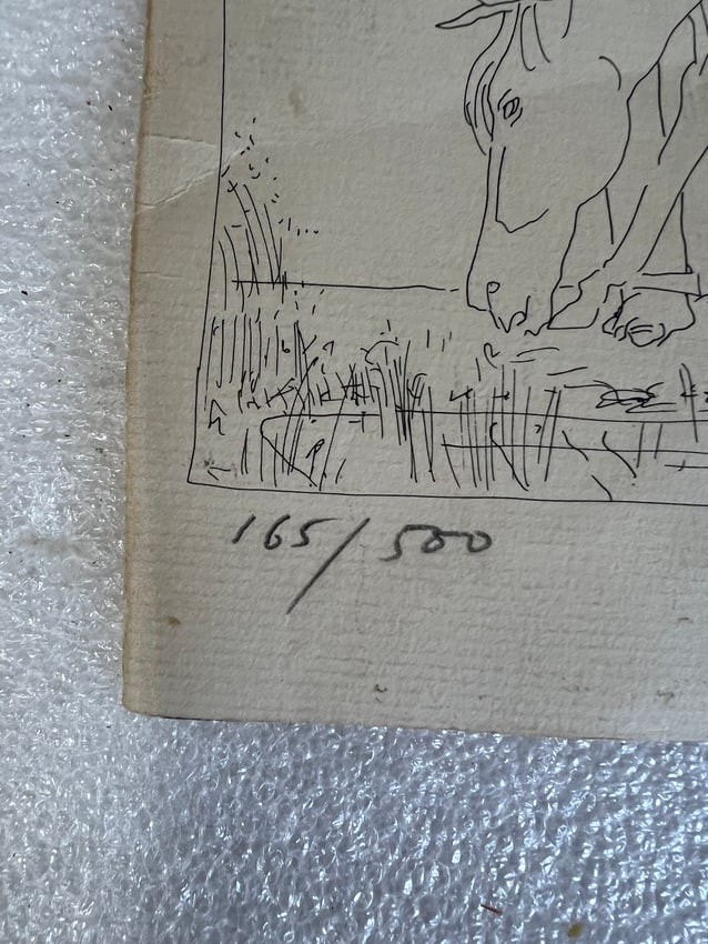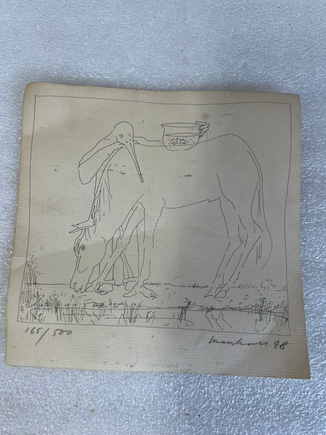 Numbered 165/500 Sgd. lower right Marshall.. Amusing. Goldfish bowl on the back of a horse and a large bird is about to prey. 6 1/2"H x 7"W