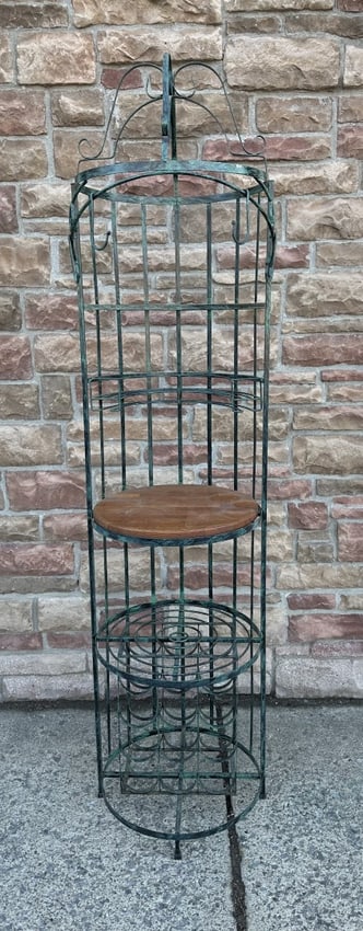 Circular painted iron corner bar rack. Butcher block wood shelf. Lower wine rack;
