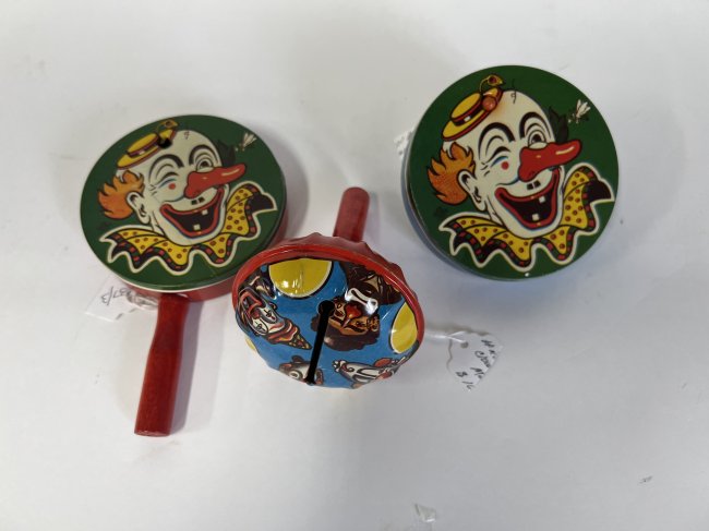 Three in the lot . Two round with handle and clown face. One with four different clown faces at the top.