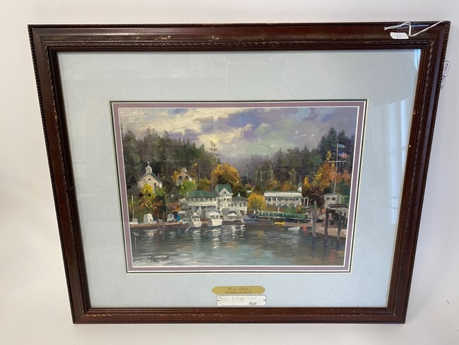 Signed T. Kinkade Lower left and numbered 152/905. Gallery double matted and framed. With a brass identification plaque at front marked Thomas Kinkade and entitled Roche Harbor. Overall size. 15 1/2"H x 19 1/2"W