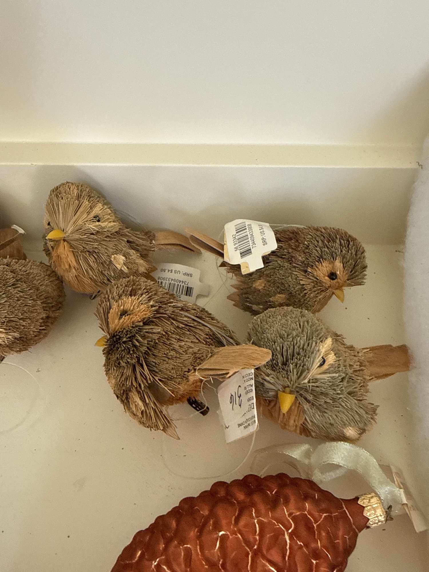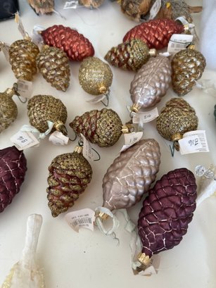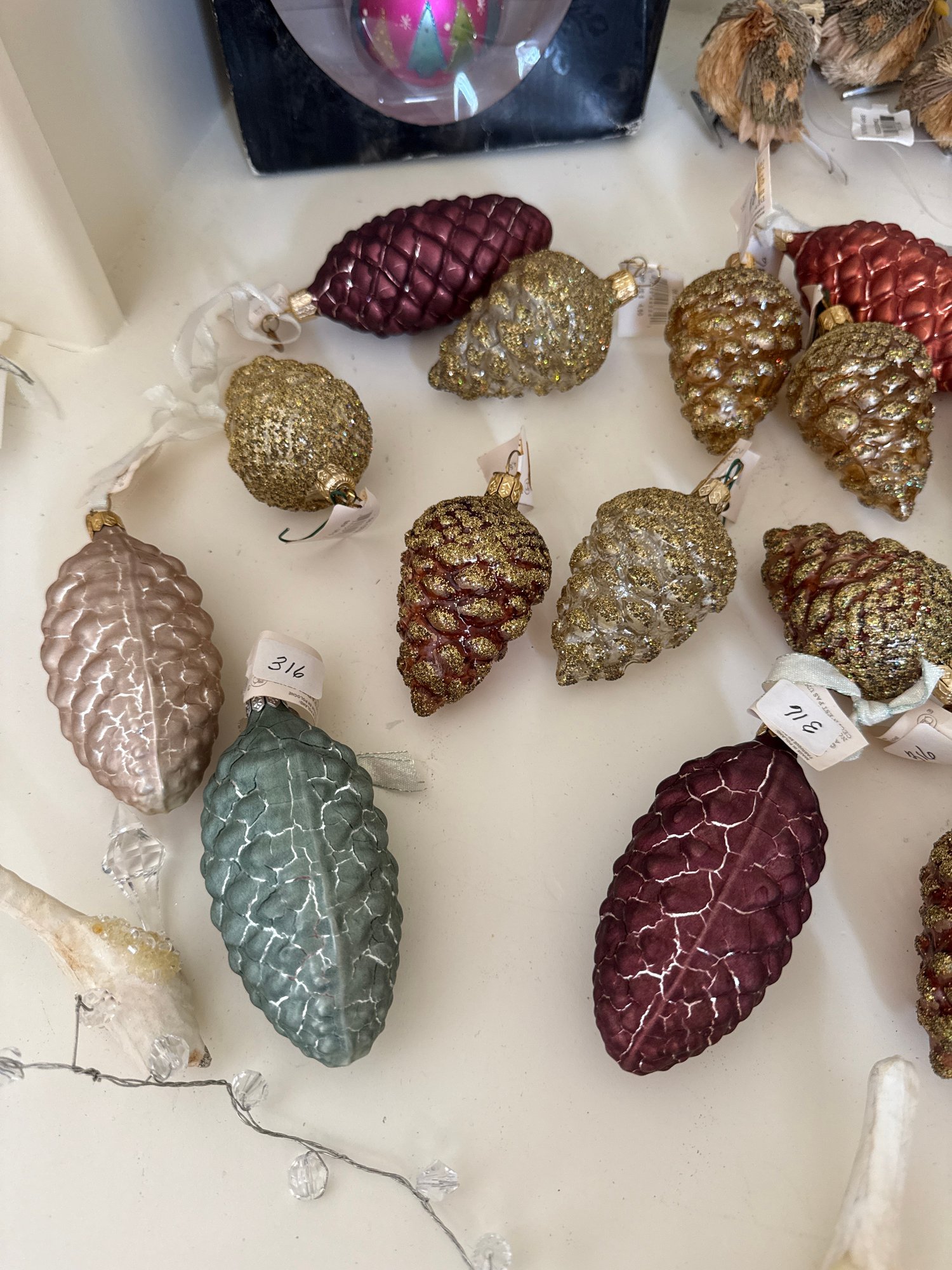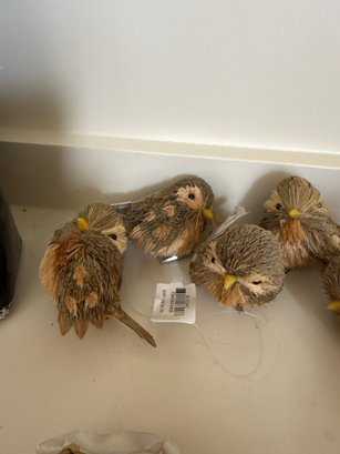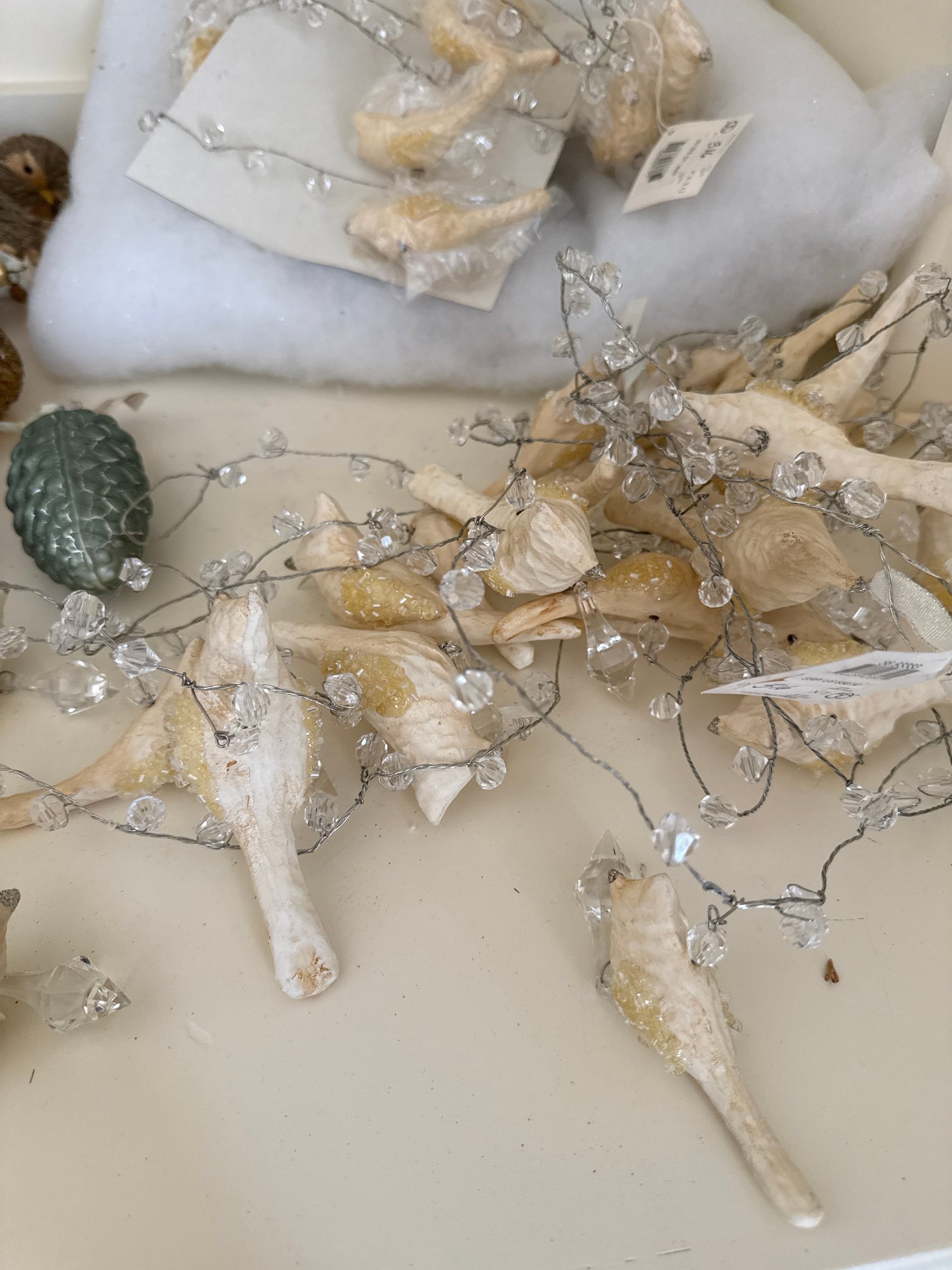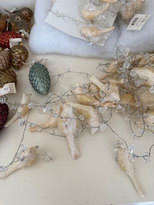 Lot contains an array of fragile acorn ornaments, small bird decor with clips for a Christmas tree, and Ice Crystal Bird Garland. See photos for detail. Local pickup or courier shipping available – please see shipping terms for details.