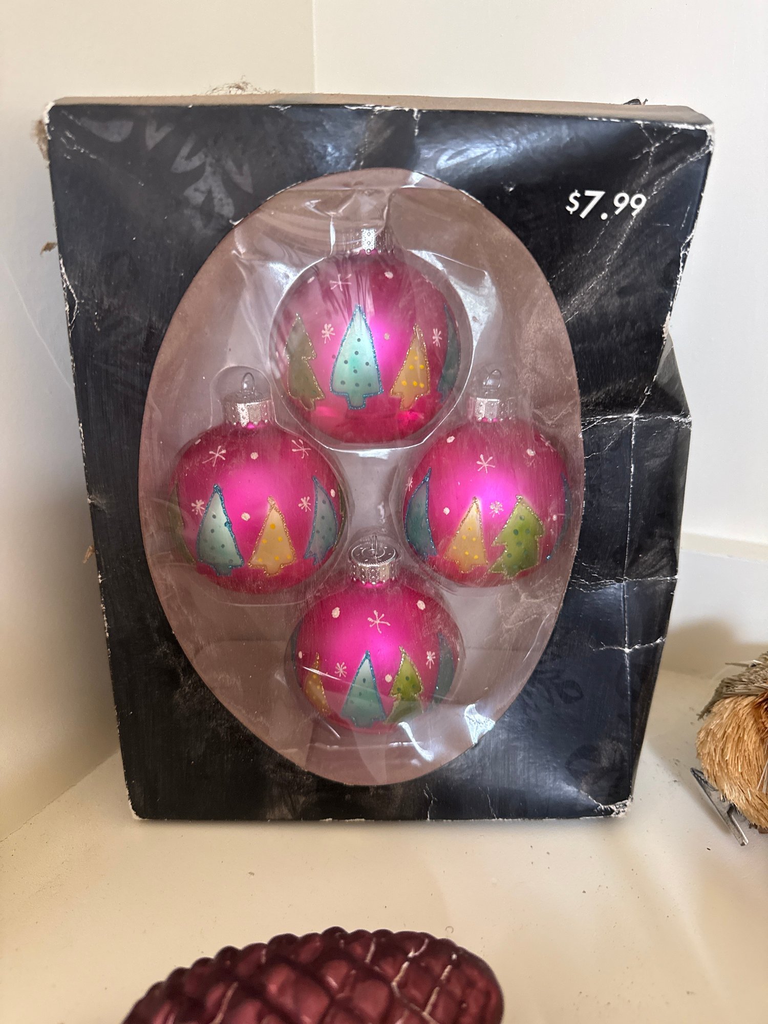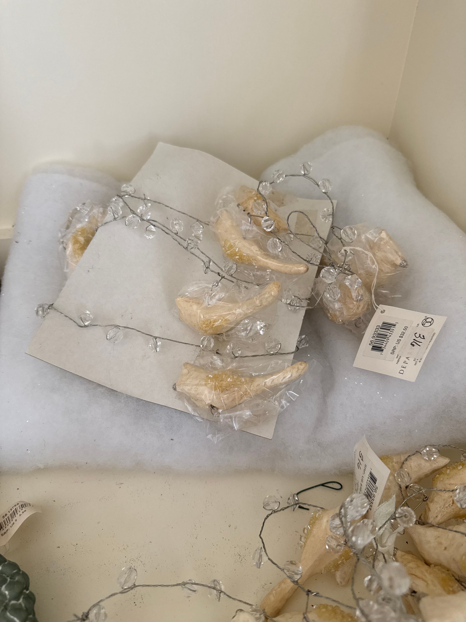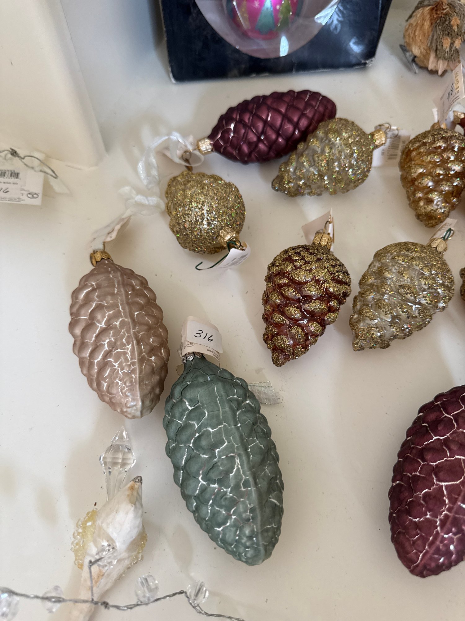 Lot contains an array of fragile acorn ornaments, small bird decor with clips for a Christmas tree, and Ice Crystal Bird Garland. See photos for detail. Local pickup or courier shipping available – please see shipping terms for details.
