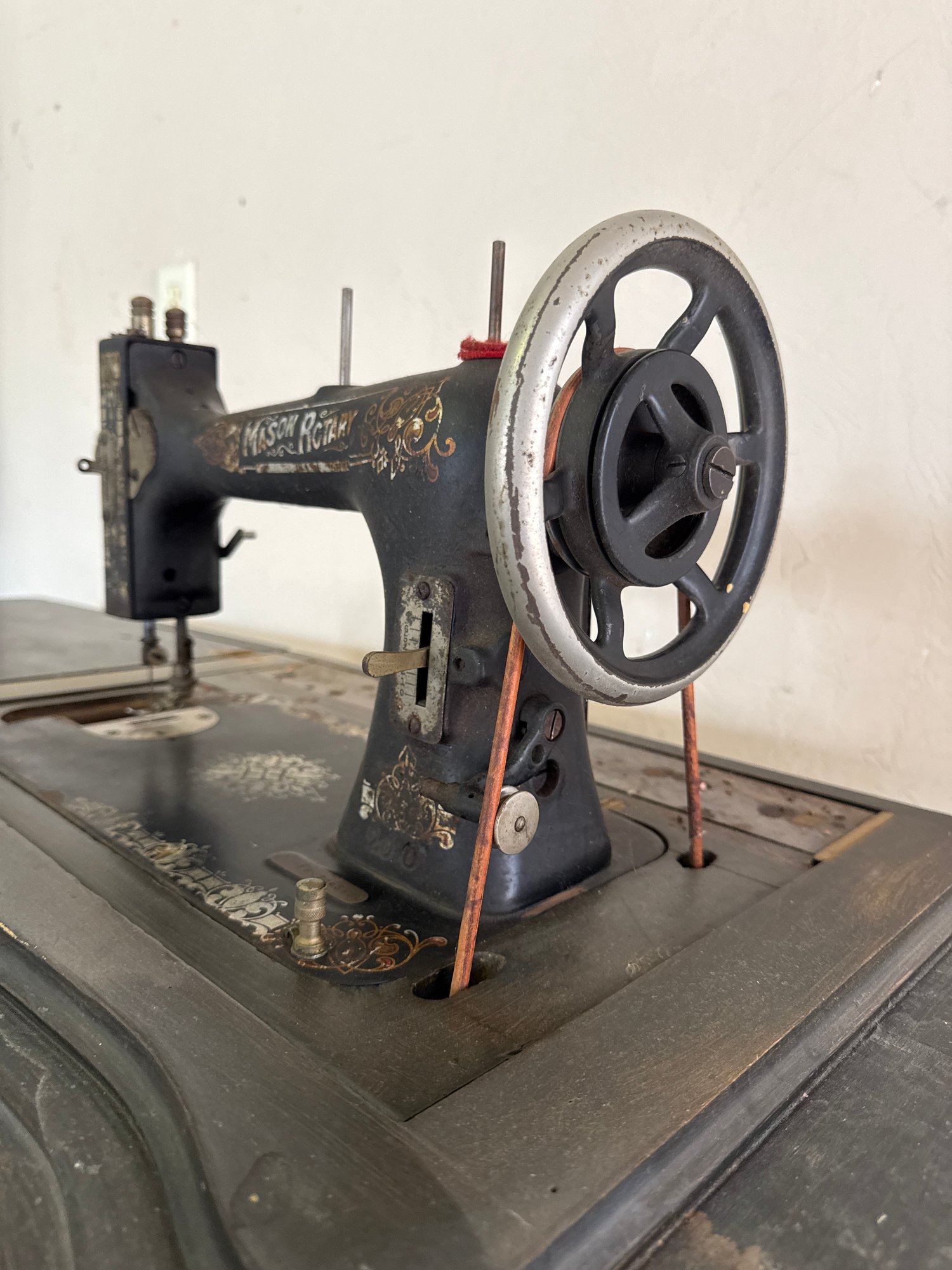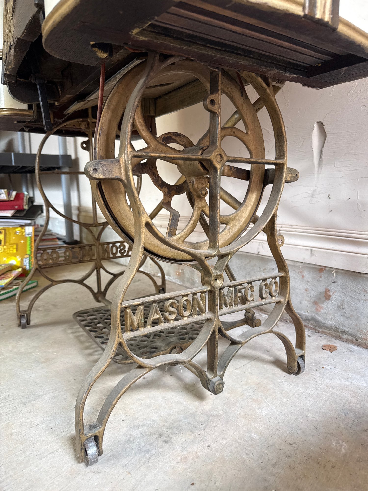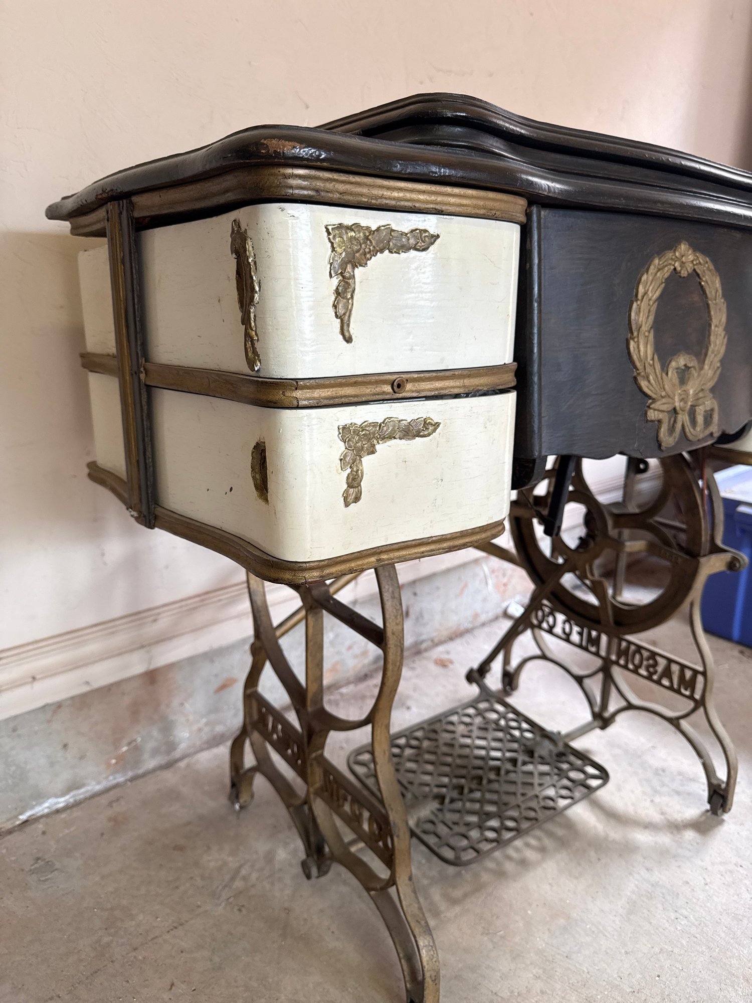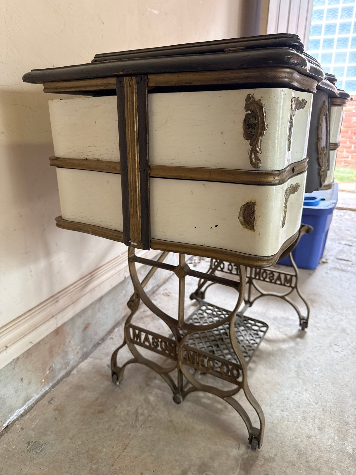 This lot contains an Antique A.G. Mason Rotary Treadle Sewing Machine a with white cabinet drawers. This is a very intact mason sewing machine. It is Untested! Please be prepared for pickup. Local Pickup Only.