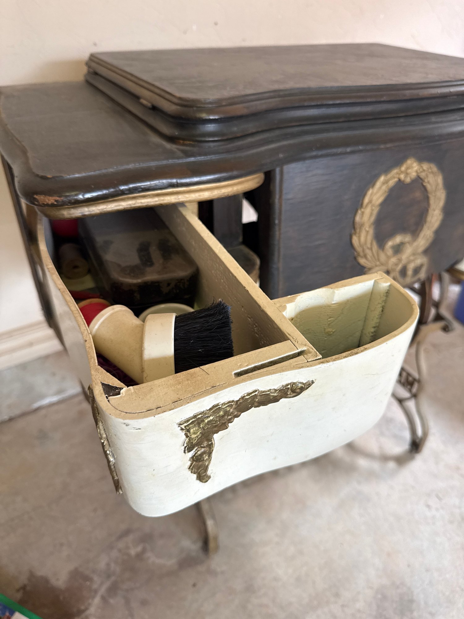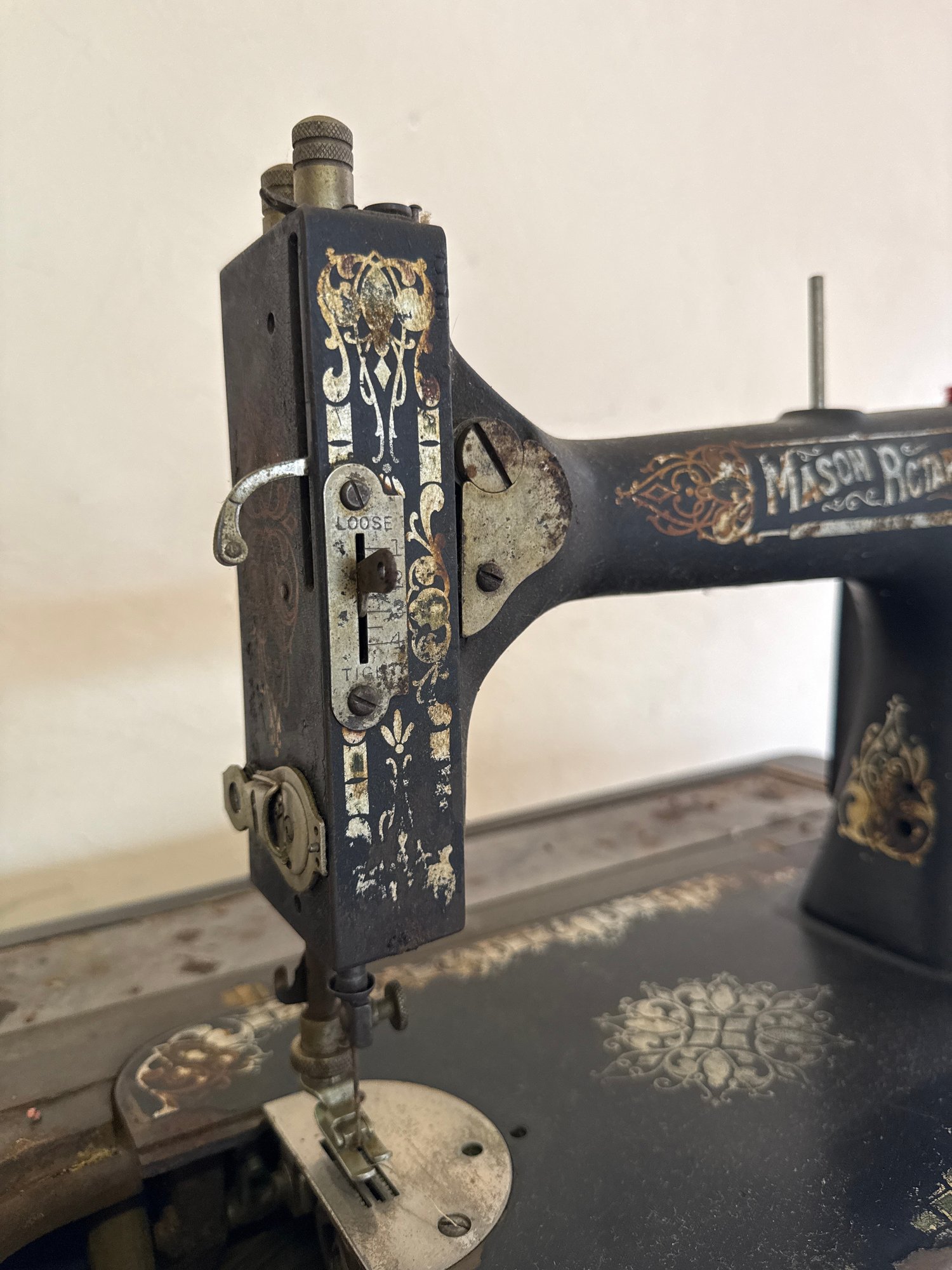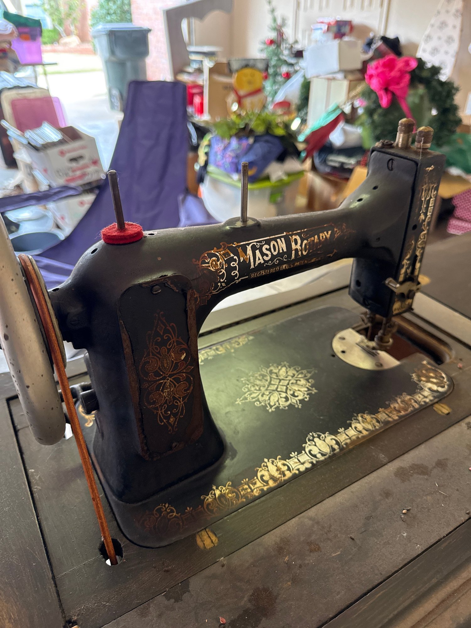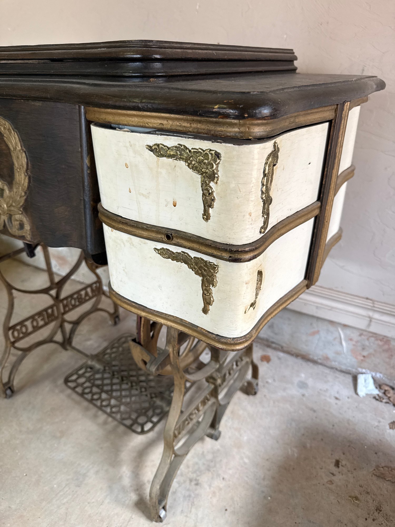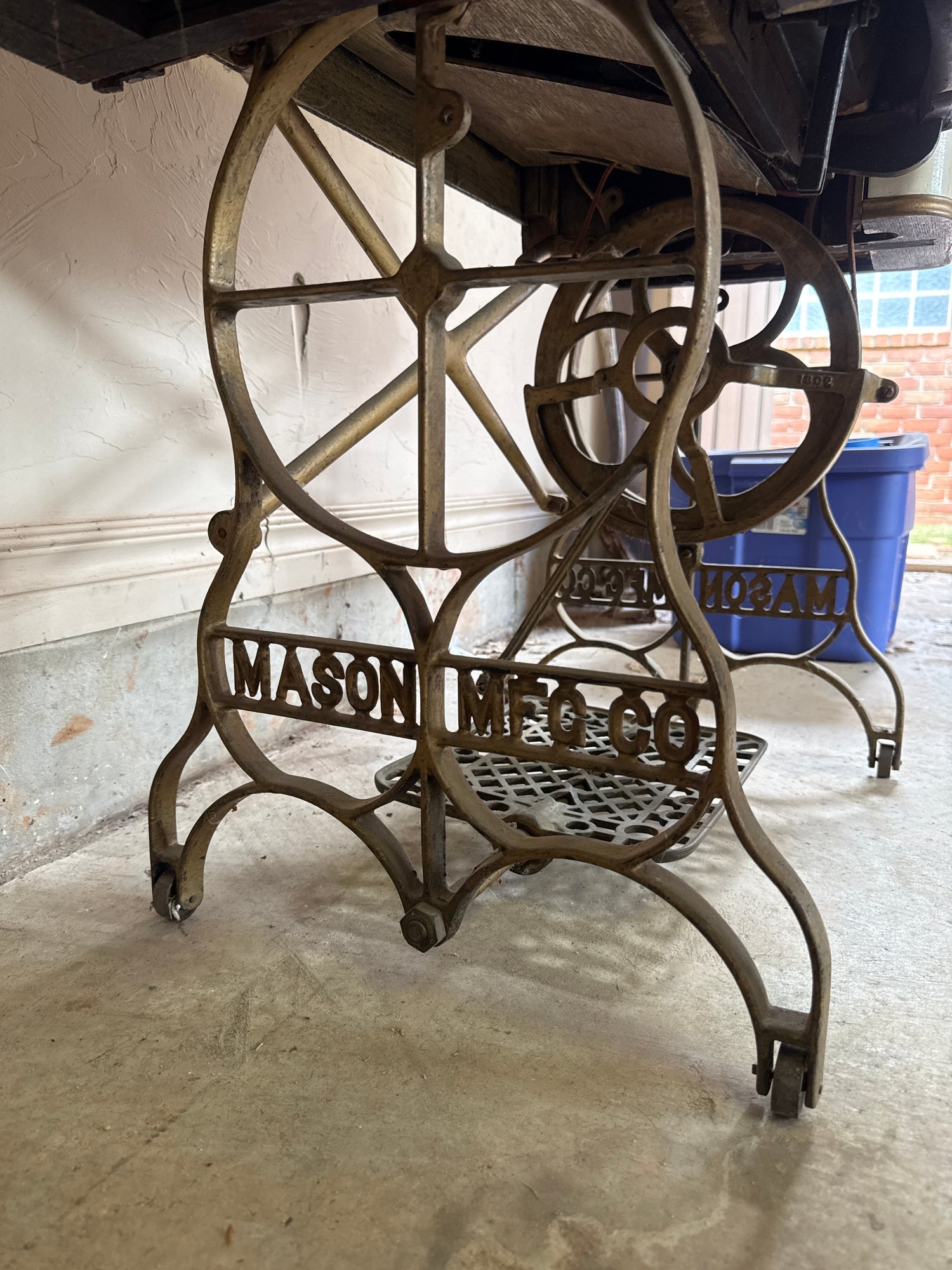This lot contains an Antique A.G. Mason Rotary Treadle Sewing Machine a with white cabinet drawers. This is a very intact mason sewing machine. It is Untested! Please be prepared for pickup. Local Pickup Only.