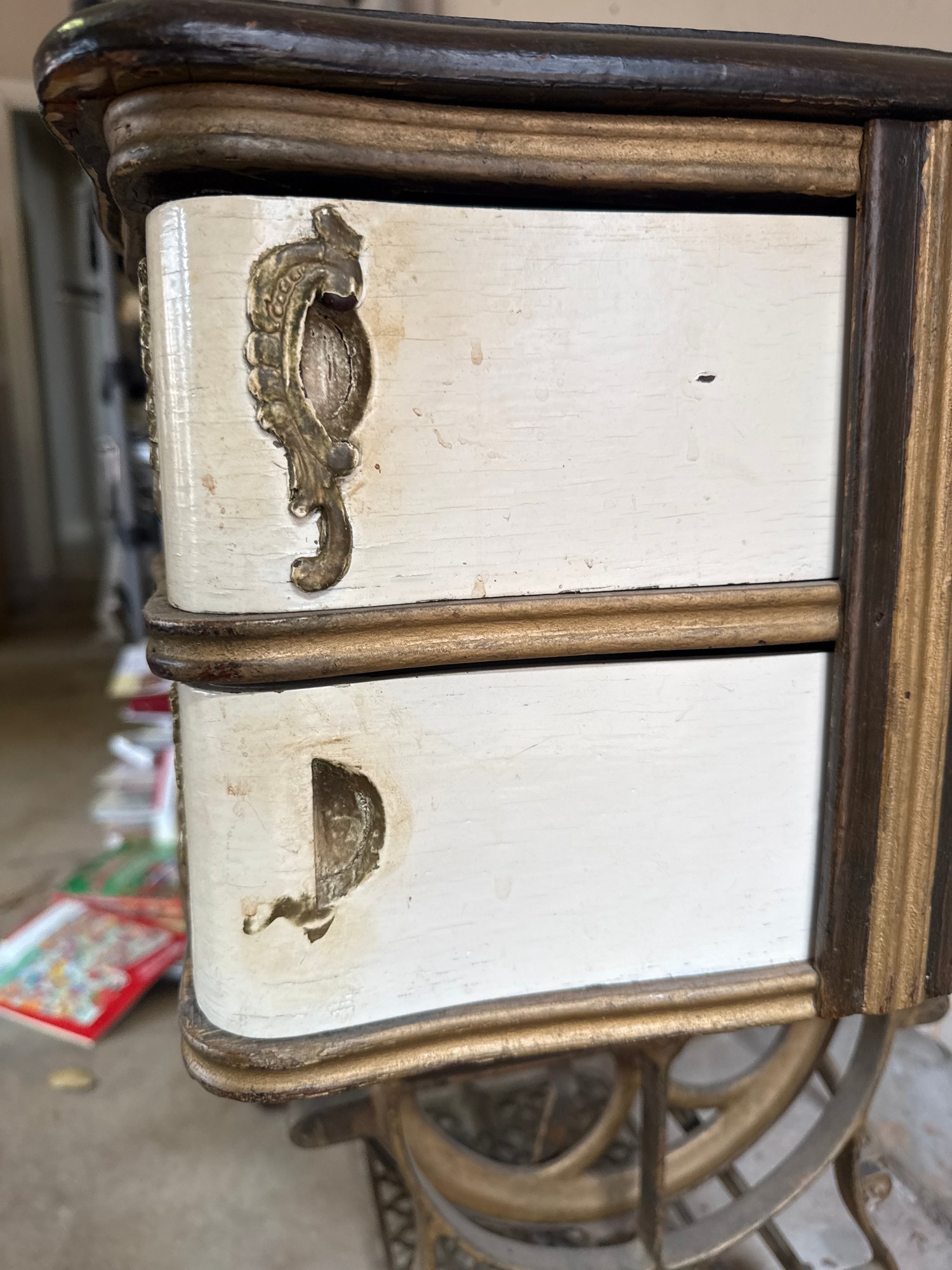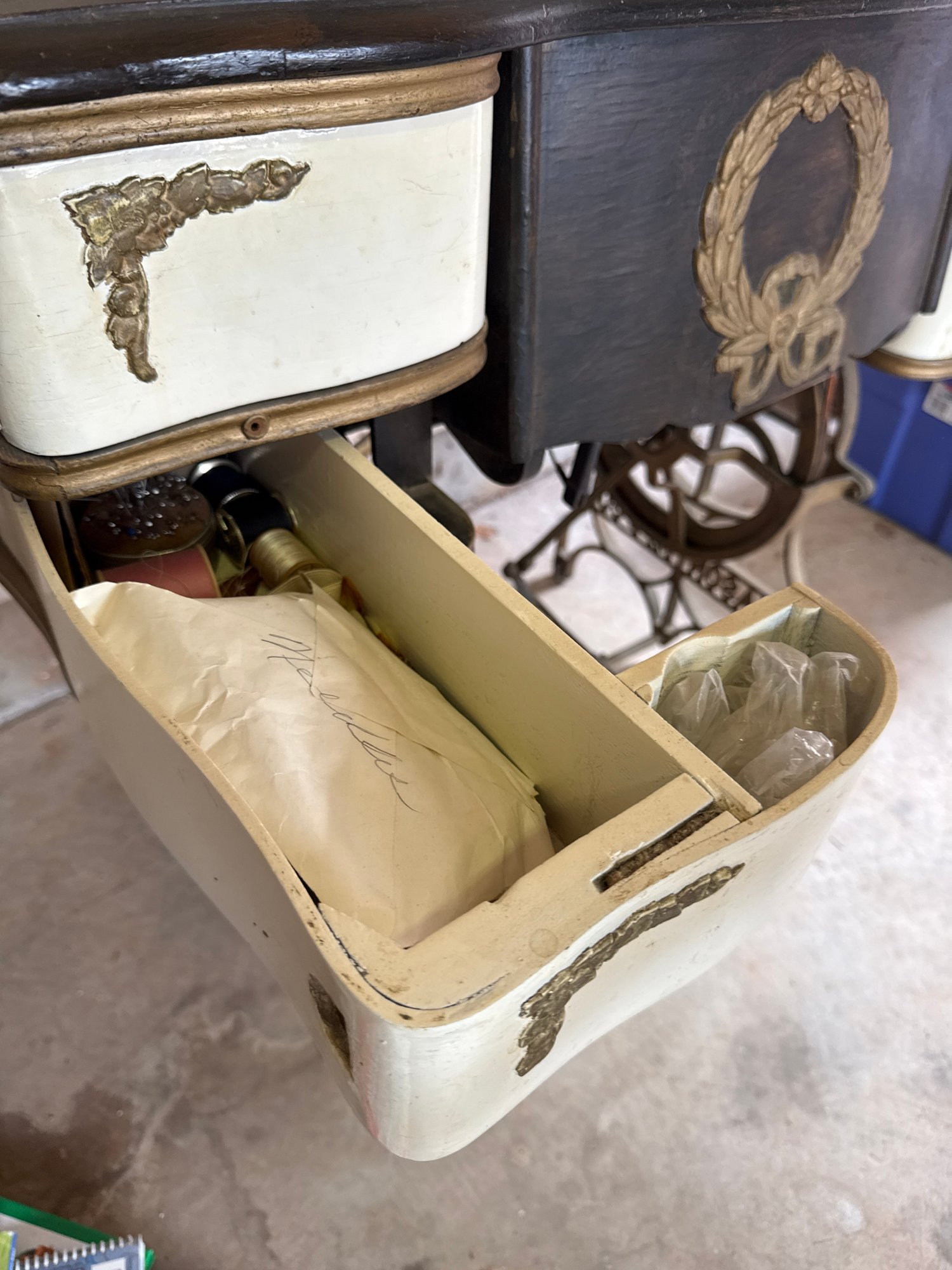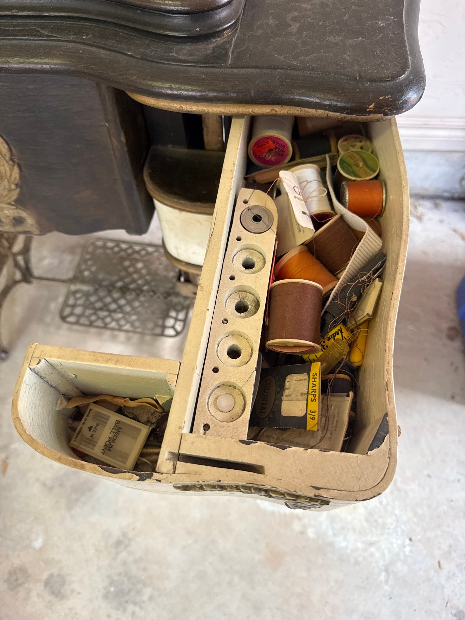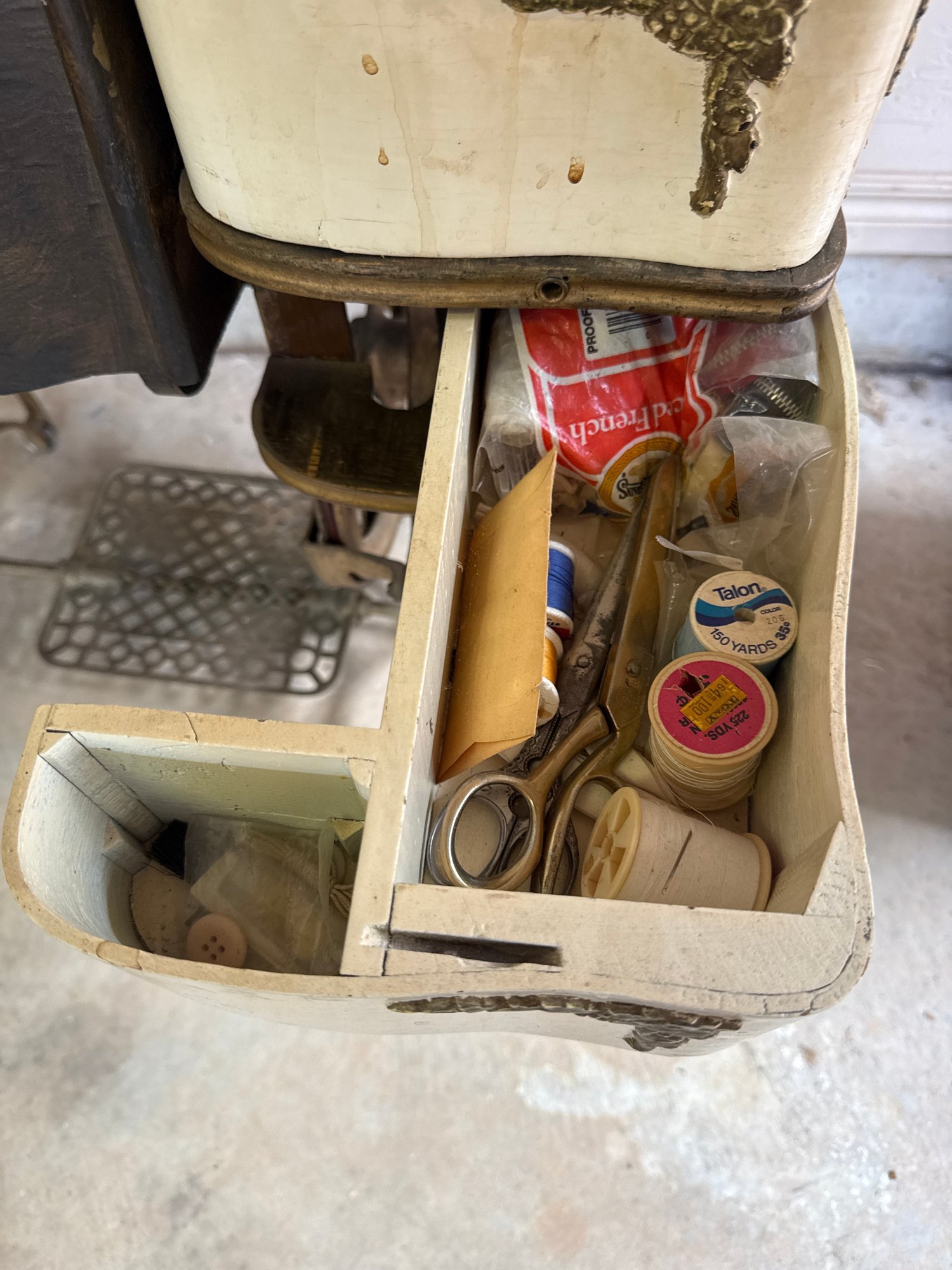 This lot contains an Antique A.G. Mason Rotary Treadle Sewing Machine a with white cabinet drawers. This is a very intact mason sewing machine. It is Untested! Please be prepared for pickup. Local Pickup Only.