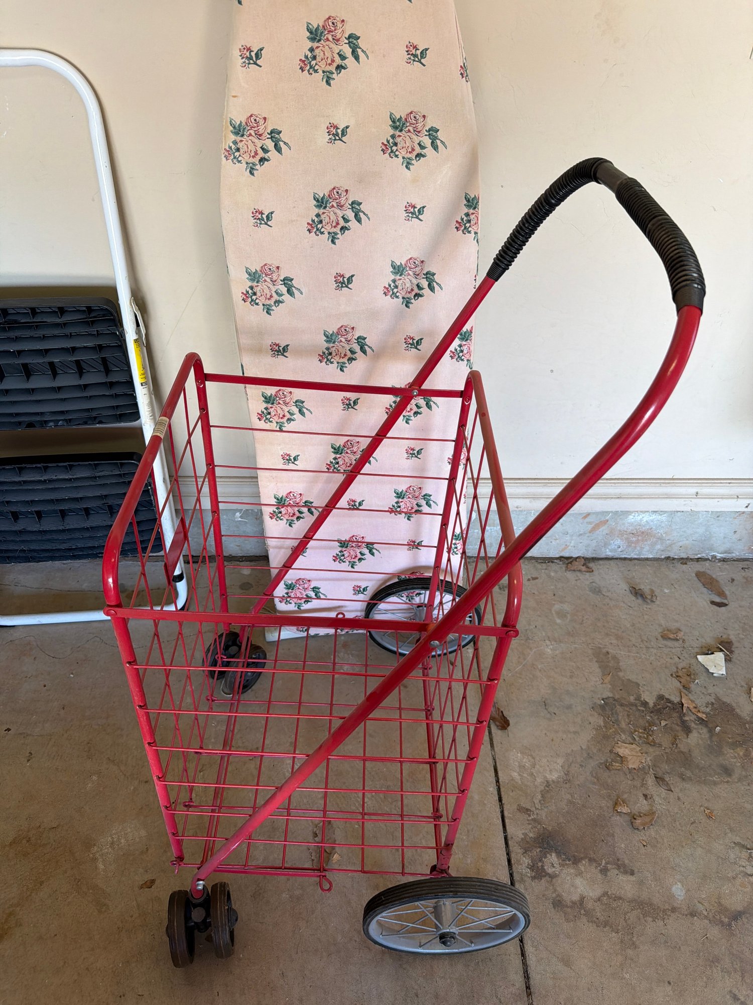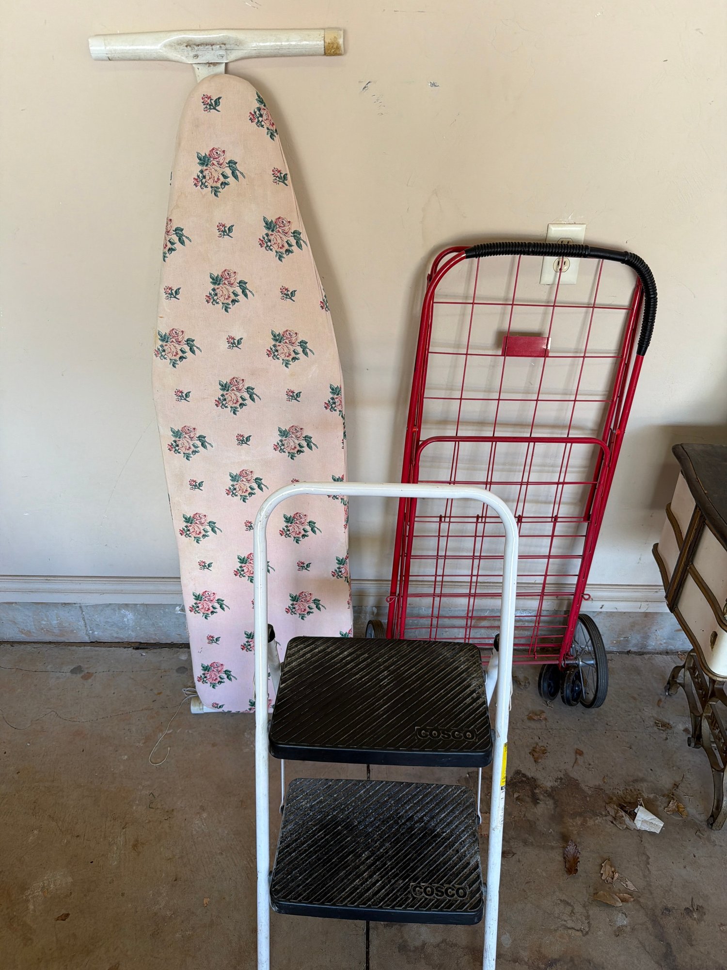 This listing features one ironing board, one travel basket, and one medium stepping stool/ ladder. Minor dusting suggested overall good condition see photos! Local pickup only.