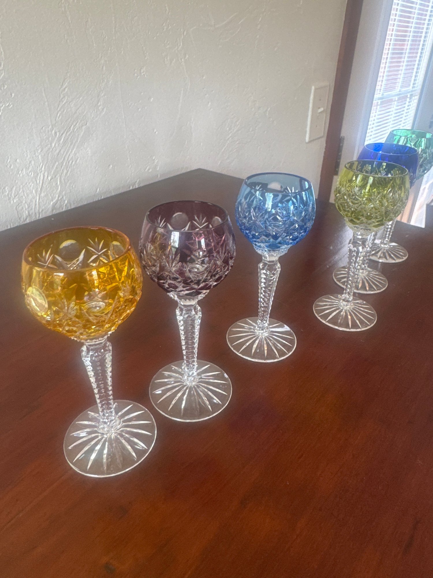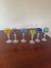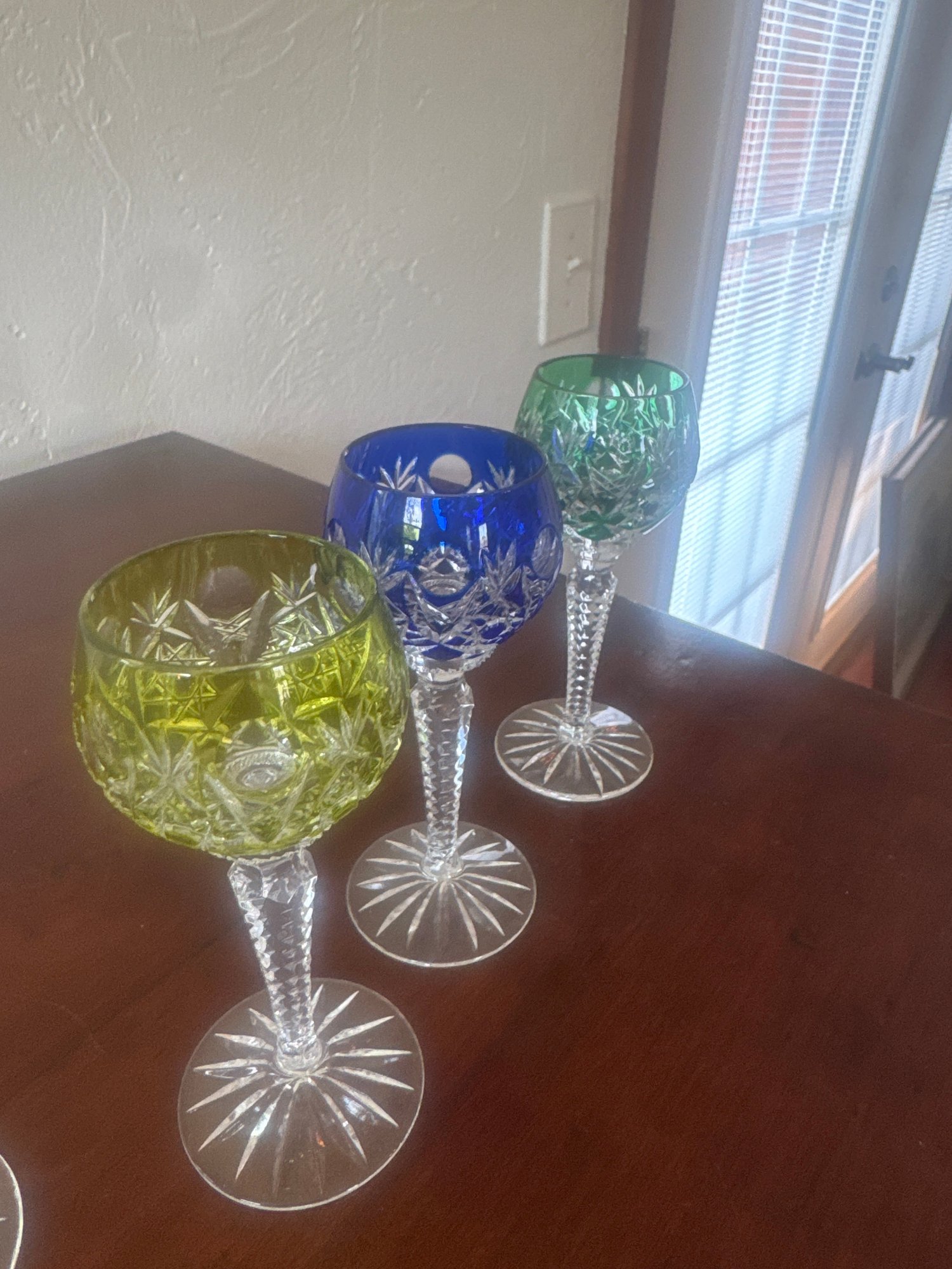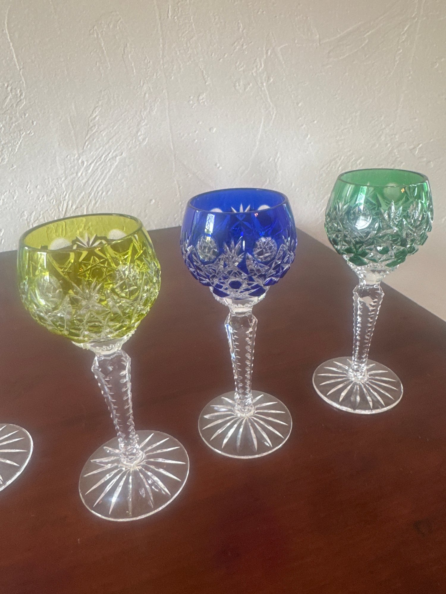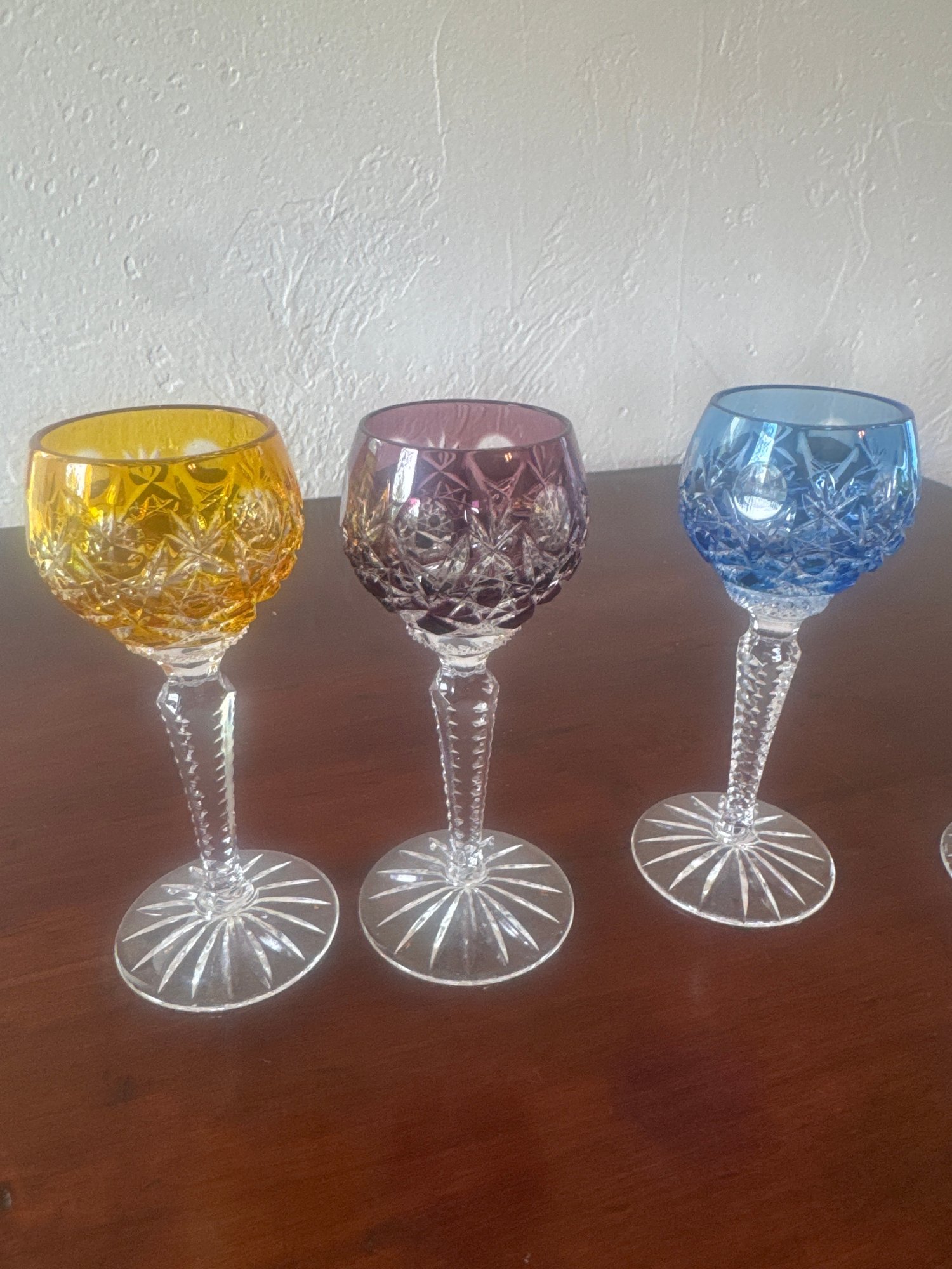 They feature colorful, hand-cut crystal bowls with intricate patterns and faceted, clear stems. No chips. Local pickup or courier shipping available – please see shipping terms for details.