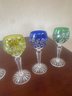 These vintage 4.5” tall glasses are likely Bohemian crystal wine hocks or liqueur cordial glasses from the early-to-mid 20th century.