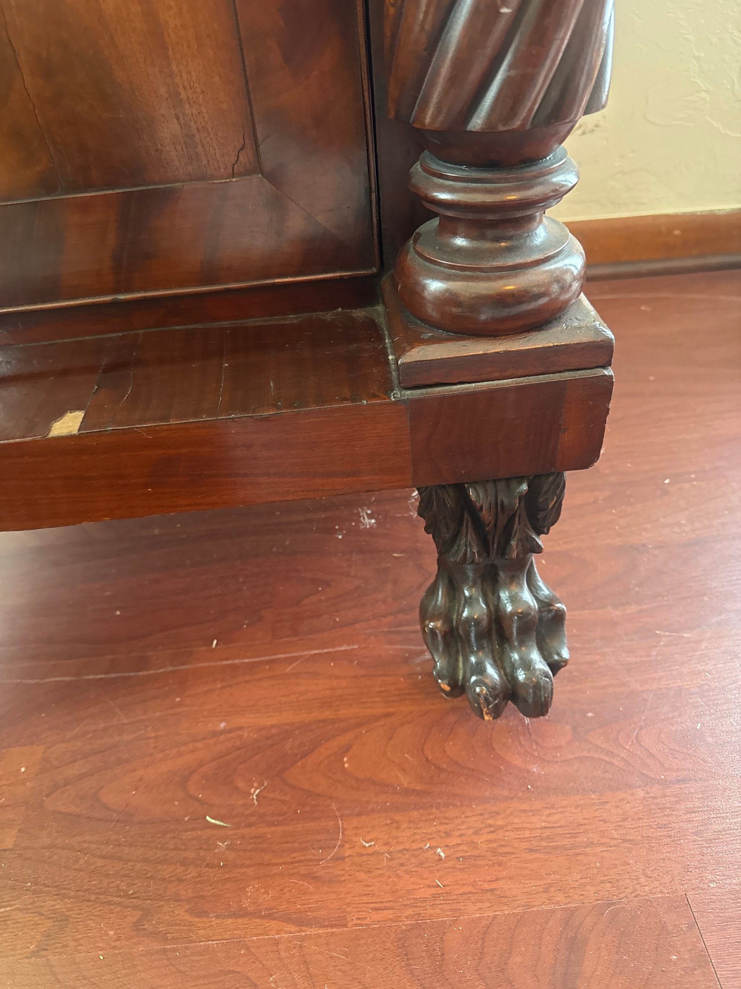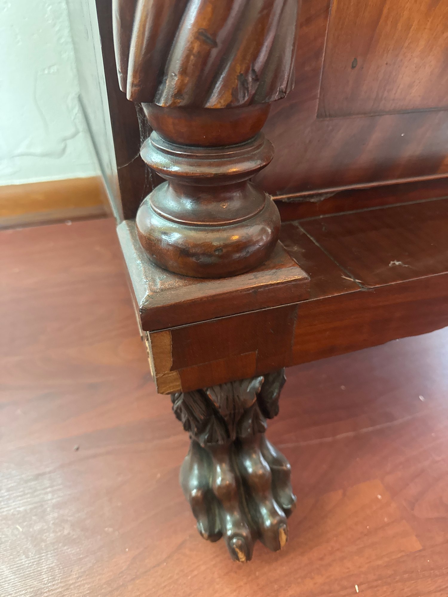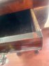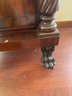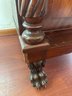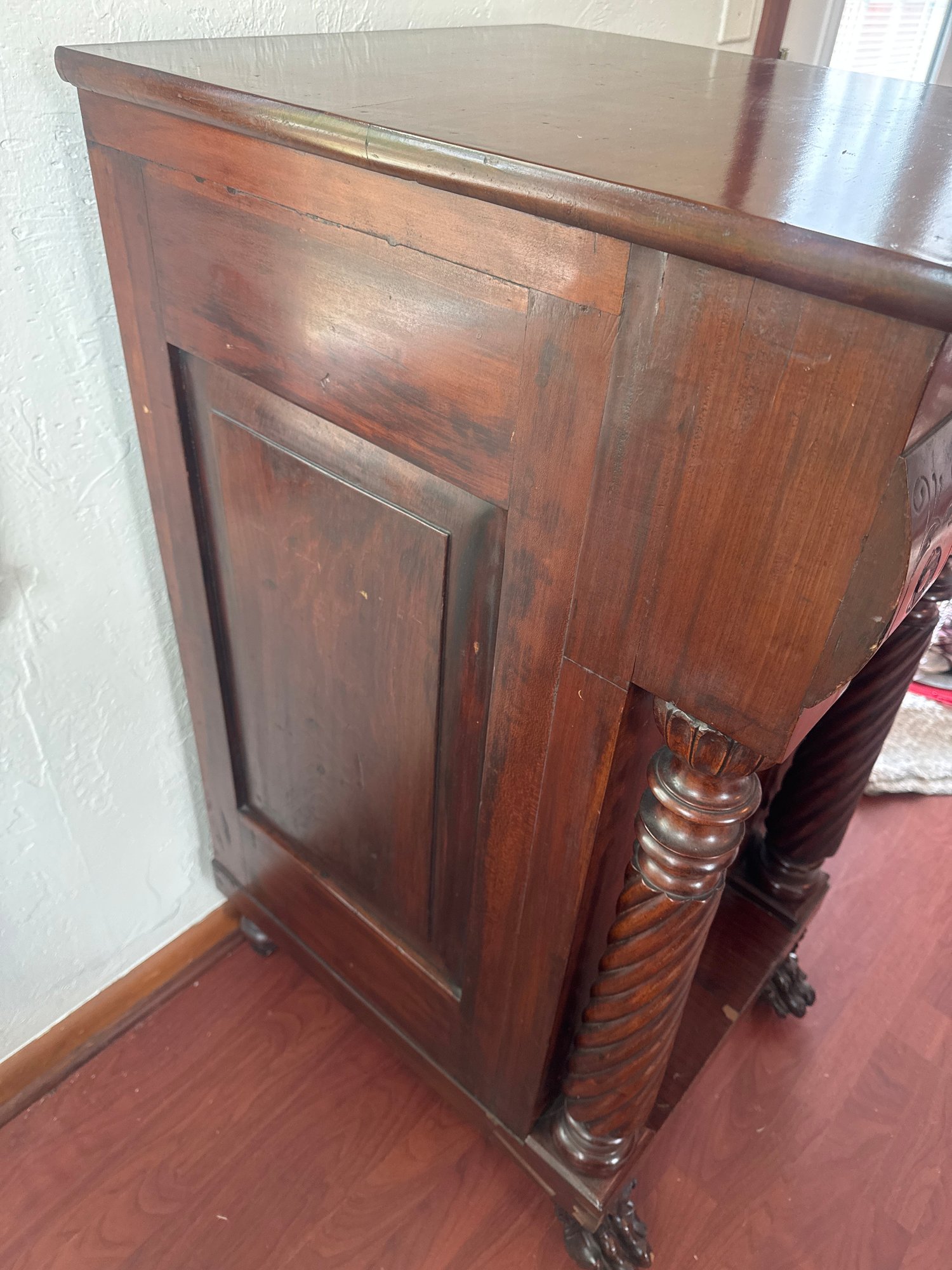 This antique piece is an Empire style mahogany bedside nightstand featuring a single drawer, spiral turned columns, and carved claw feet. Some condition issues - see pics. Very sturdy. Local pickup only.