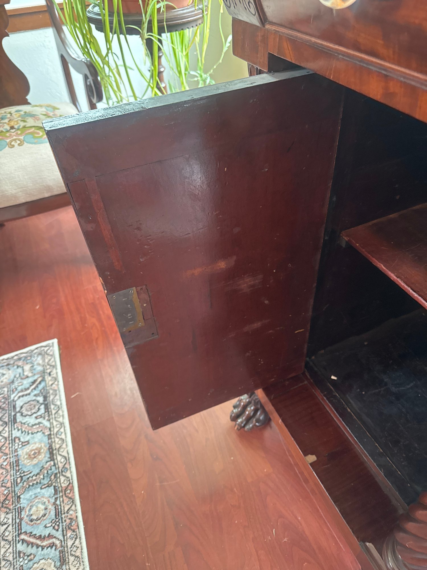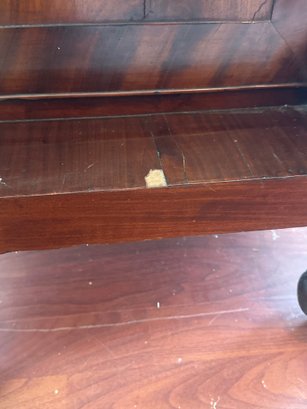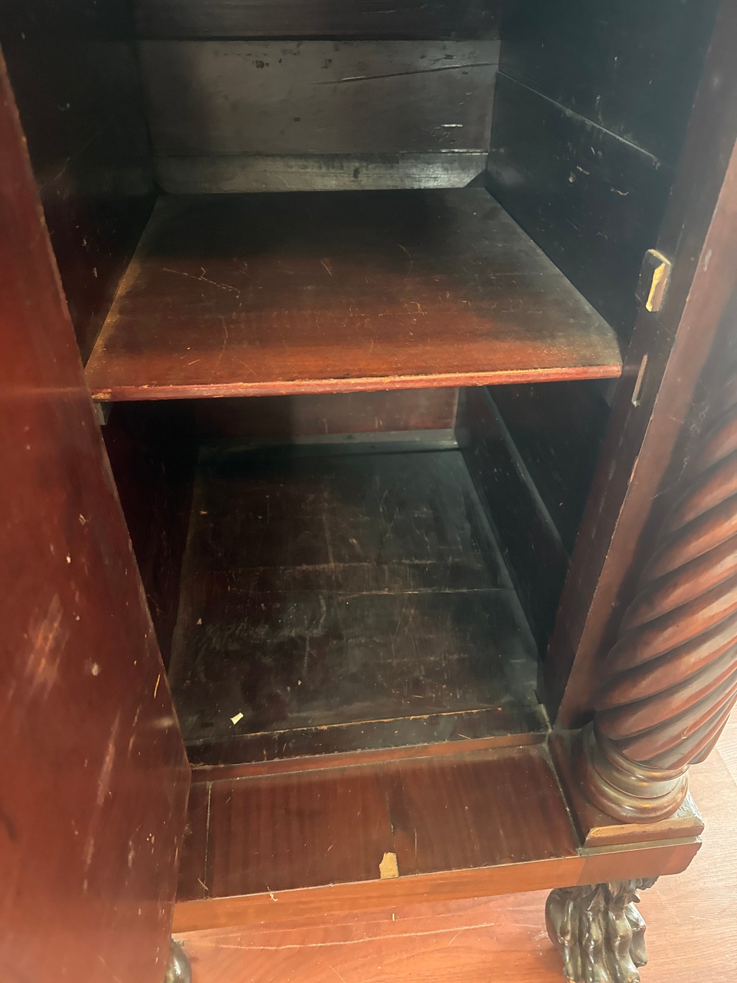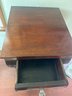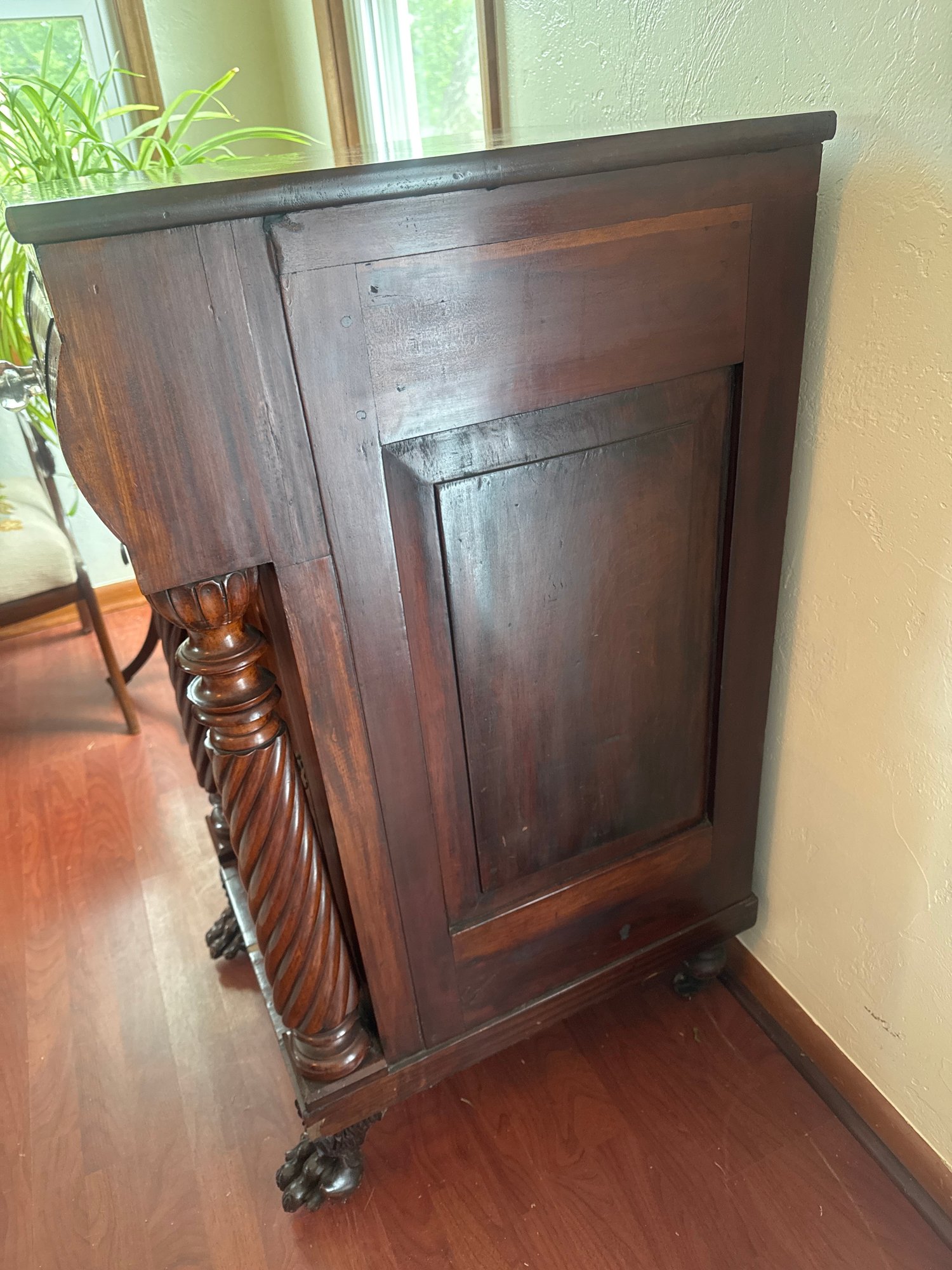 This antique piece is an Empire style mahogany bedside nightstand featuring a single drawer, spiral turned columns, and carved claw feet. Some condition issues - see pics. Very sturdy. Local pickup only.