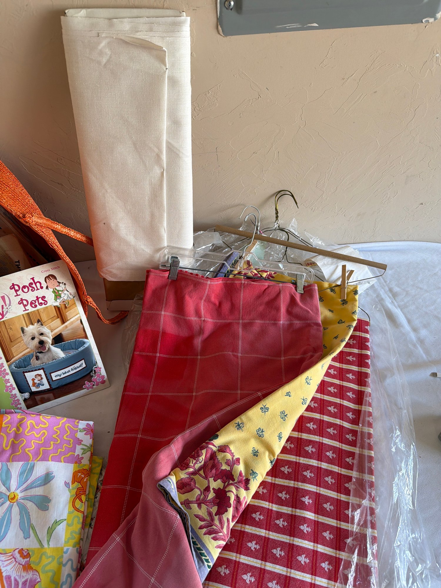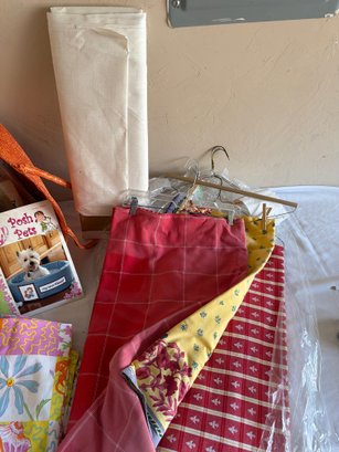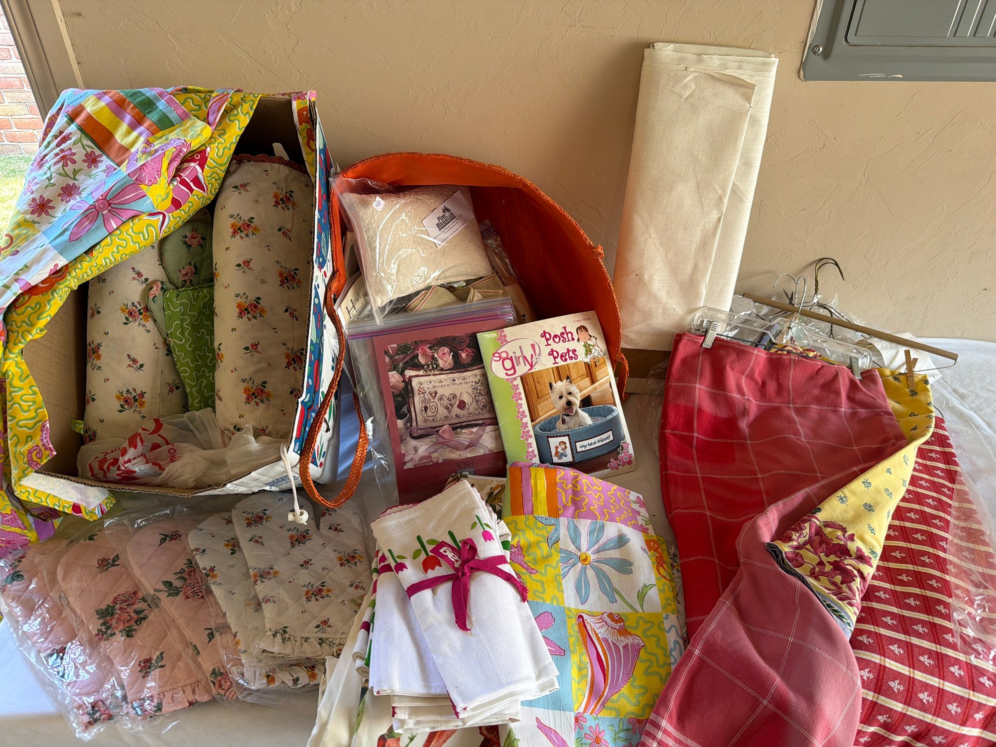Large assortment of Fabrics, for knitting or sewing. There are also oven mitts and aprons. Good condition see photos! Local Pickup Only.