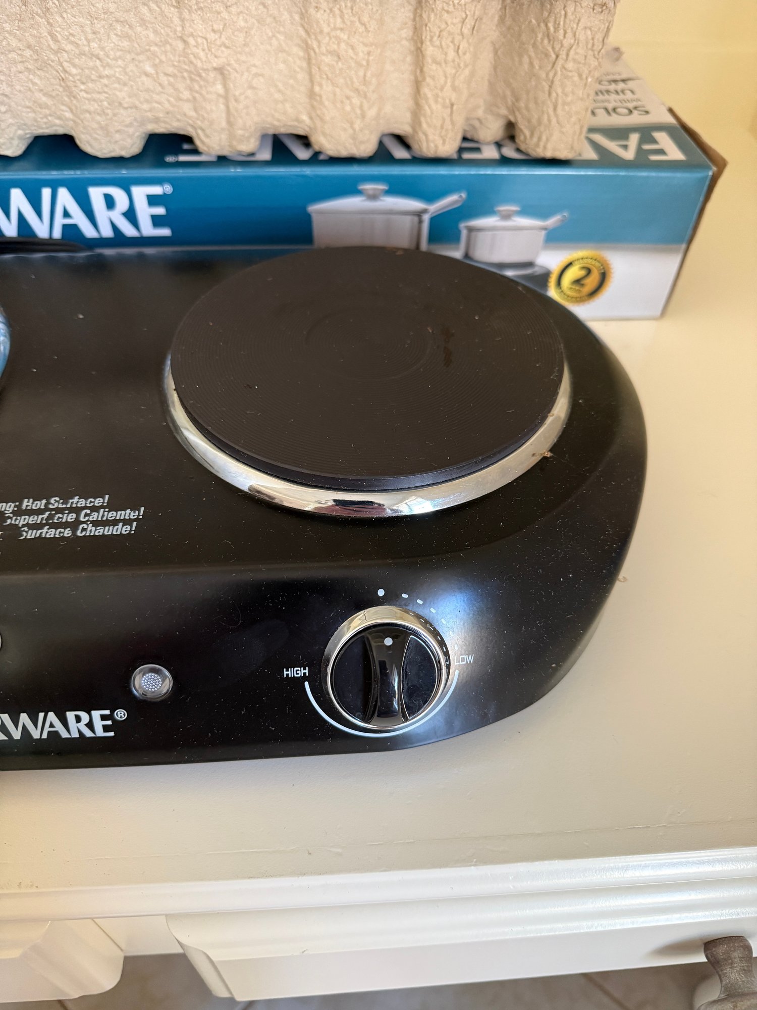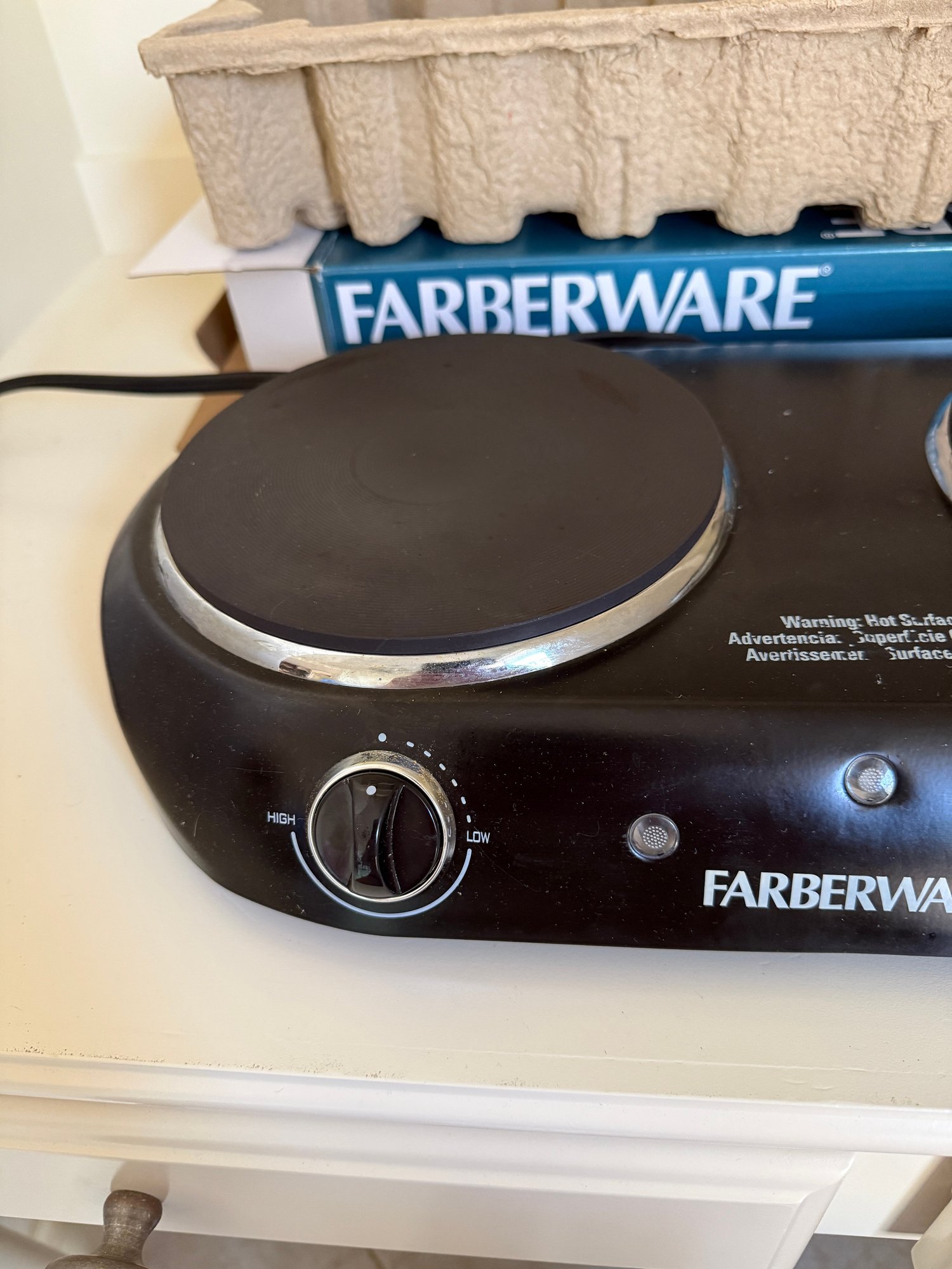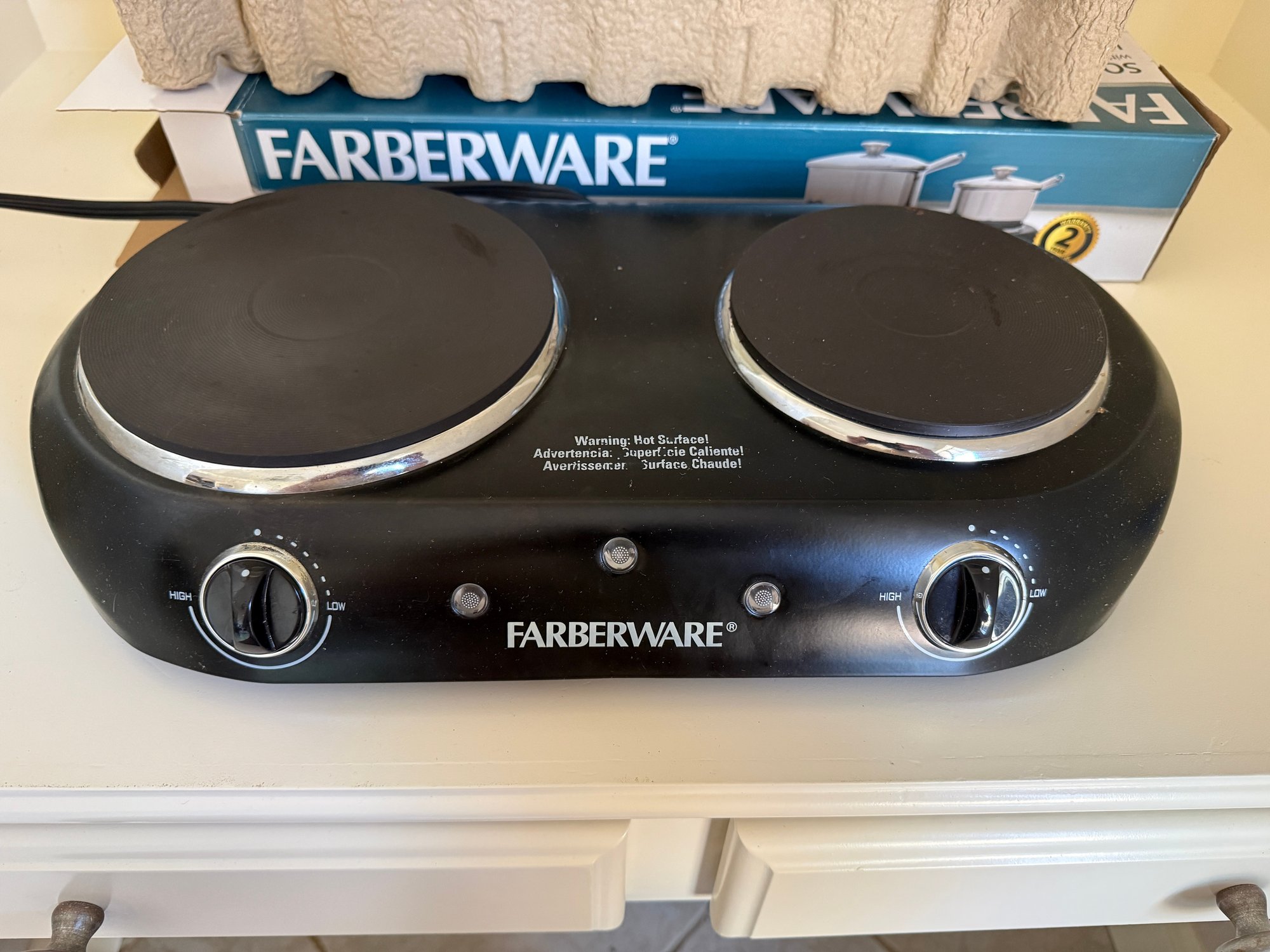 A Farberware double burner electric stove. Untested, in excellent physical condition.