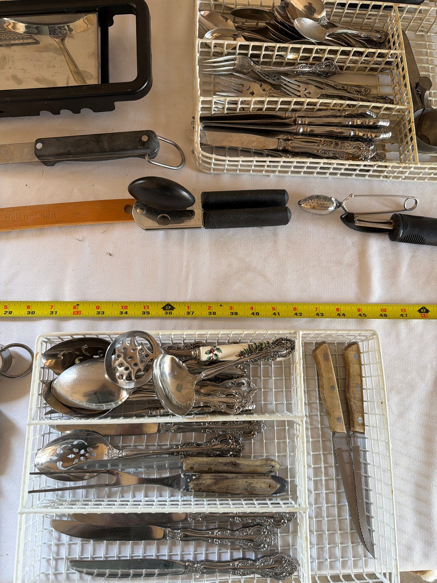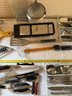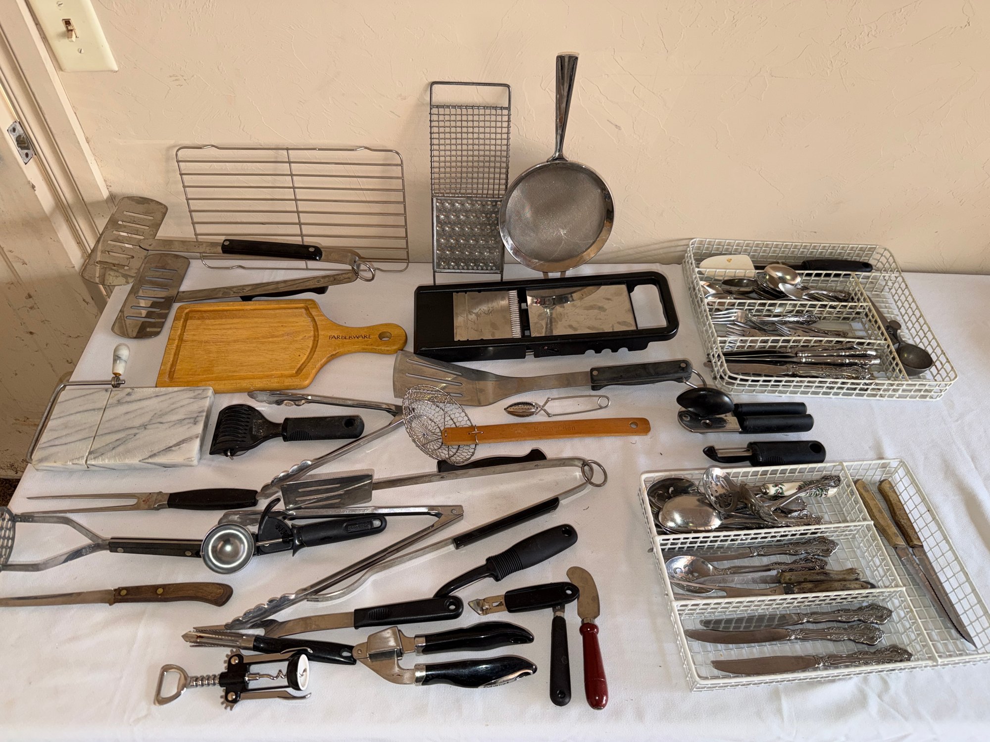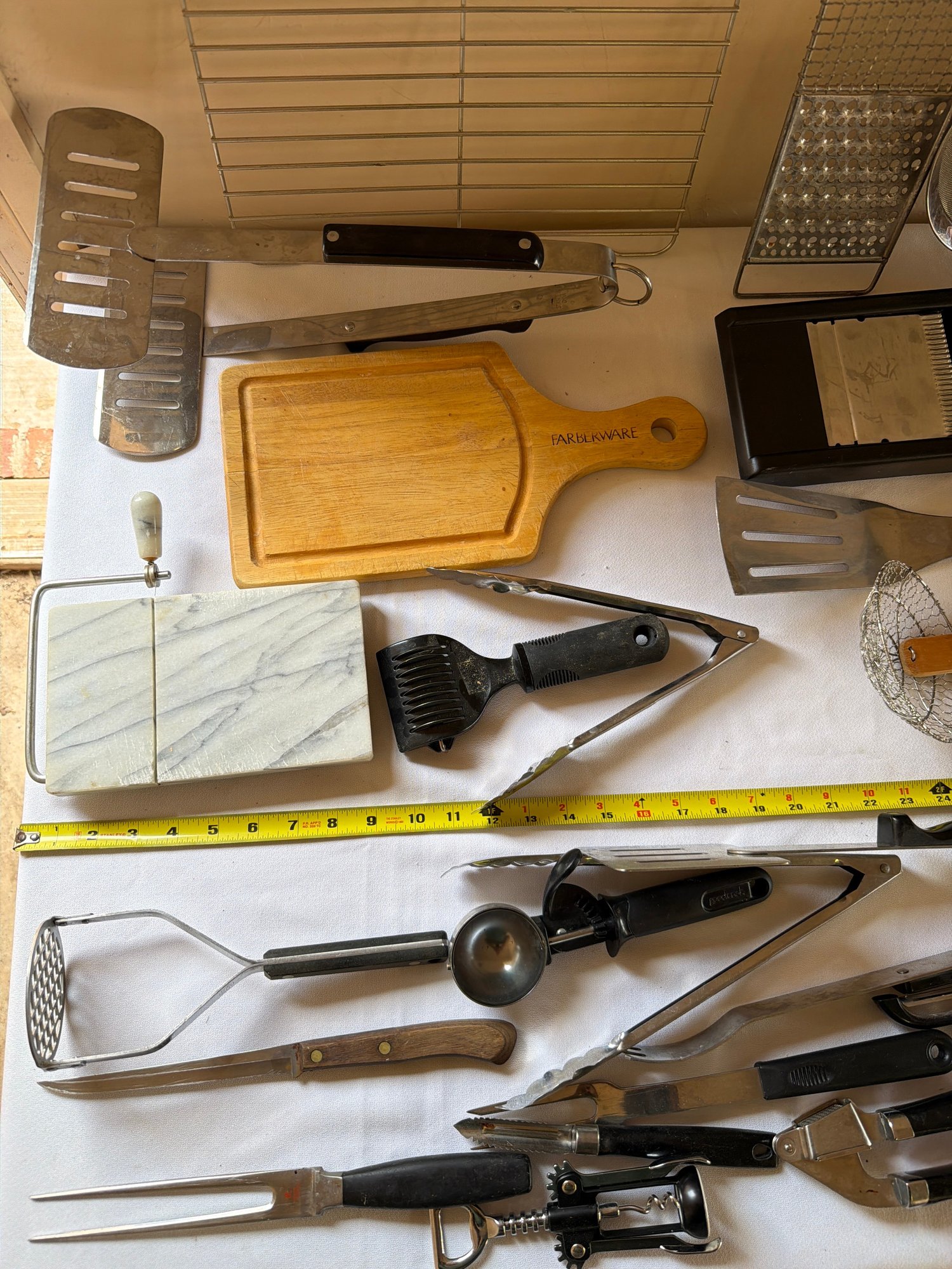 Arrangement of kitchen and grilling utensils. Including but not limited to cutlery, kitchen appliances, and even grilling utensils. Good condition see photos! Local Pickup Only.