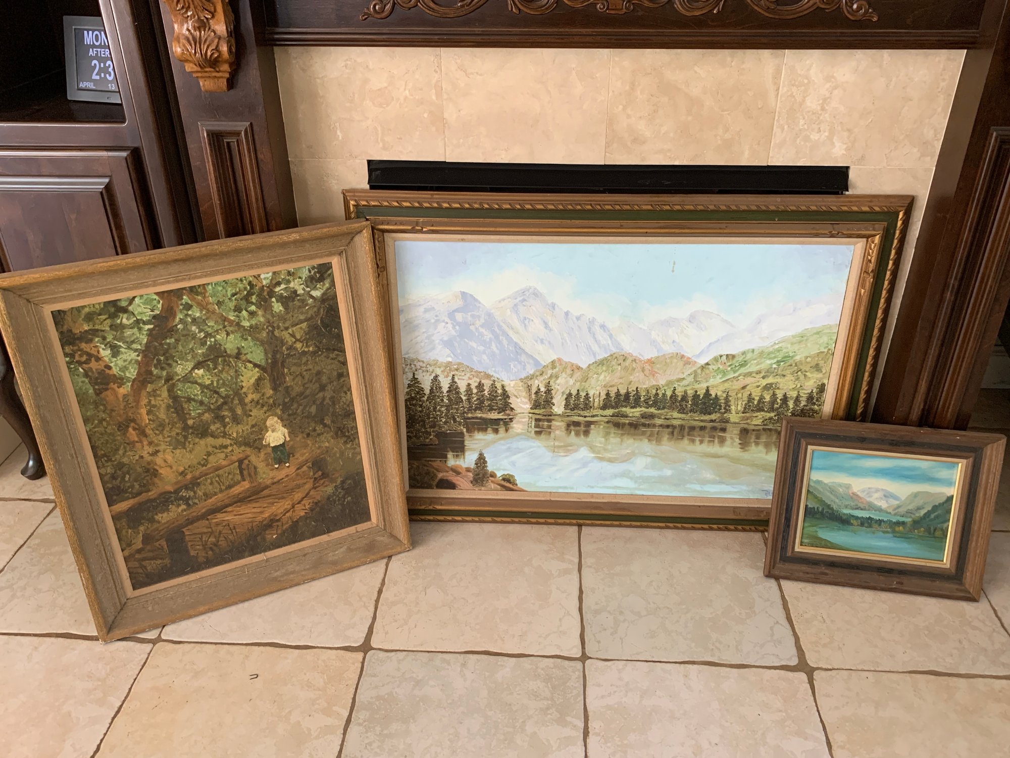 Three framed paintings in different sizes. See photos for more details and dimensions! Local Pickup Only.