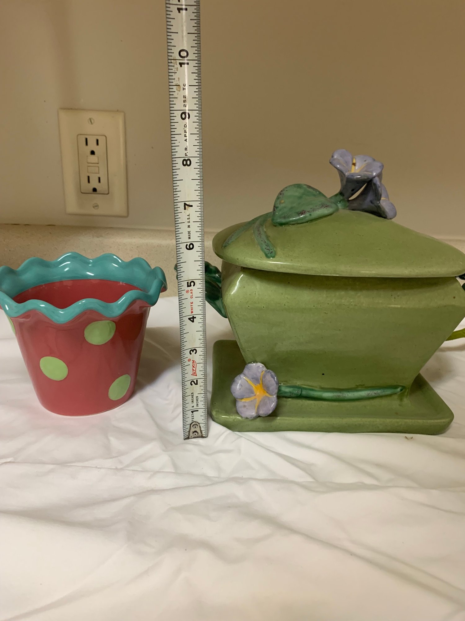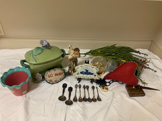 An assortment of home decor - plant pot, snow globe, spoons (larger spoons are silver plate) and more! Local Pickup Only.