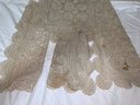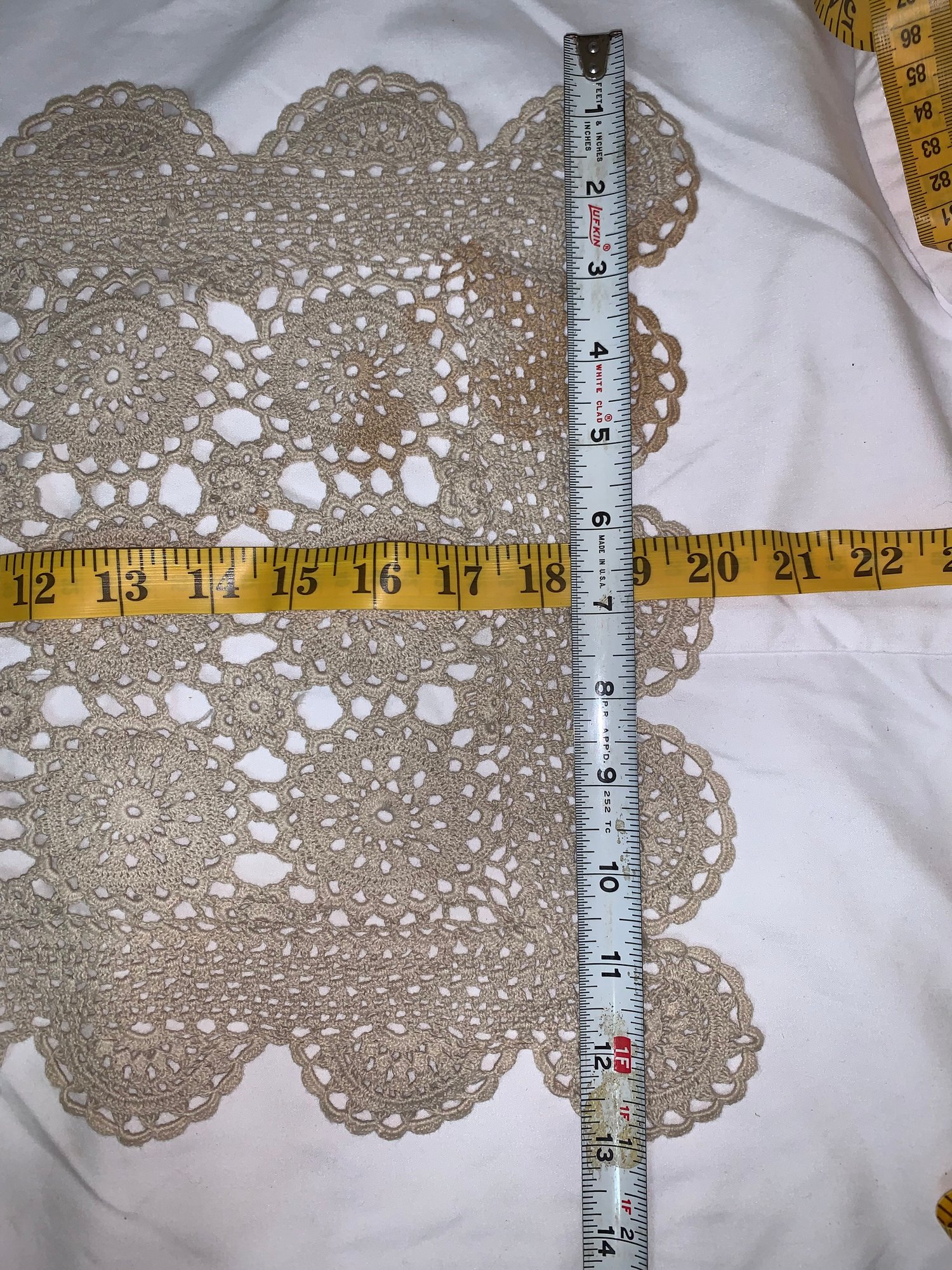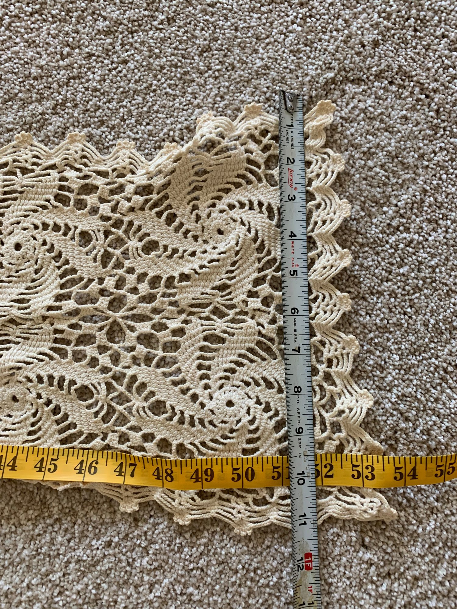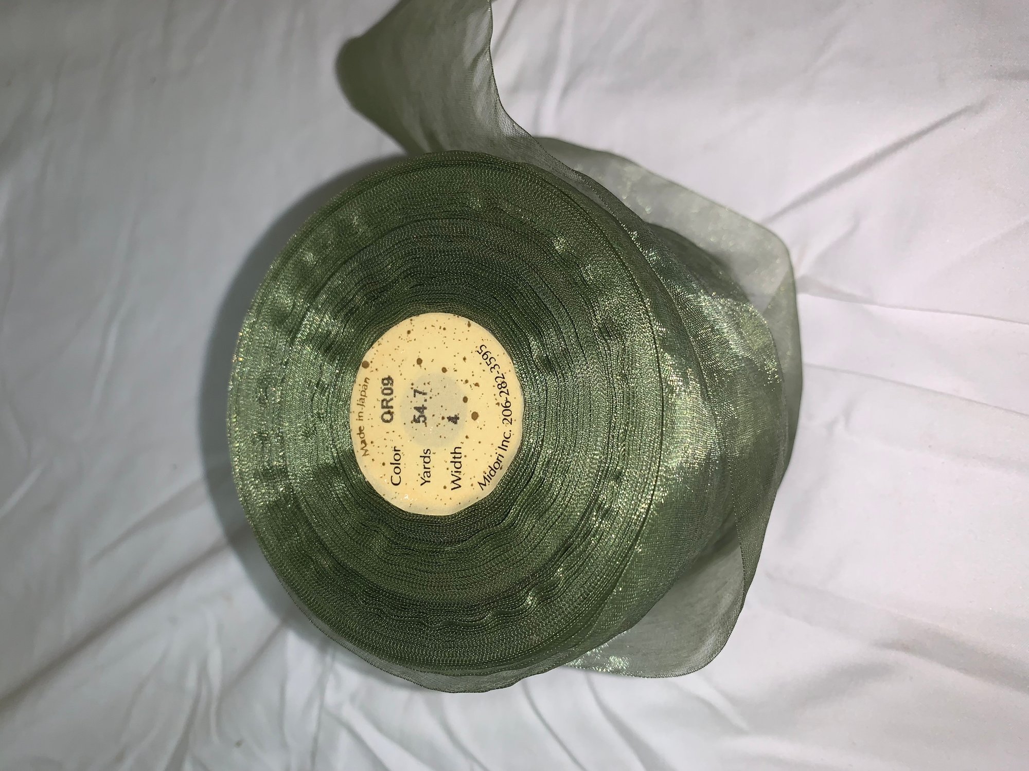An assortment of place mats and tablecloths. A roll of ribbon and pieces of sheer fabric. Some items are stained and will be shown in photos. Sizes shown in photos.