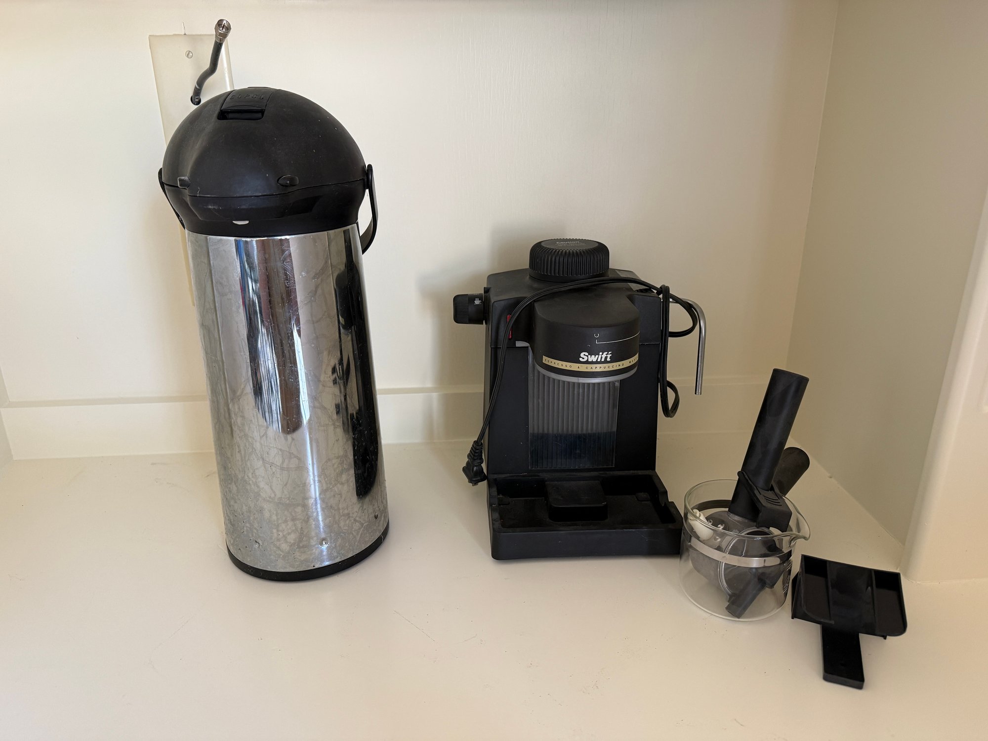 A Swift espresso maker and a large pitcher. Untested, in excellent physical condition. See photos for details.