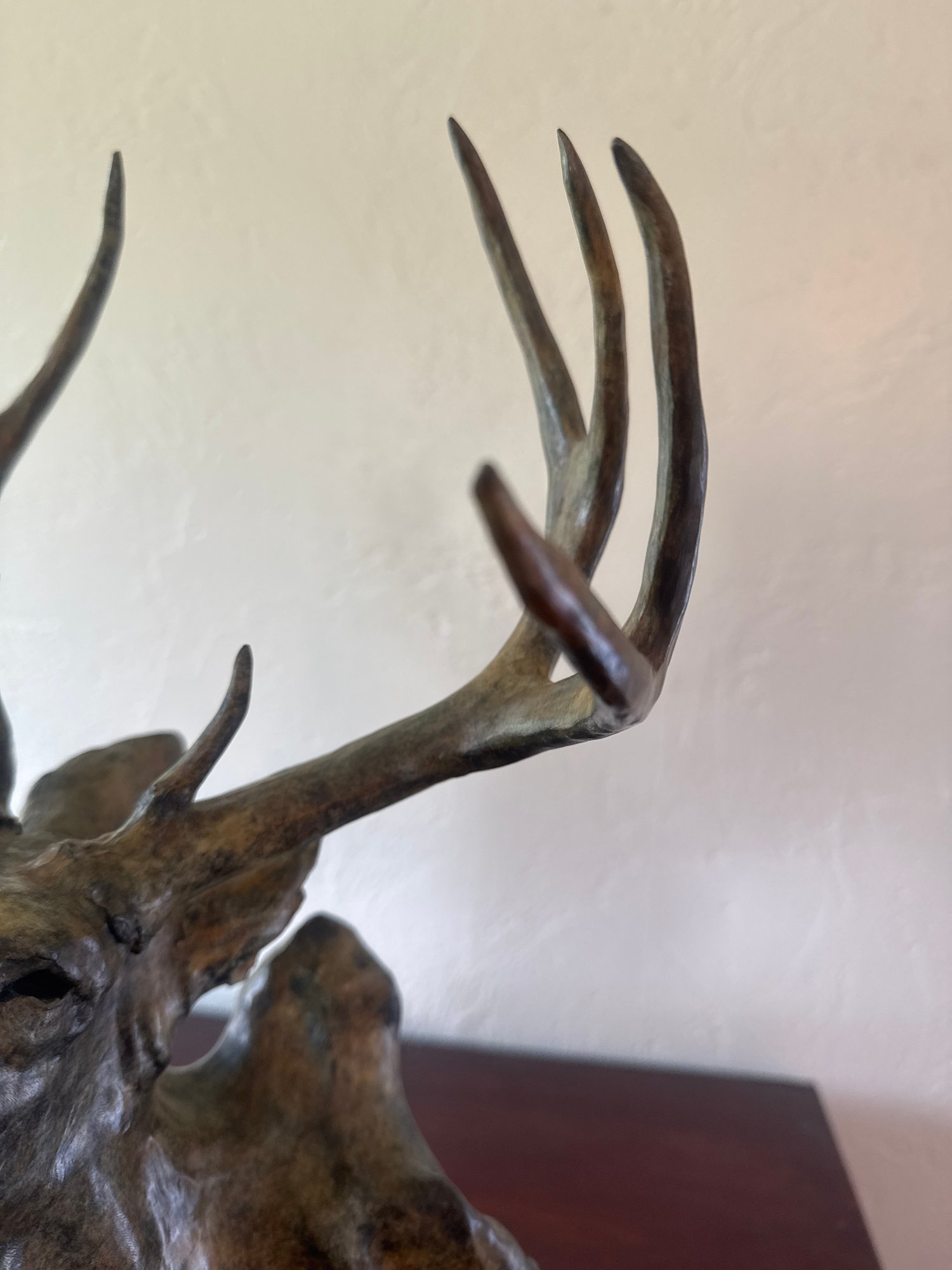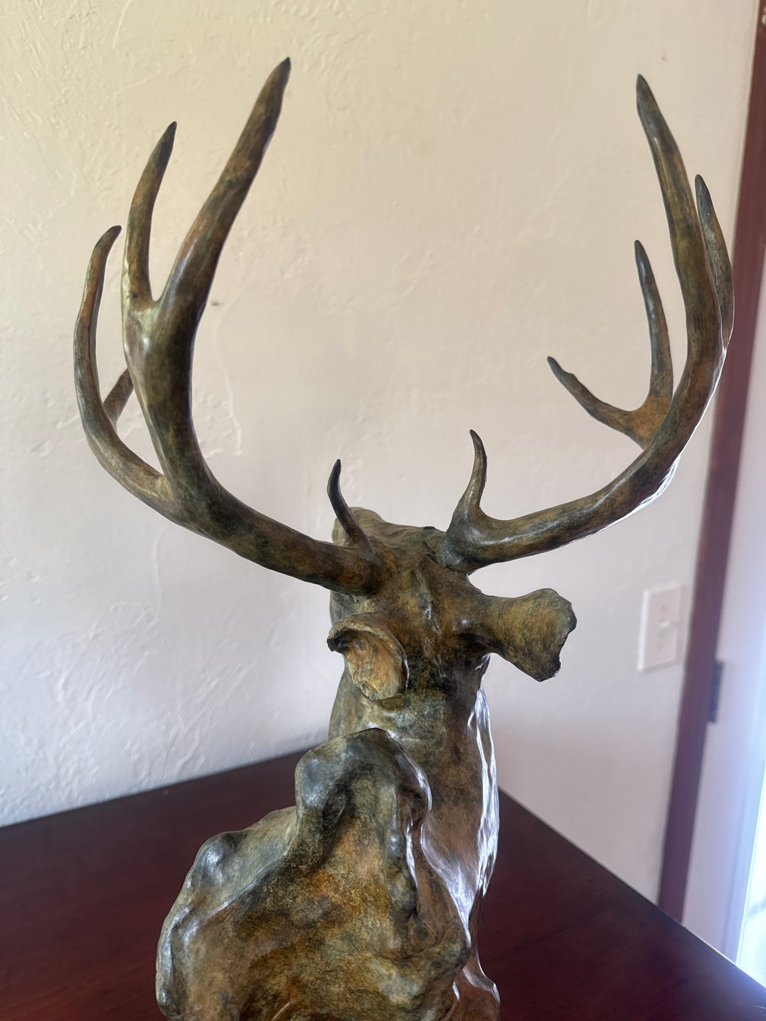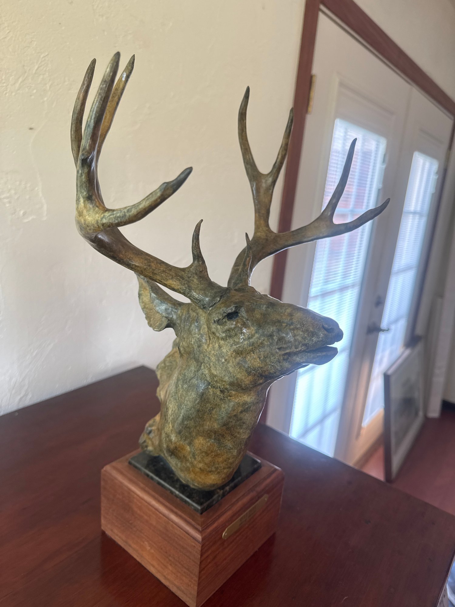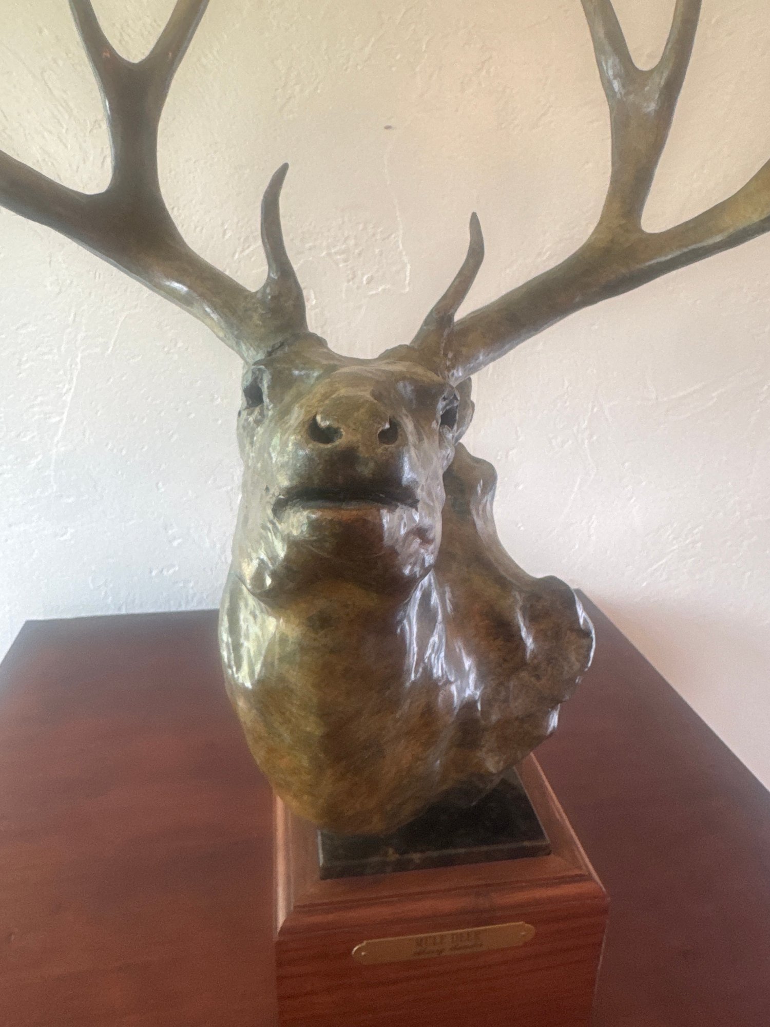This item is a bronze sculpture of an elk bust created by artist Sherry Salari Sander, specifically identified as a cast from an edition of 35. 28/35. The sculpture is mounted on a wooden base. Local pickup or courier shipping available – please see shipping terms for details.